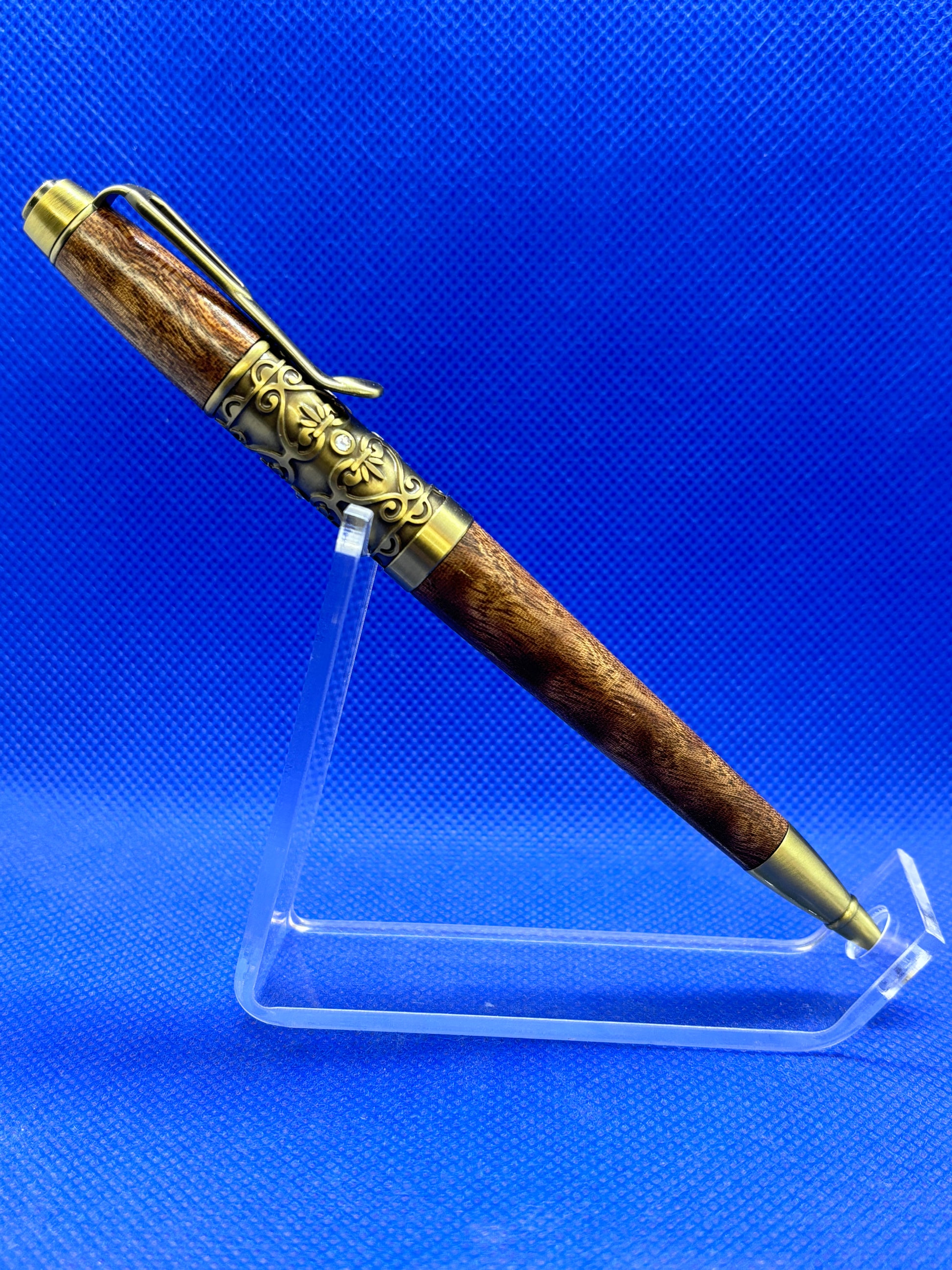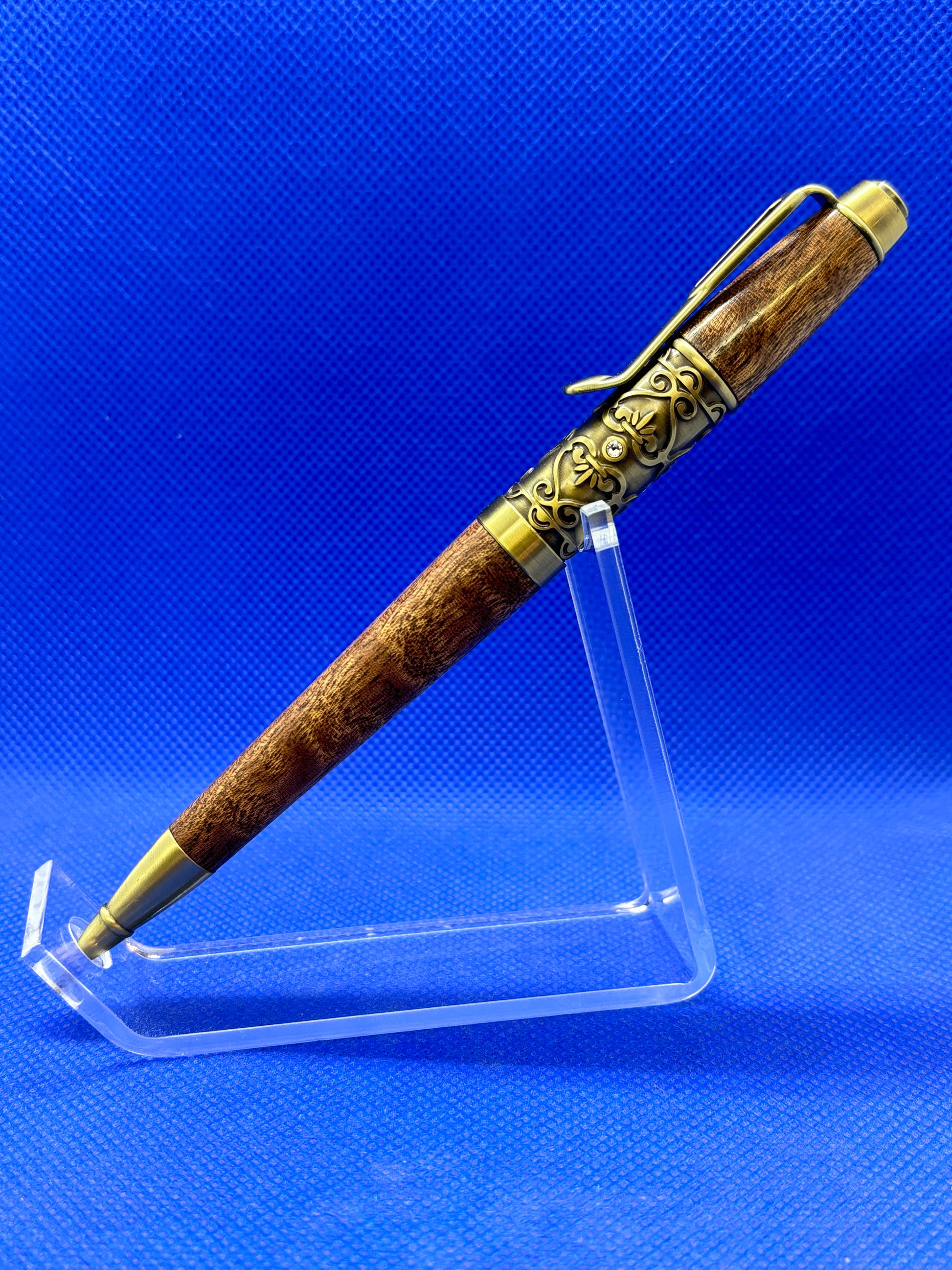 This Fillibelle ballpoint pen features a beautifully figured Pomelle Sapele wood body and antique brass metalwork. This metalwork is decorated with an ornate filigree design that is embellished with three inlaid Swarovski crystals. This pen is a stunning art piece that you will cherish for years. This pen uses "Cross" style refills.