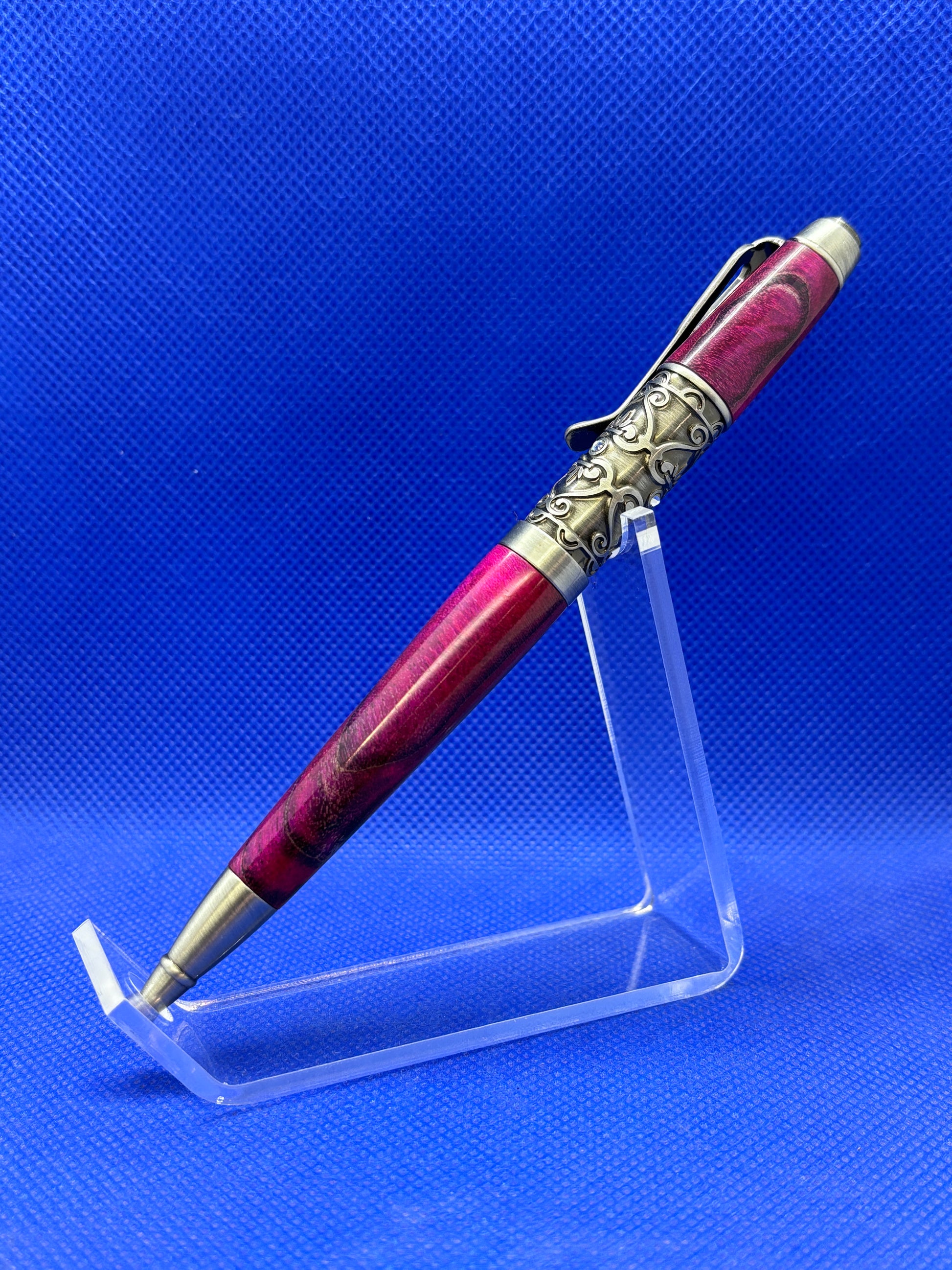 This Fillibelle ballpoint pen features a double dyed "Cranberry" maple body and antique pewter metalwork. This metalwork is decorated with an ornate filigree design that is embellished with three inlaid Swarovski crystals. This pen is a stunning art piece that you will cherish for years. This pen uses "Cross" style refills.