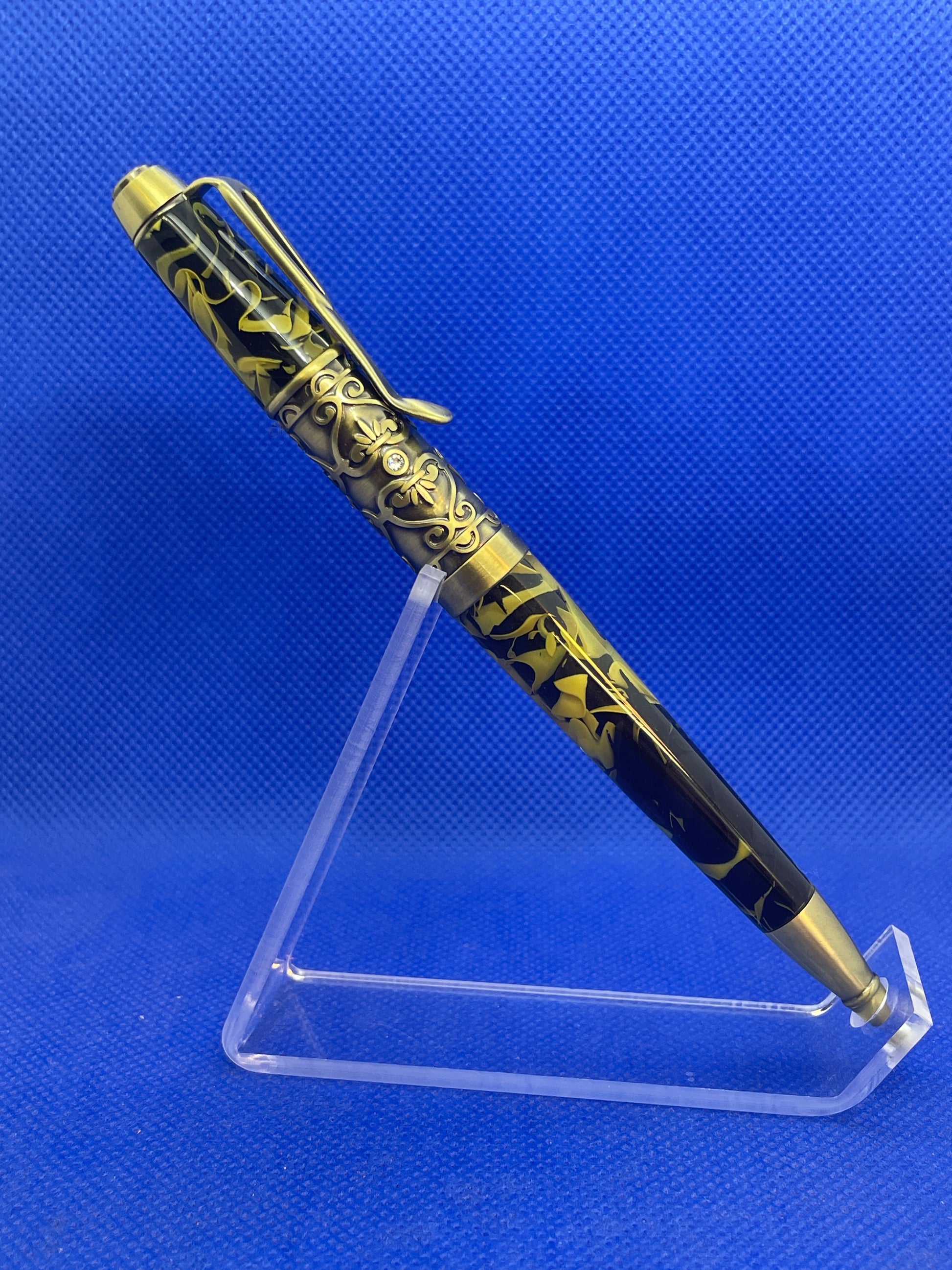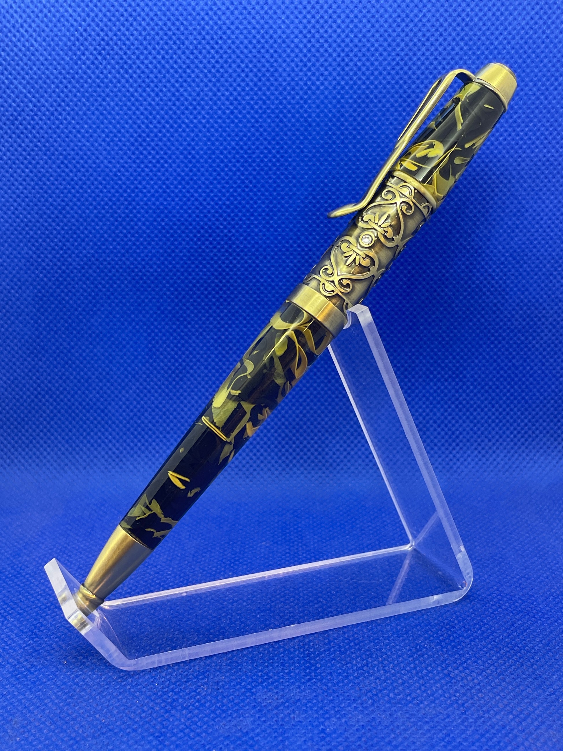 This Fillibelle ballpoint pen features a stunning yellow and black "Angel Fish" resin body. The antique brass trim is decorated with an ornate filigree design that is embellished with three inlaid Swarovski crystals. This pen is a stunning art piece that you will cherish for years. This pen uses "Cross" style refills.