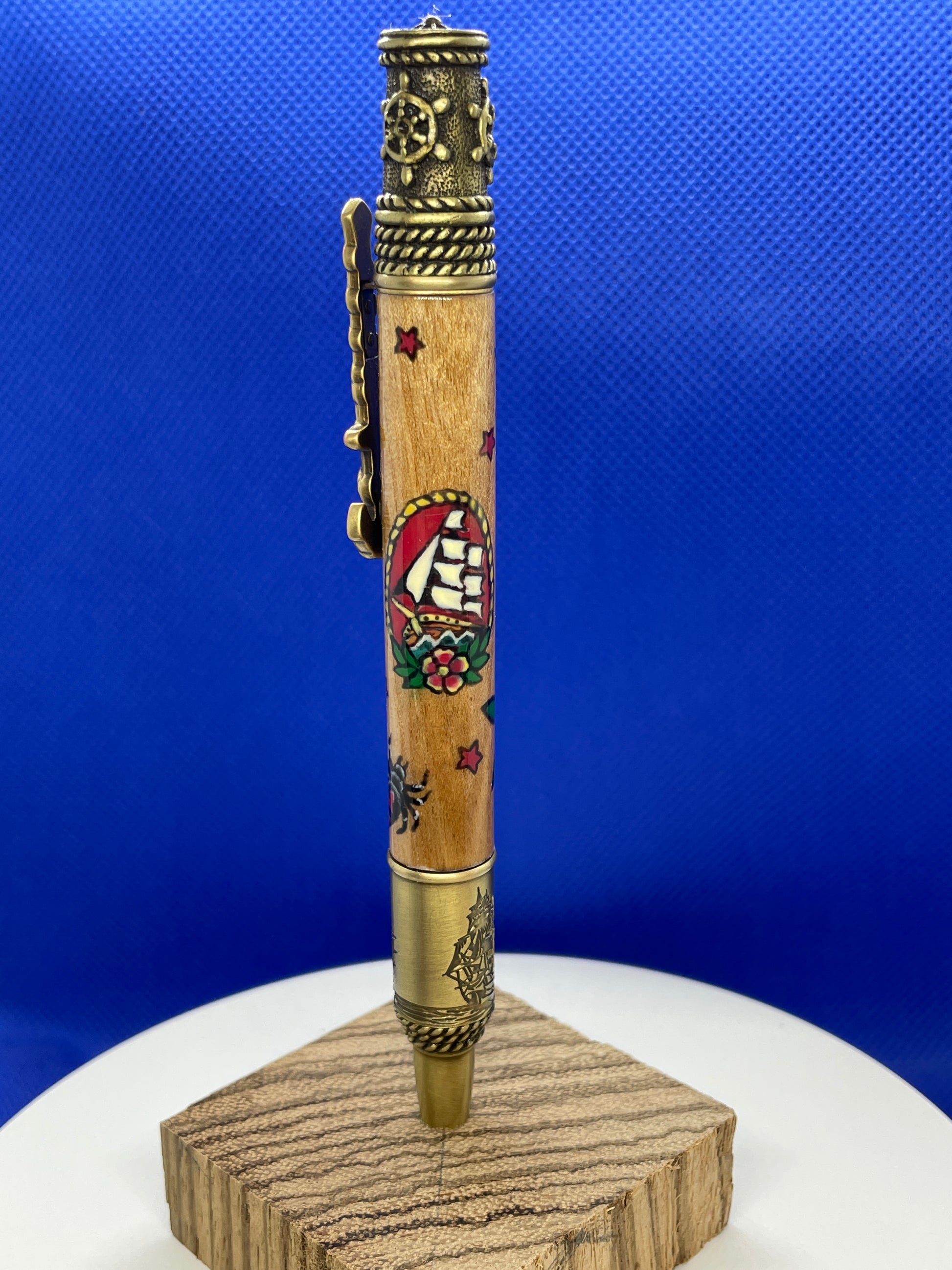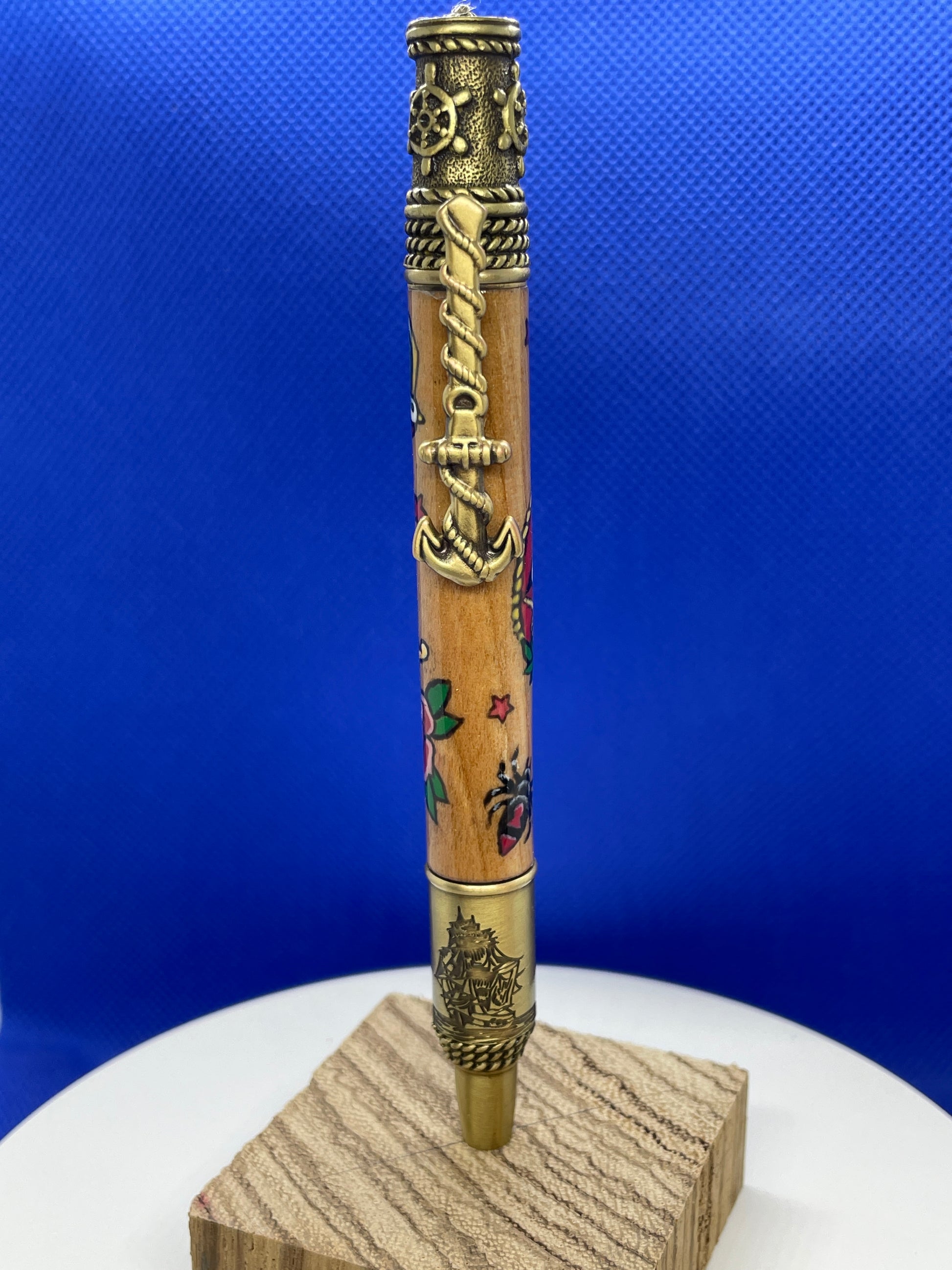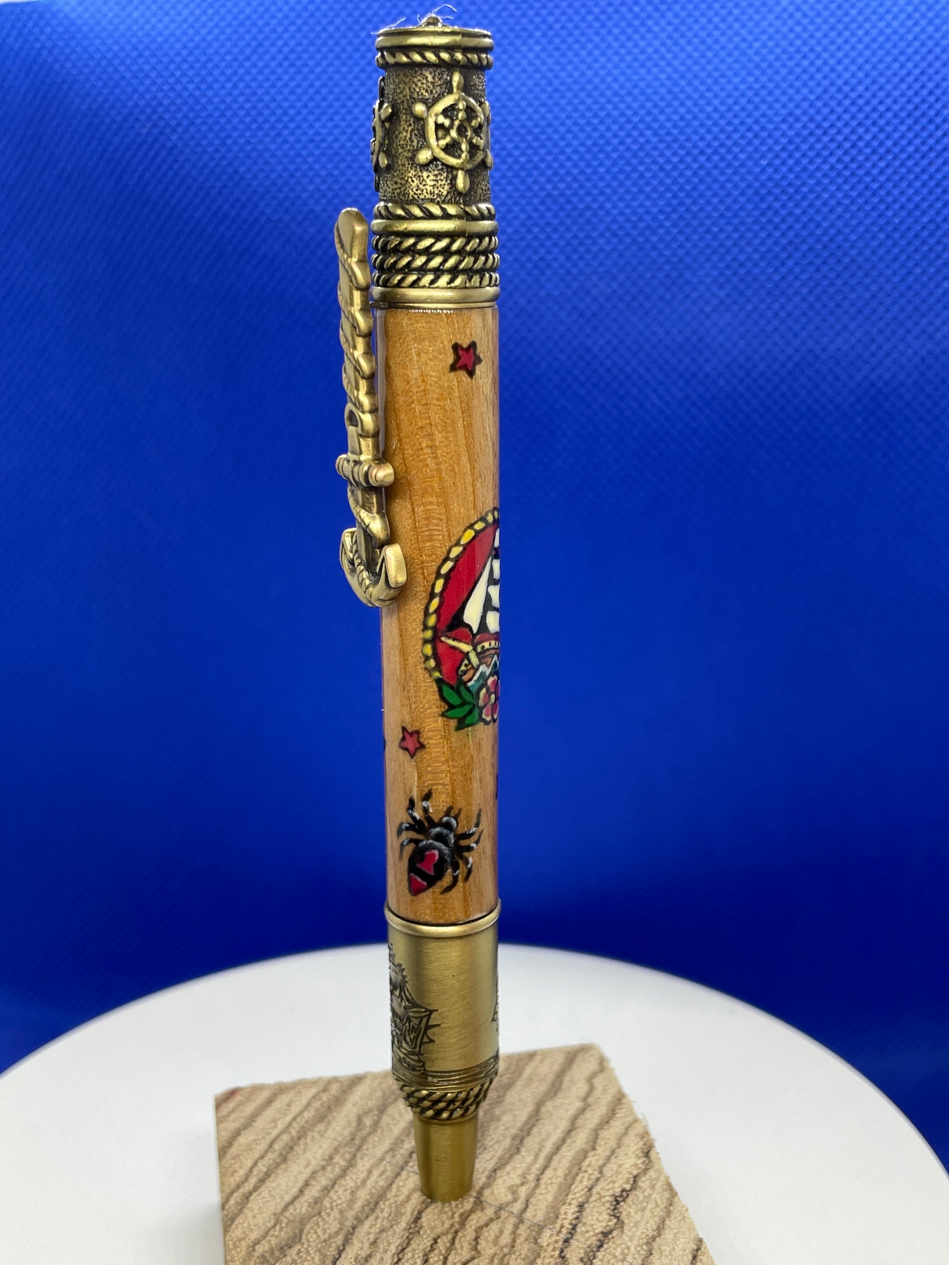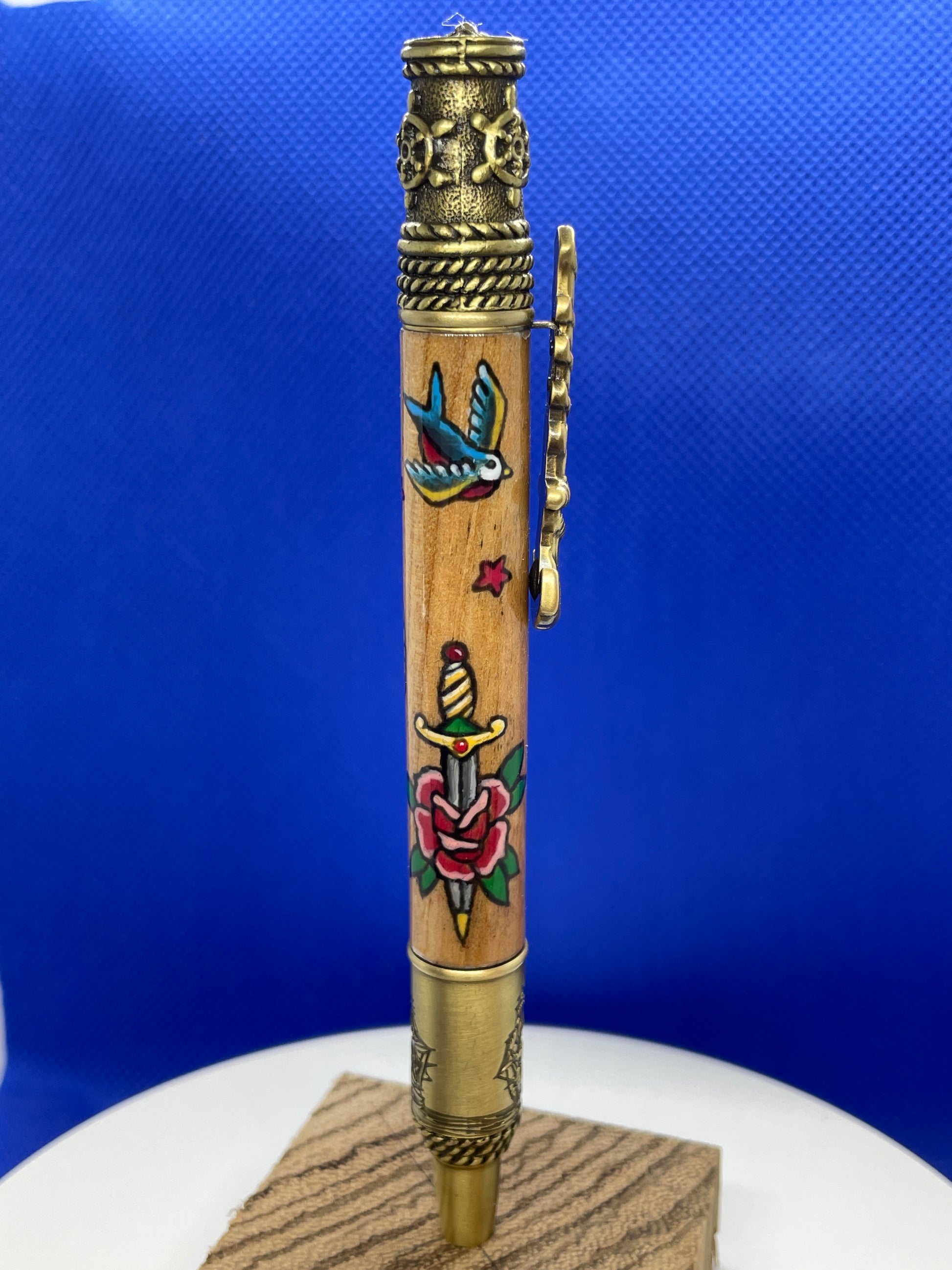Our in house artist Rachel hand painted these old style flash tattoo images on a nautical themed pen to create an amazing piece of art. These brilliant and colourful designs are full of intricate details that pay tribute this this art form. The pen has antique brass metalwork and the tattoos are painted on a maple body. This pen uses "Parker style refills.