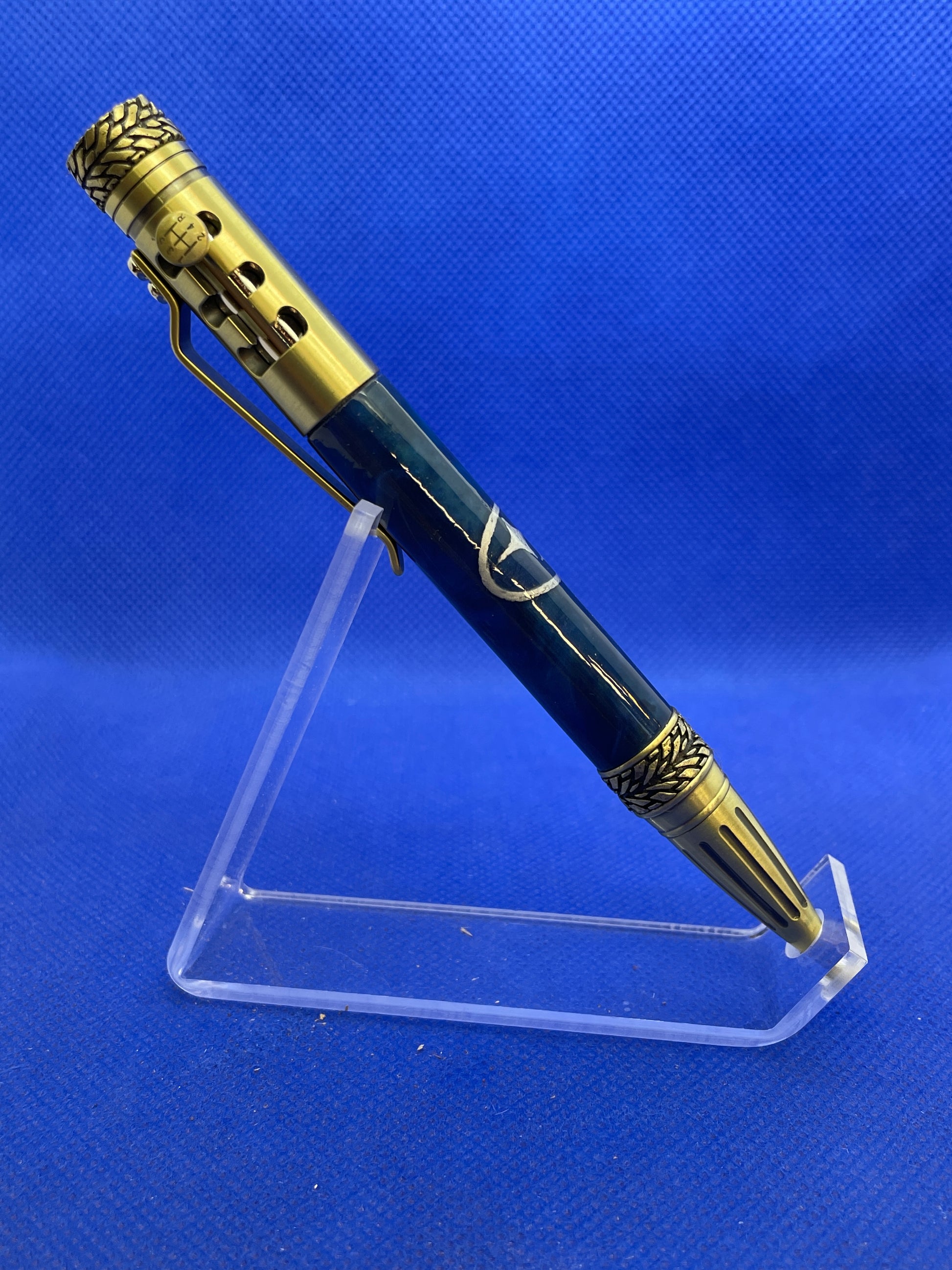 This customized, automotive themed pen features and hand-painted Subaru logo on a blue resin body with antique brass trim. The moveable gear lever is the actuator for the ballpoint mechanism.