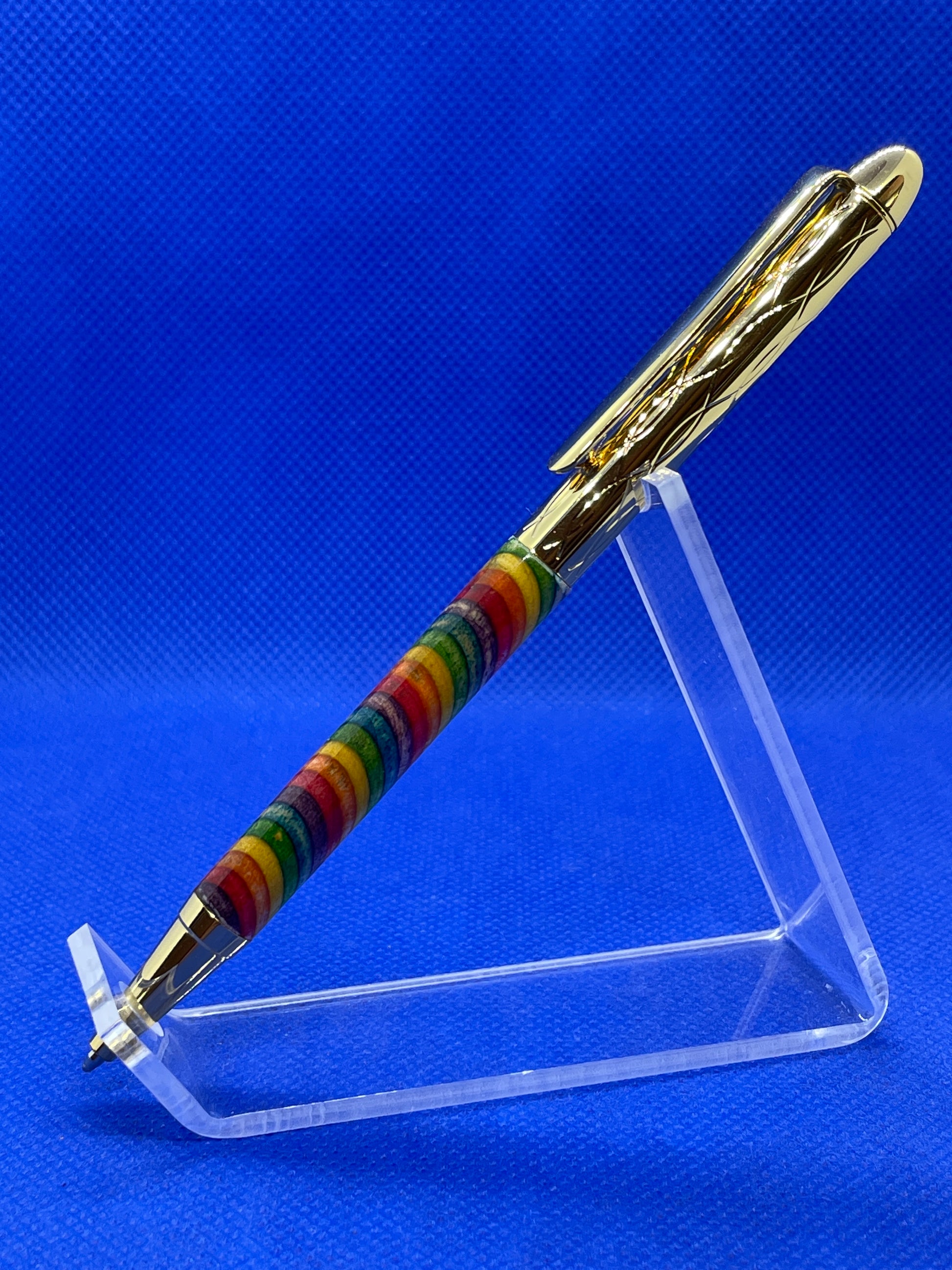 This Gentry ballpoint pen features gold trim and a colourful rainbow body made from coloured popsicle sticks! It is a slim, lightweight pen that is ideal for carrying in a purse or pocket. It uses standard Cross style refills