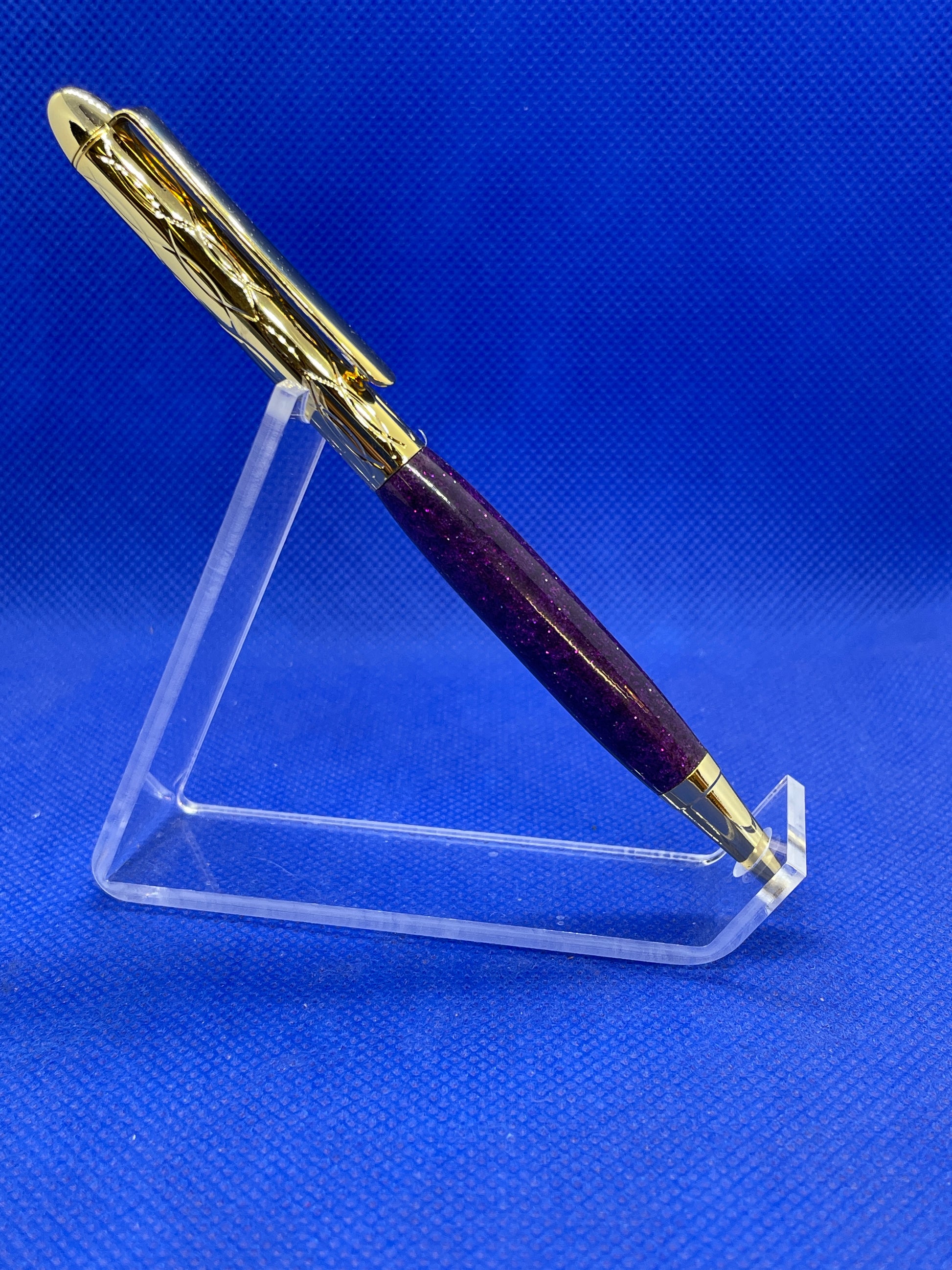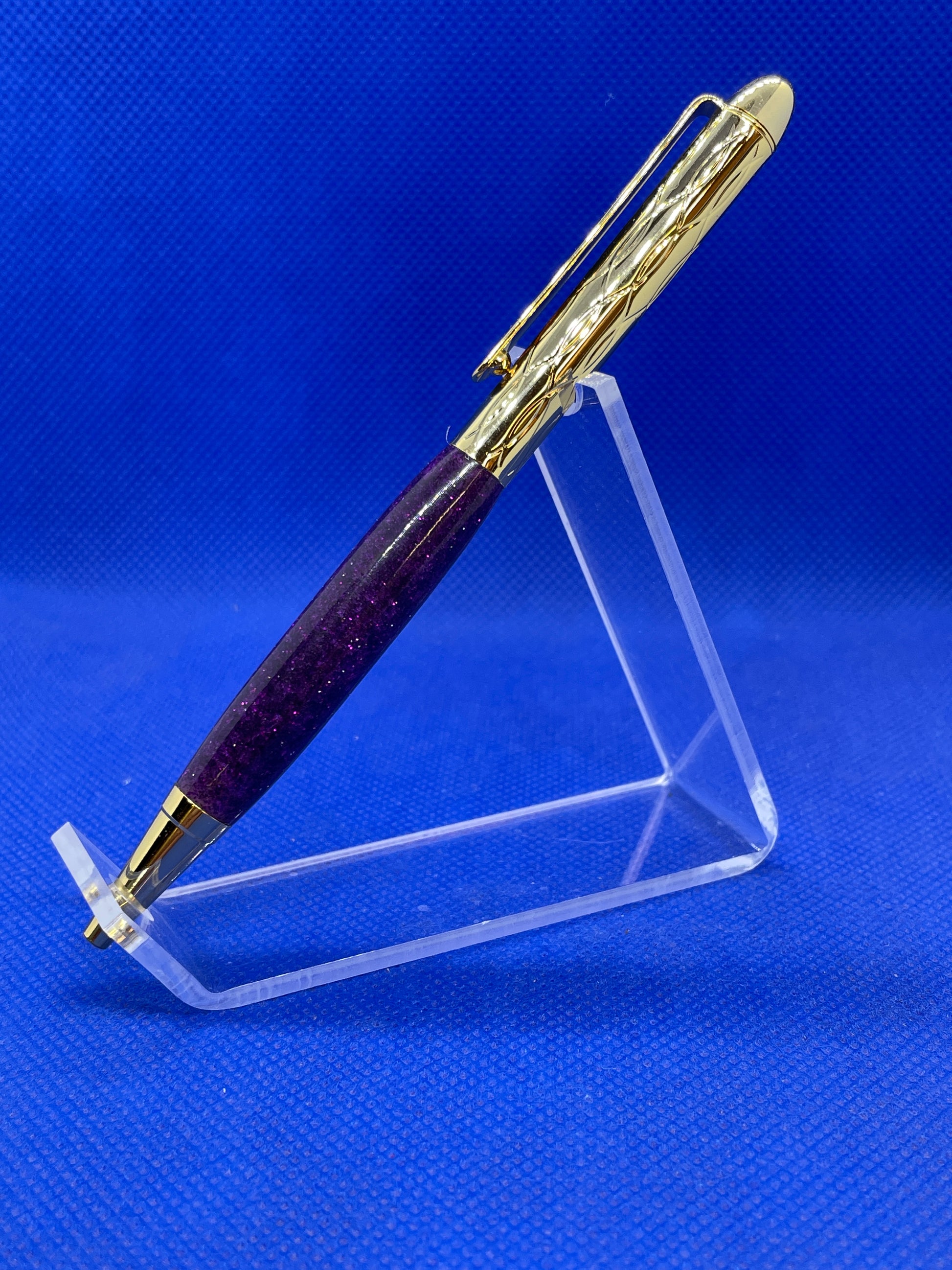 This Gentry ballpoint pen features gold trim and a brilliant purple "Universe" glitter resin body. It is a slim, lightweight pen that is ideal for carrying in a purse or pocket. It uses standard Cross style refills