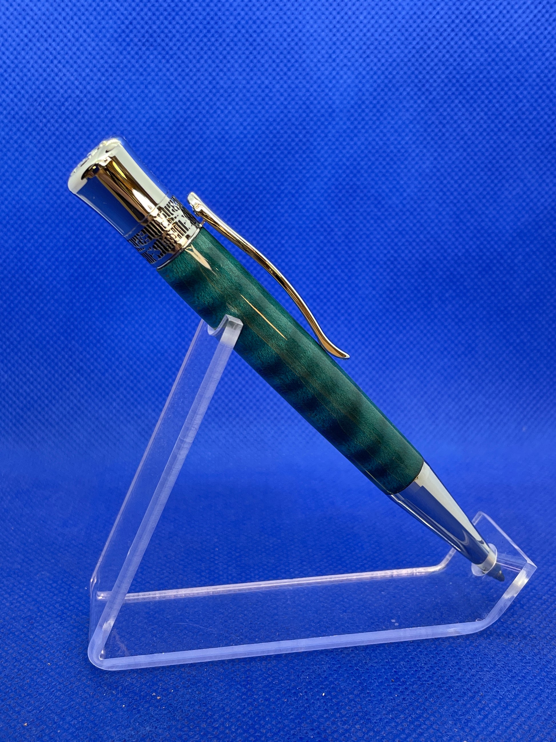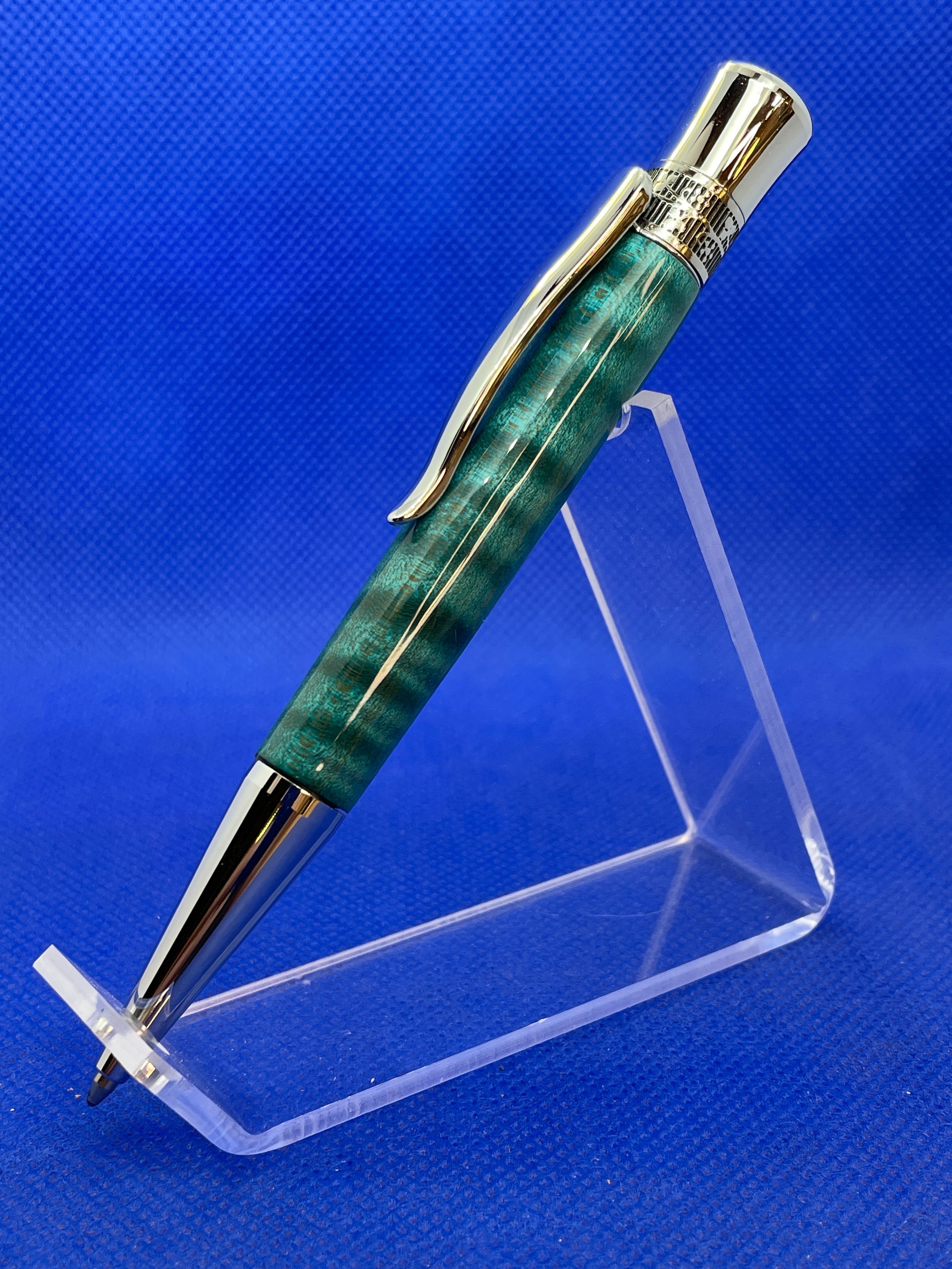 This Glacia ballpoint pen features decorative chrome trim and an "Ocean Blue" curly maple body with lovely deep contrasting colour bands know as chatoyance. It uses a Parker style refill.