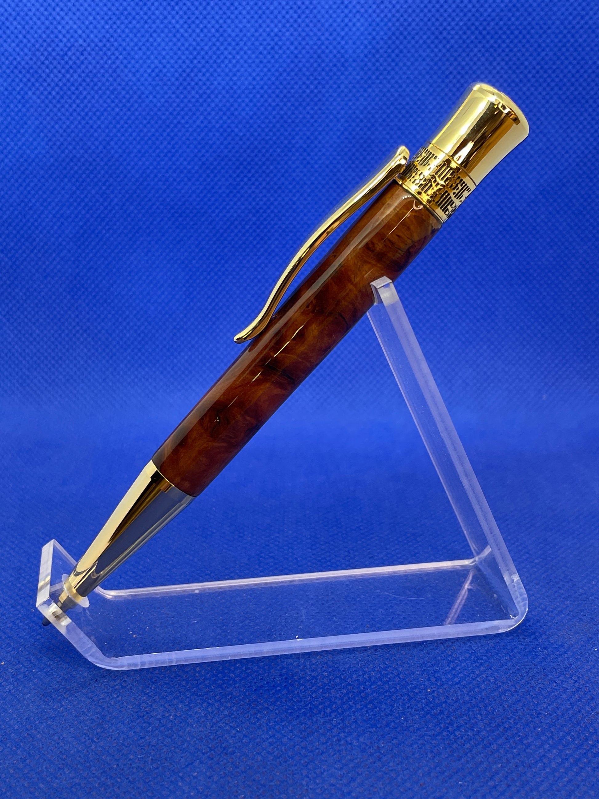 This Glacia ballpoint pen features decorative gold trim and a Red Coolabah burl body. This burl wood comes from Australia and is a very dense wood that has dramatic swirls of colour. It uses a Parker style refill.