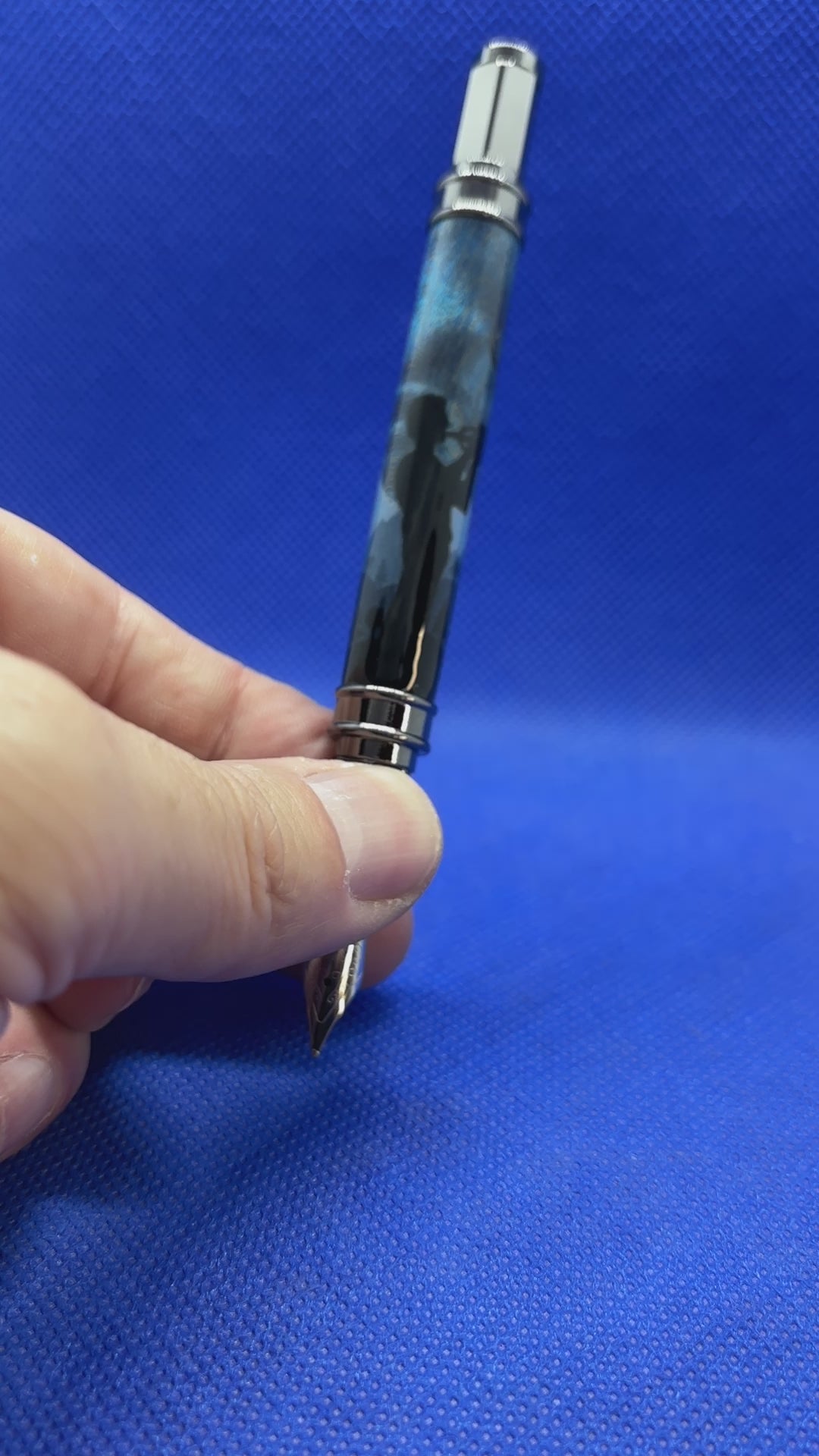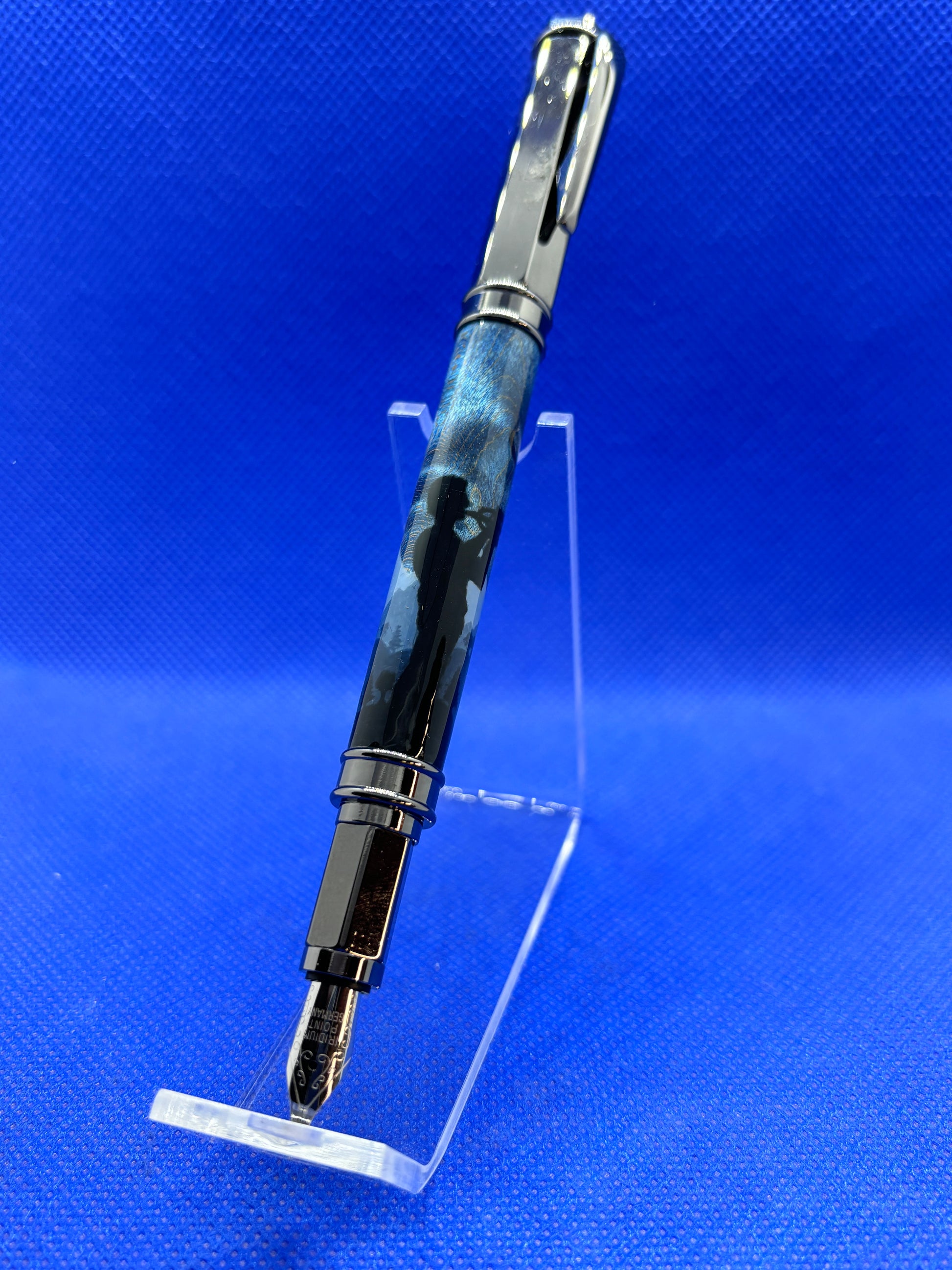 This Vertex fountain pen features gun metal metalwork and an "Electric Blue" Birdseye maple wood body. The pen also features a custom ordered hand painted silhouette of a trumpeter over a nature landscape. The graining on the pen show through the artwork to create hints of a "Starry Night" skyline. The cap is magnetic so it posts on either end of the pen quickly and easily. The pen uses ink cartridges or an included refillable ink reservoir.