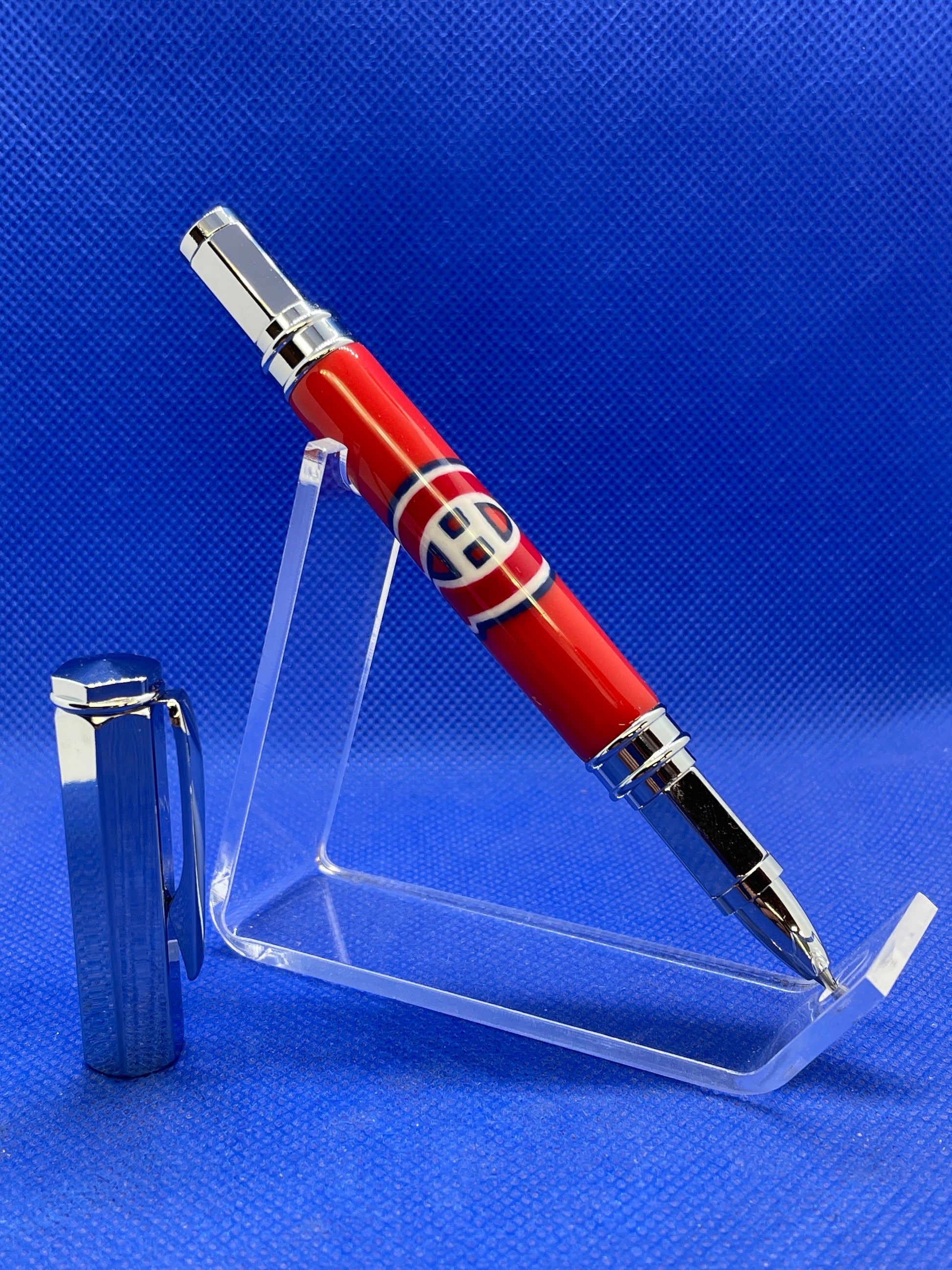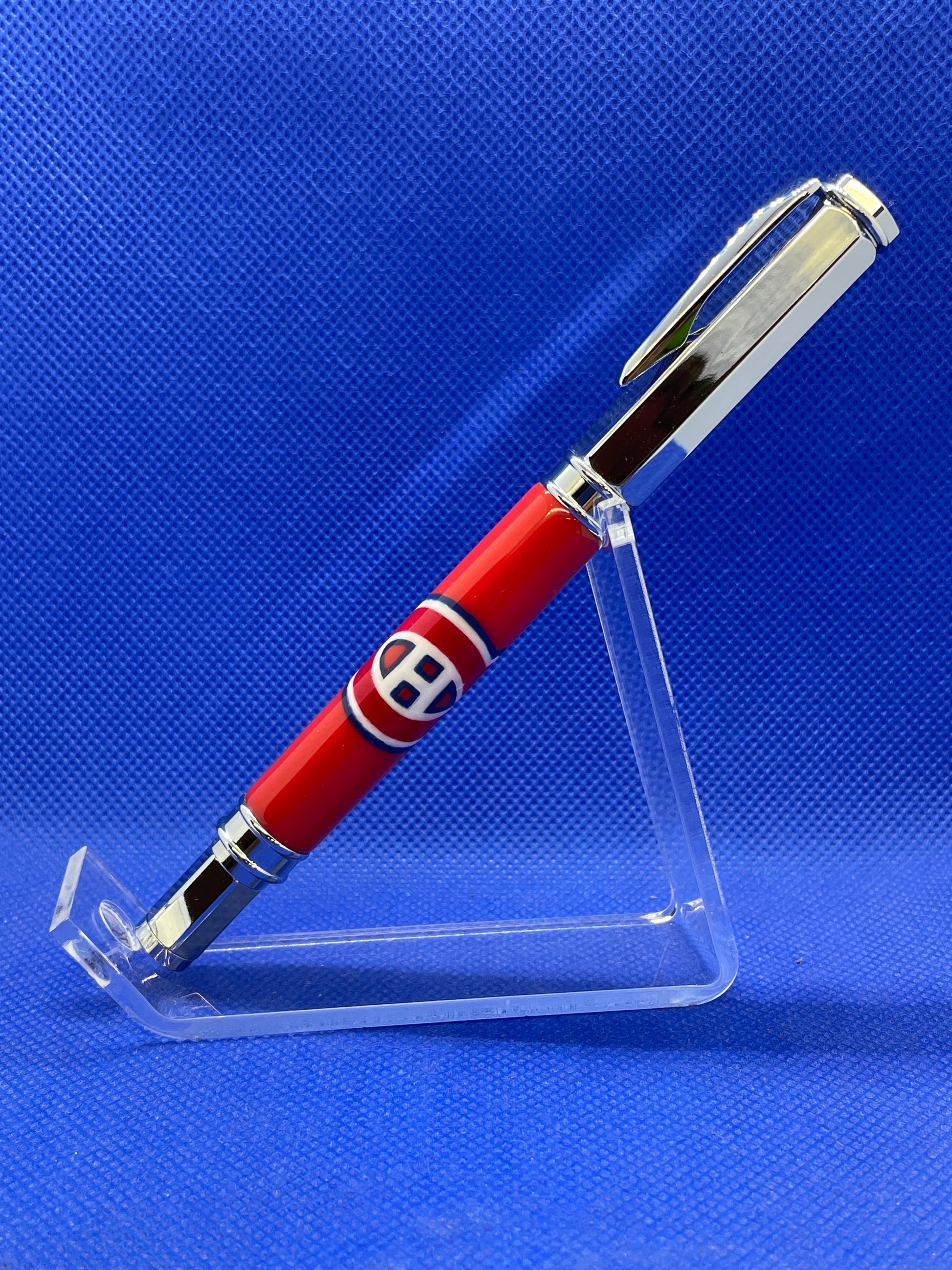This Vertex rollerball pen features chrome metalwork and a red acrylic acetate body. The customer is a big "Habs" fan and requested a hand painted Montréal Canadiens logo on the body. The cap is magnetic so it posts on either end of the pen quickly and easily. The pen uses a Schmidt style rollerball refill.