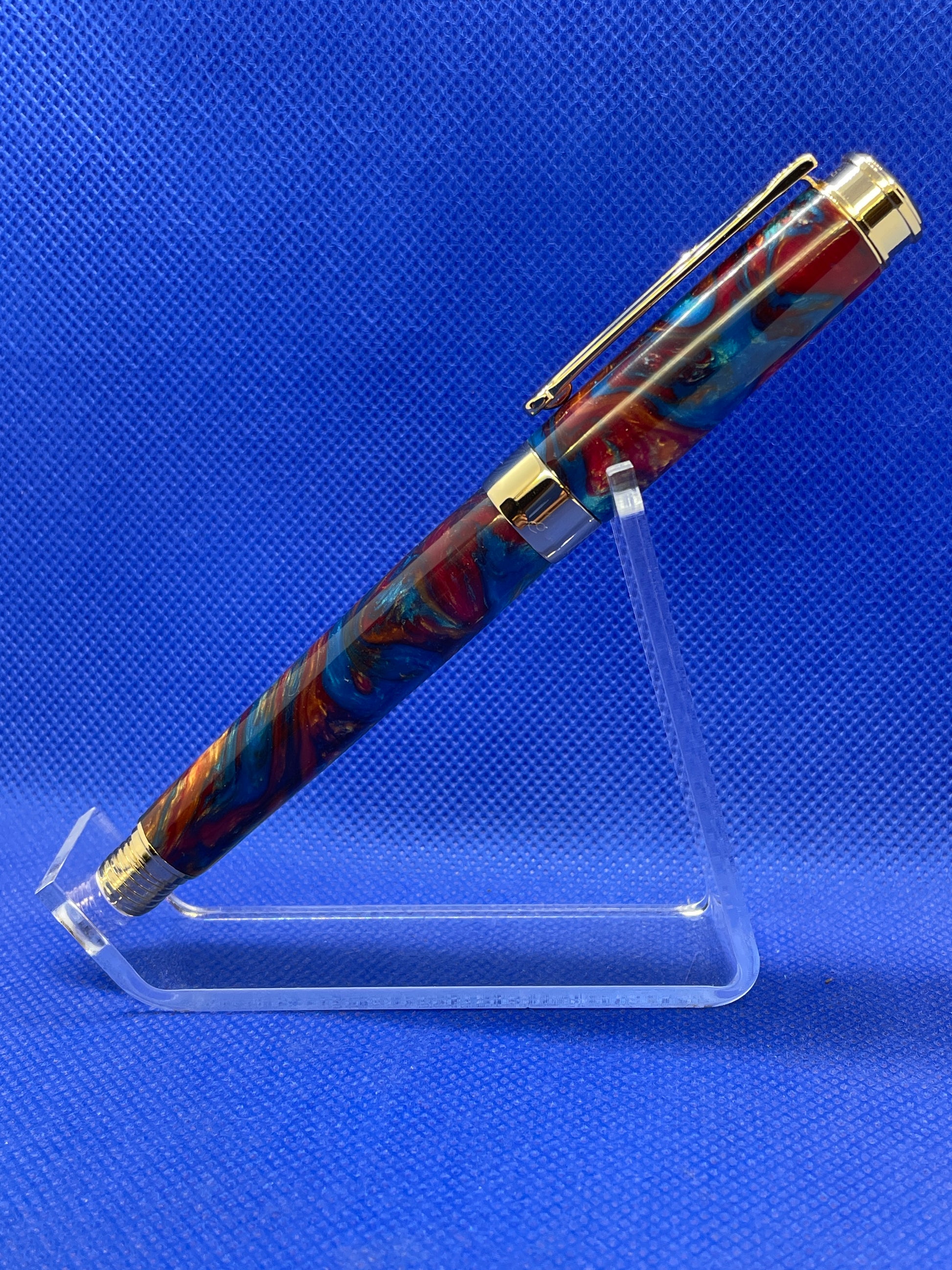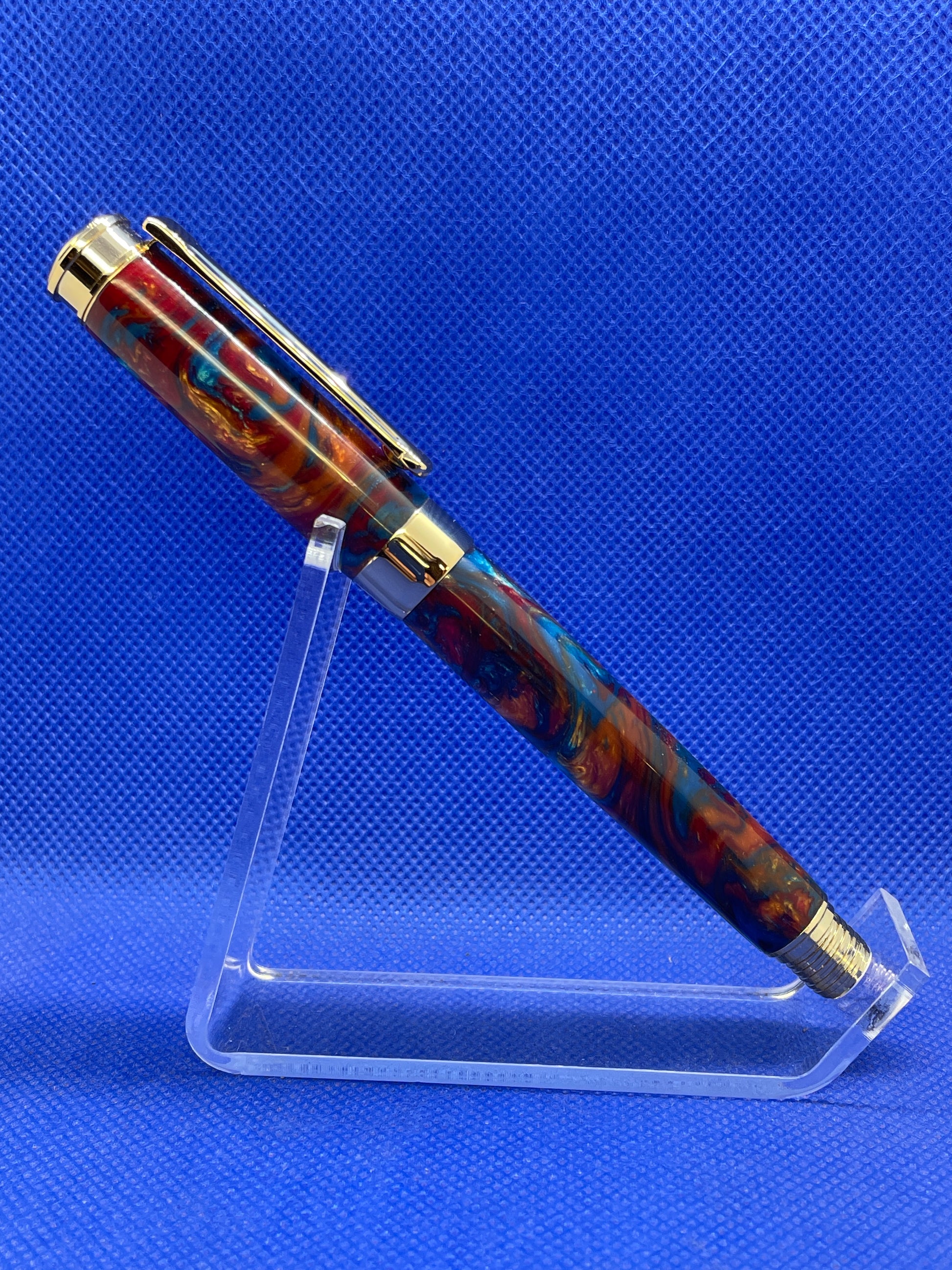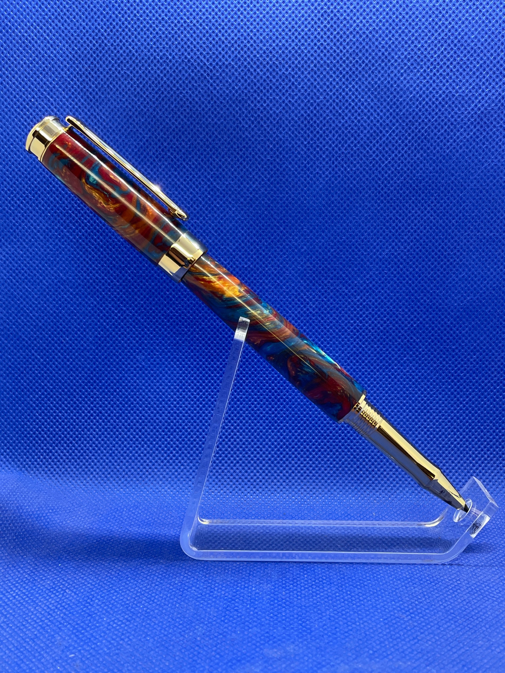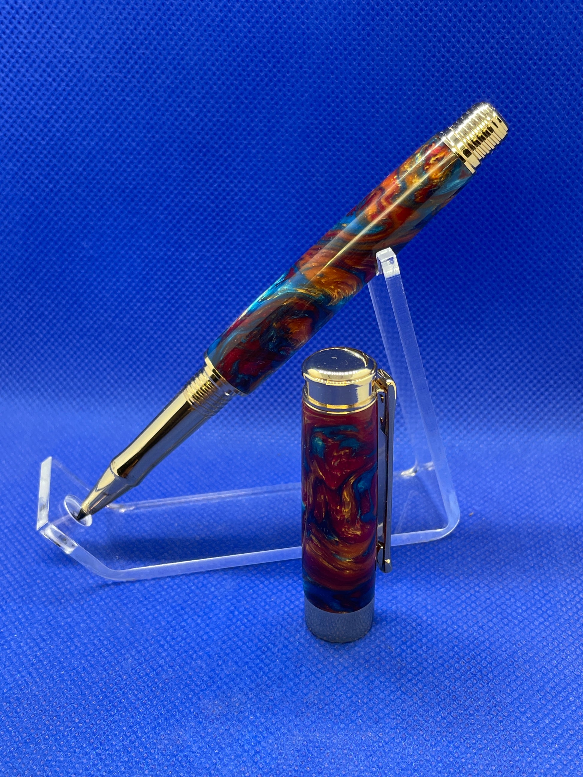 This Leveche rollerball pen features gold metalwork and a very colourful "Fiesta" resin body This pen uses a Schmidt style rollerball refill.