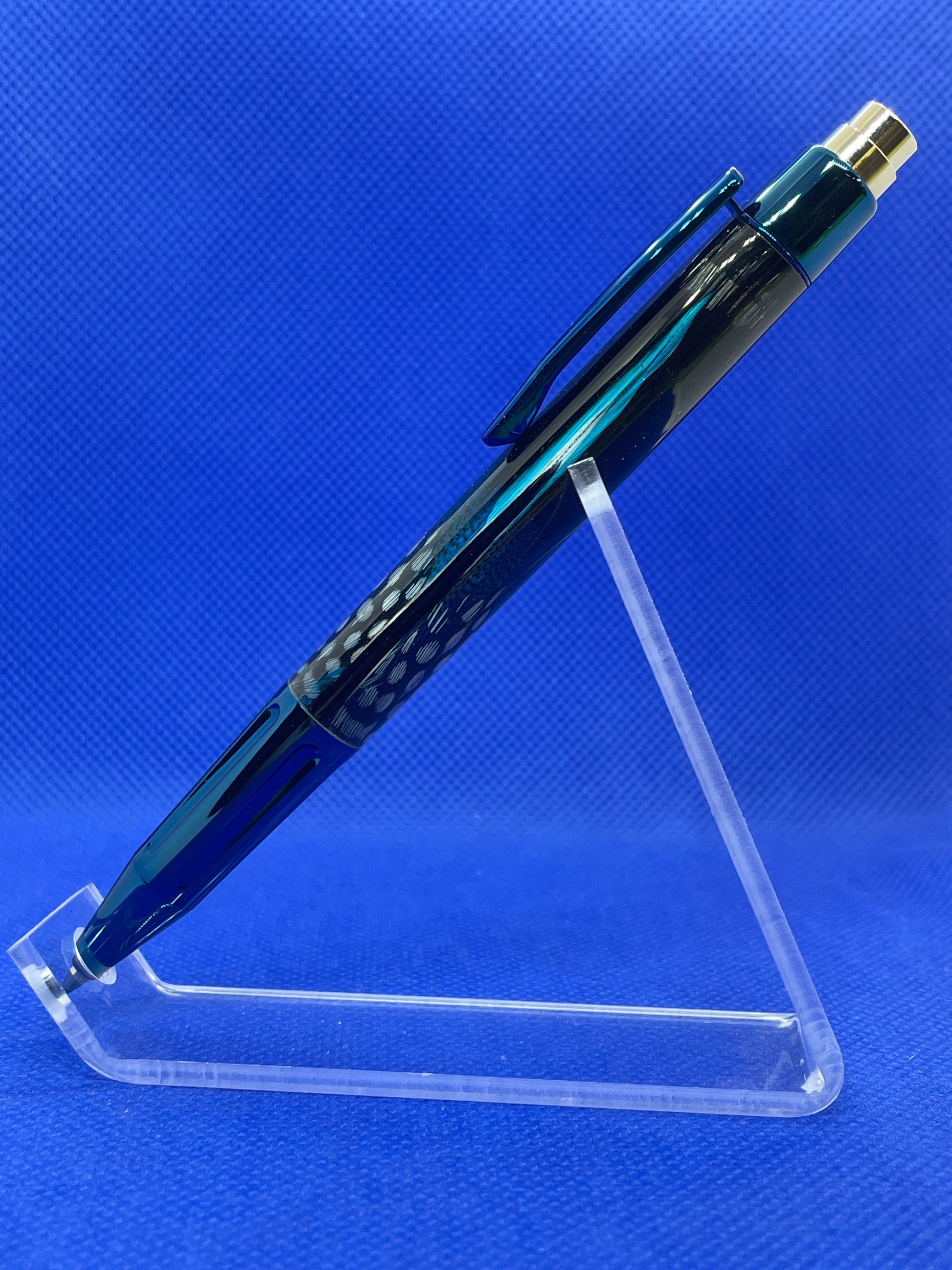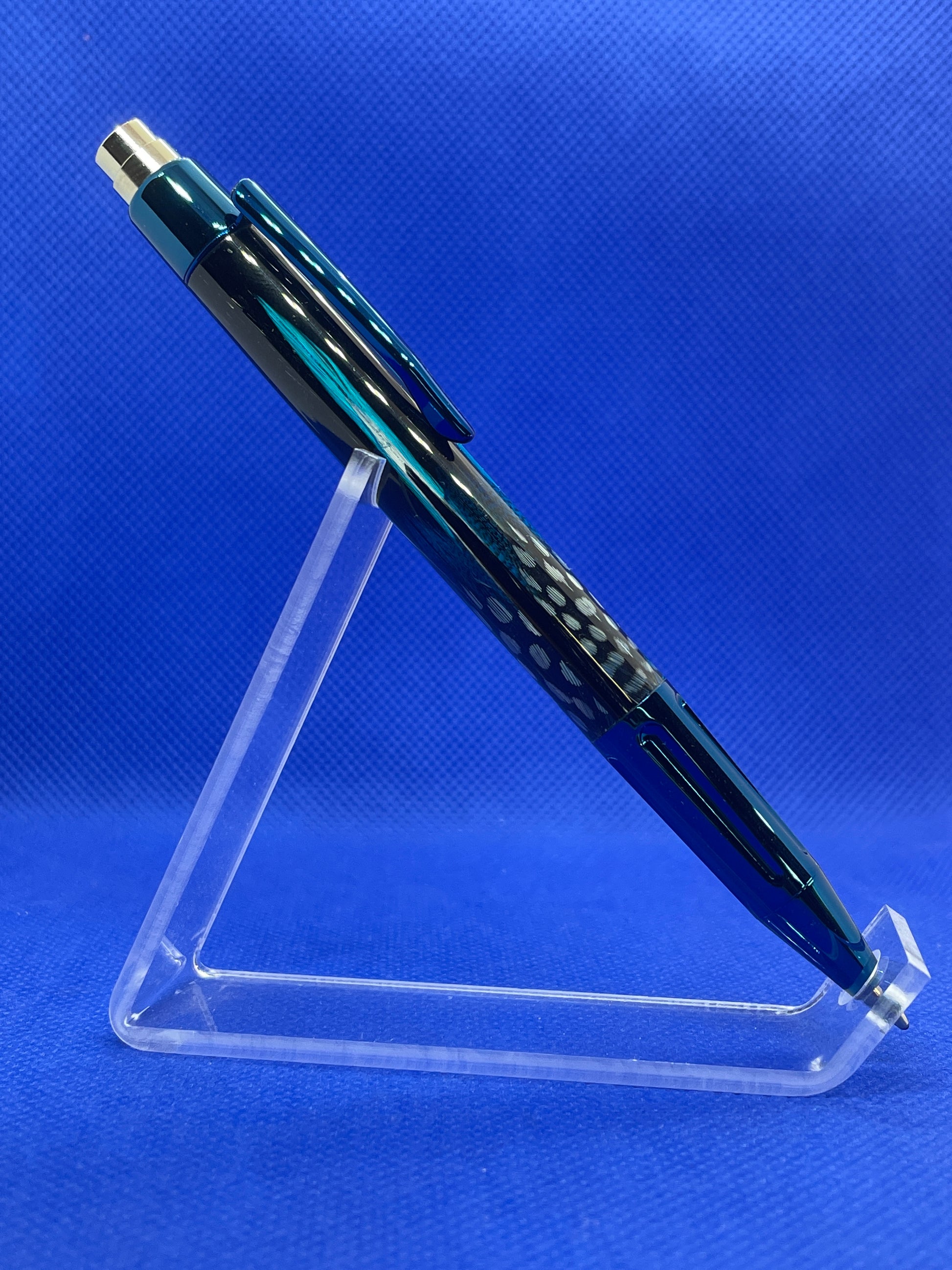 This unique Luxor ballpoint pen features Titanium Blue fittings and blue Rooster and Guinea Fowl feathers in the body. A stunning addition to your desk! This pen comes with a carbon fibre pattern box and uses standard Parker style refills.