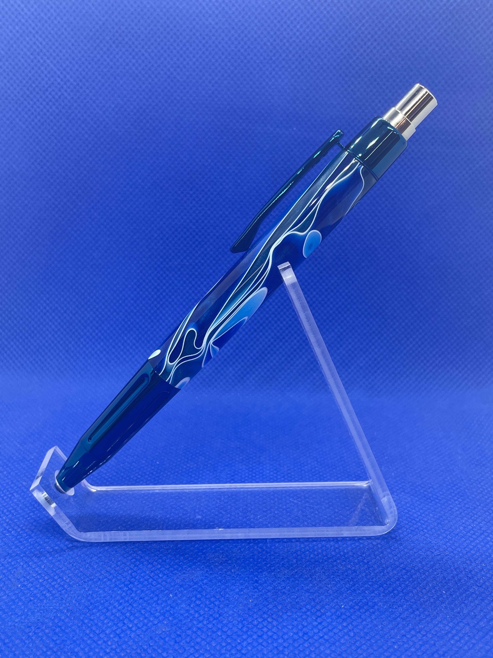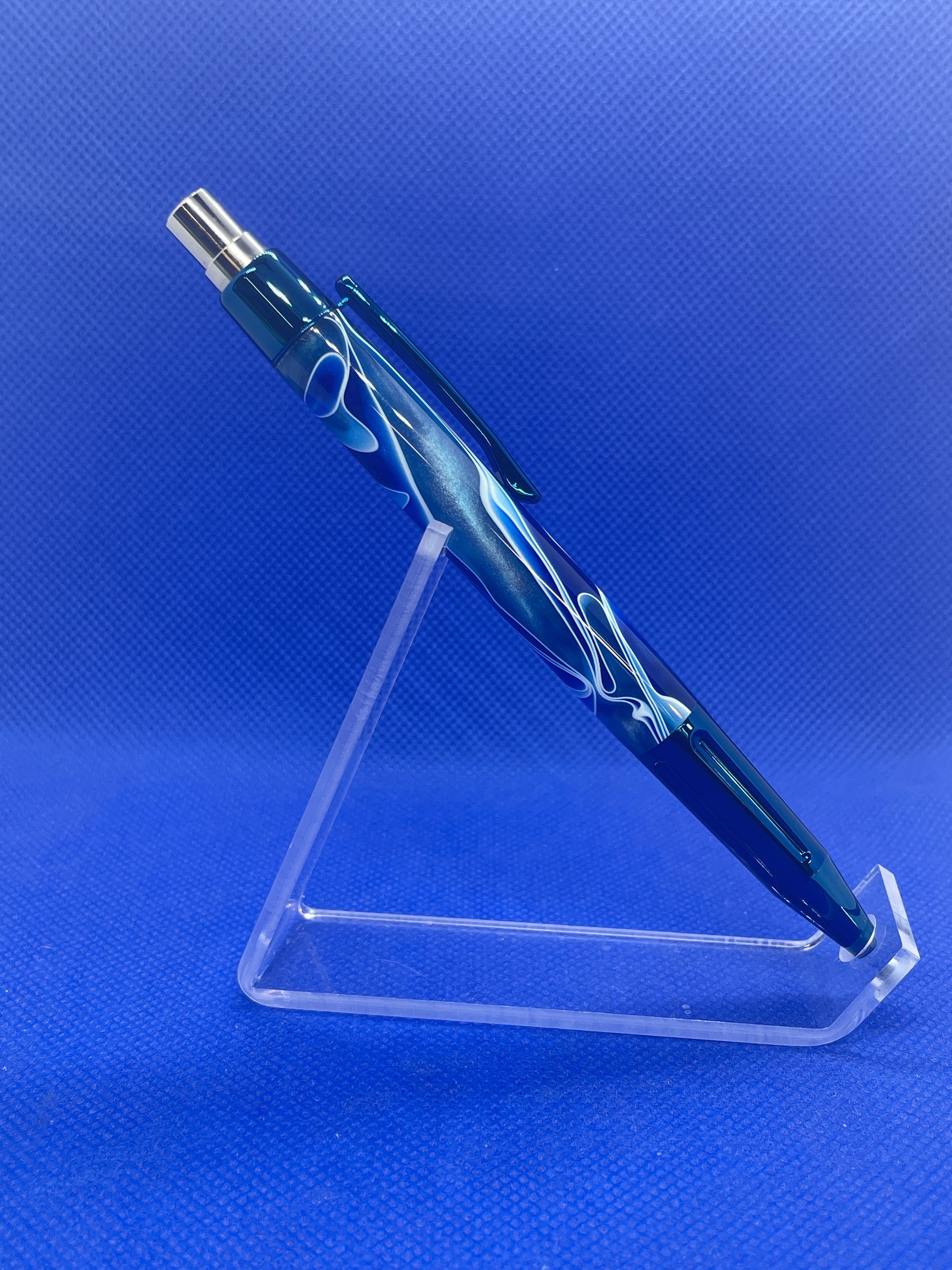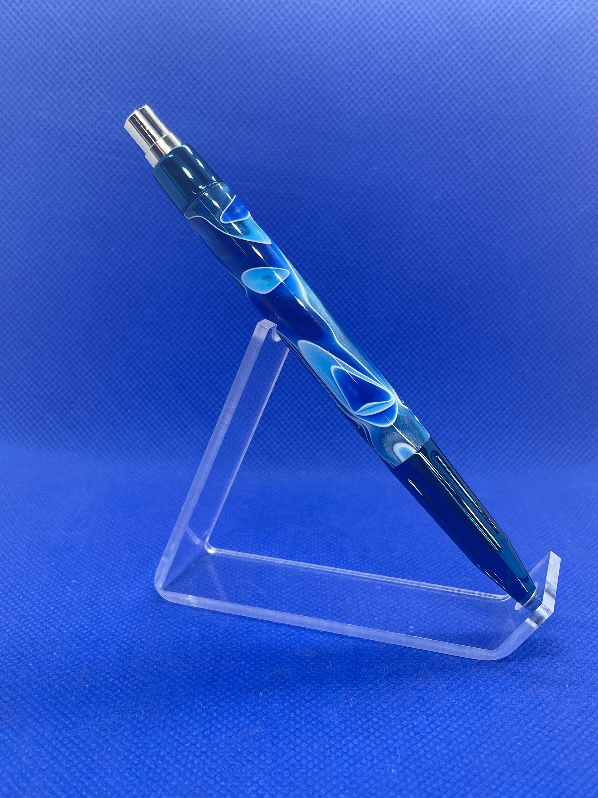 This Luxor ballpoint pen features Titanium Blue fittings and a dramatic "Blue Sky" Acrylic acetate body. This pen has an all metal Schmidt click mechanism that is incredibly smooth and durable, and it uses standard Parker style refills.