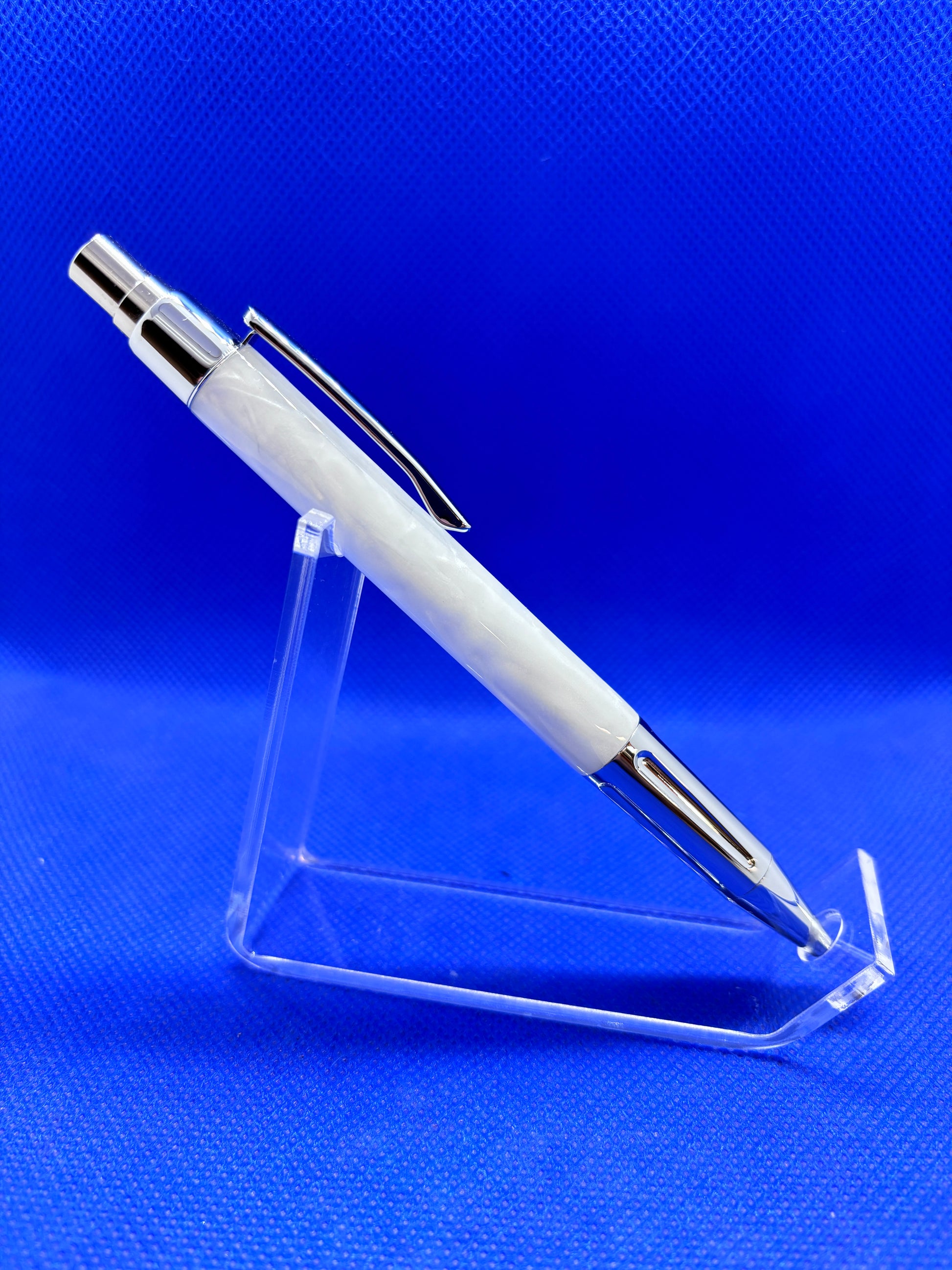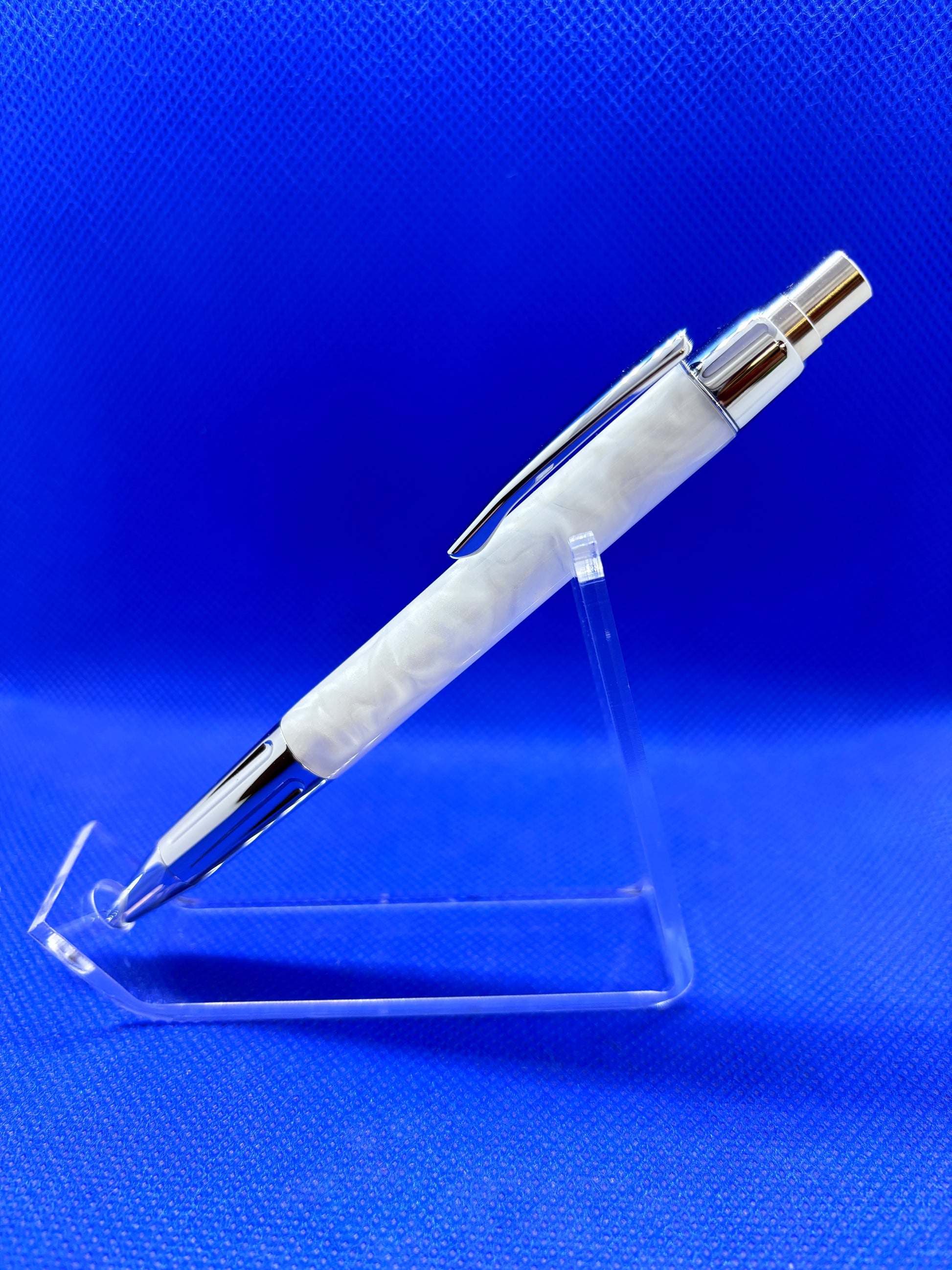 This Luxor push button ballpoint pen features a White Pearl acrylic acetate body with chrome metalwork. The click mechanism is an ultra-reliable, all metal Schmidt SKM-88 mechanism that is precision-engineered in Germany. This pen uses standard Parker refills.