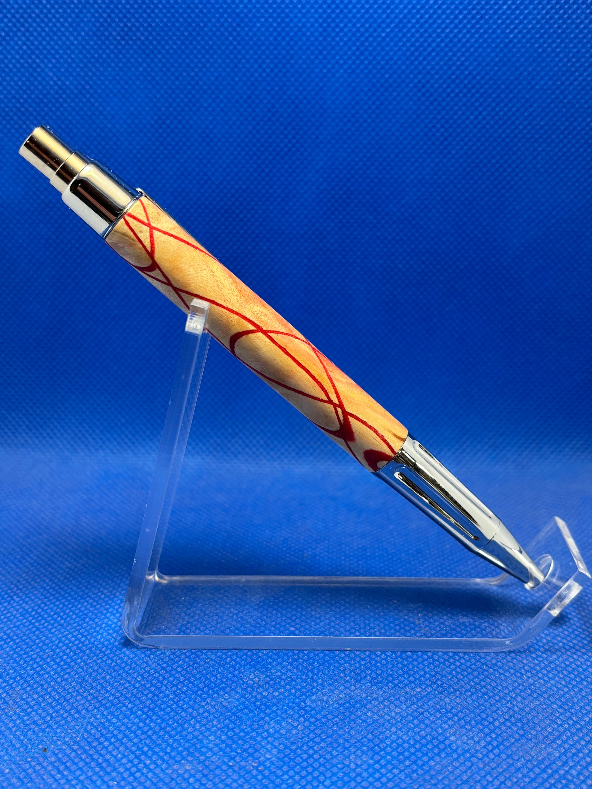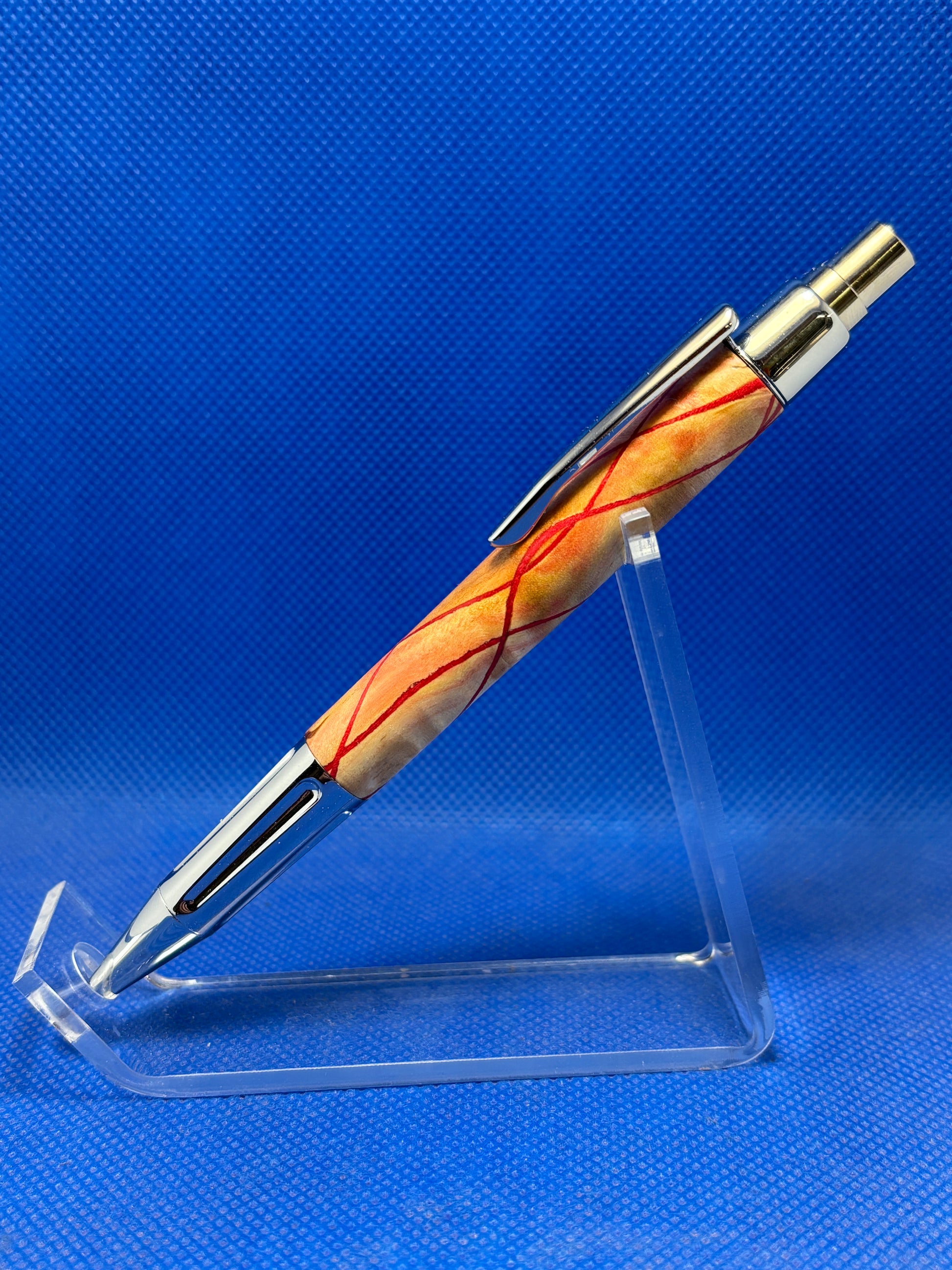 This Luxor push button ballpoint pen features a Flame Box Elder burl body with a red veneer inlay pattern, and chrome metalwork. The click mechanism is an ultra-reliable, all metal Schmidt SKM-88 mechanism that is precision-engineered in Germany. This pen uses standard Parker refills.