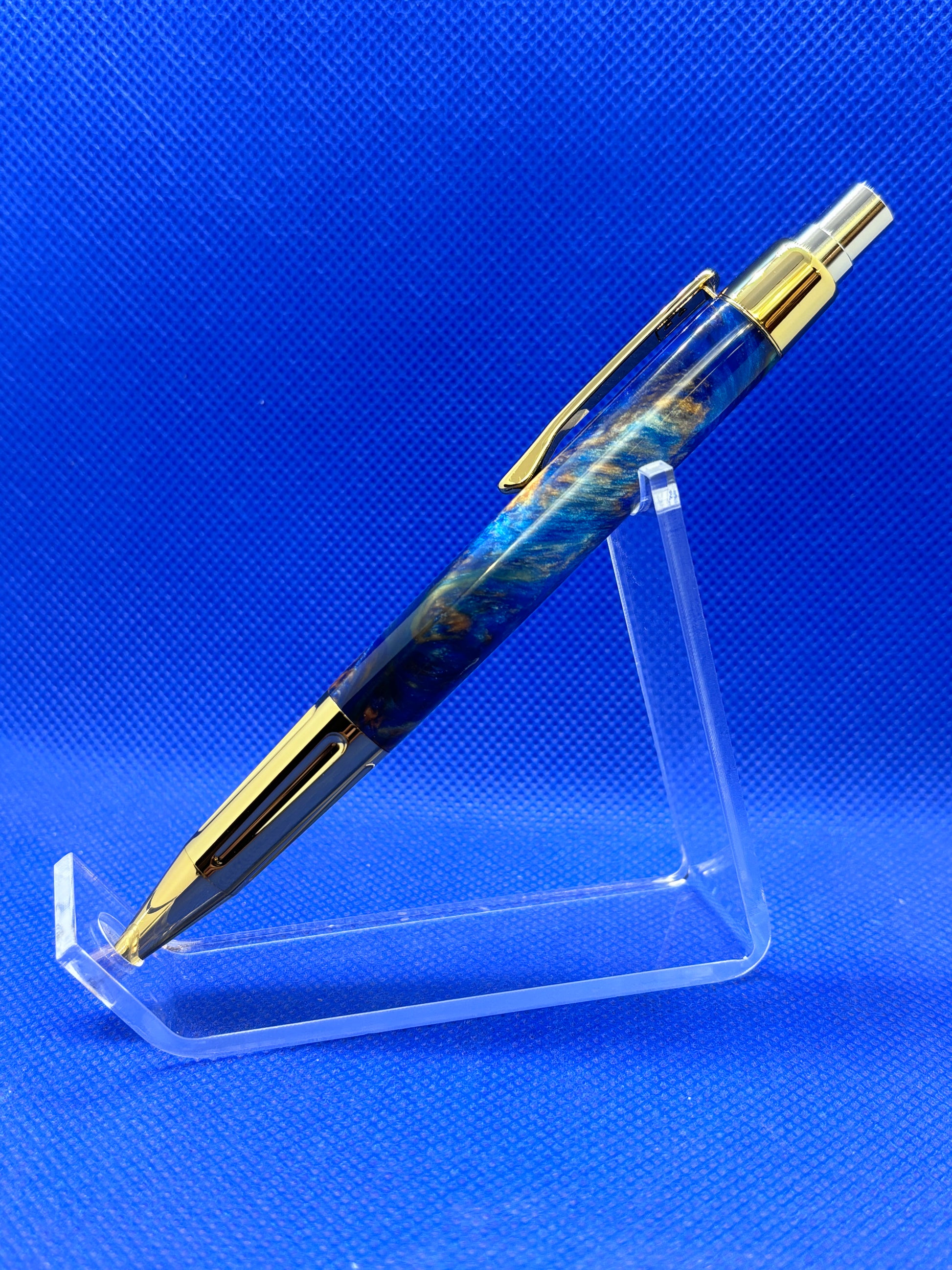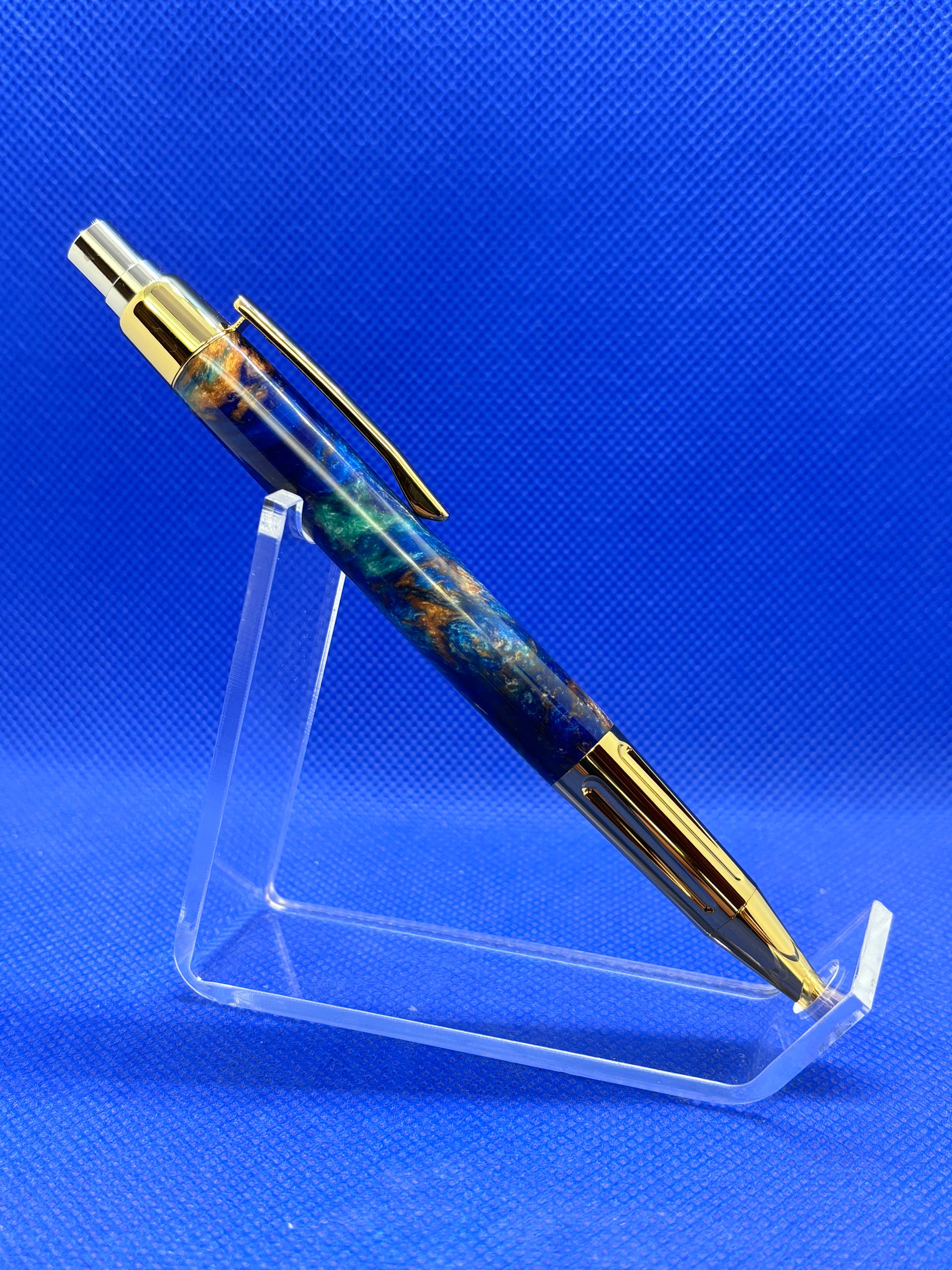 This Luxor click ballpoint pen features Gold metalwork and a "Starry Night" resin body. The click mechanism is a German made, all metal Schmidt mechanism that offers much more precision and reliability than traditional plastic mechanisms. This pen uses standard "Parker" style refills.