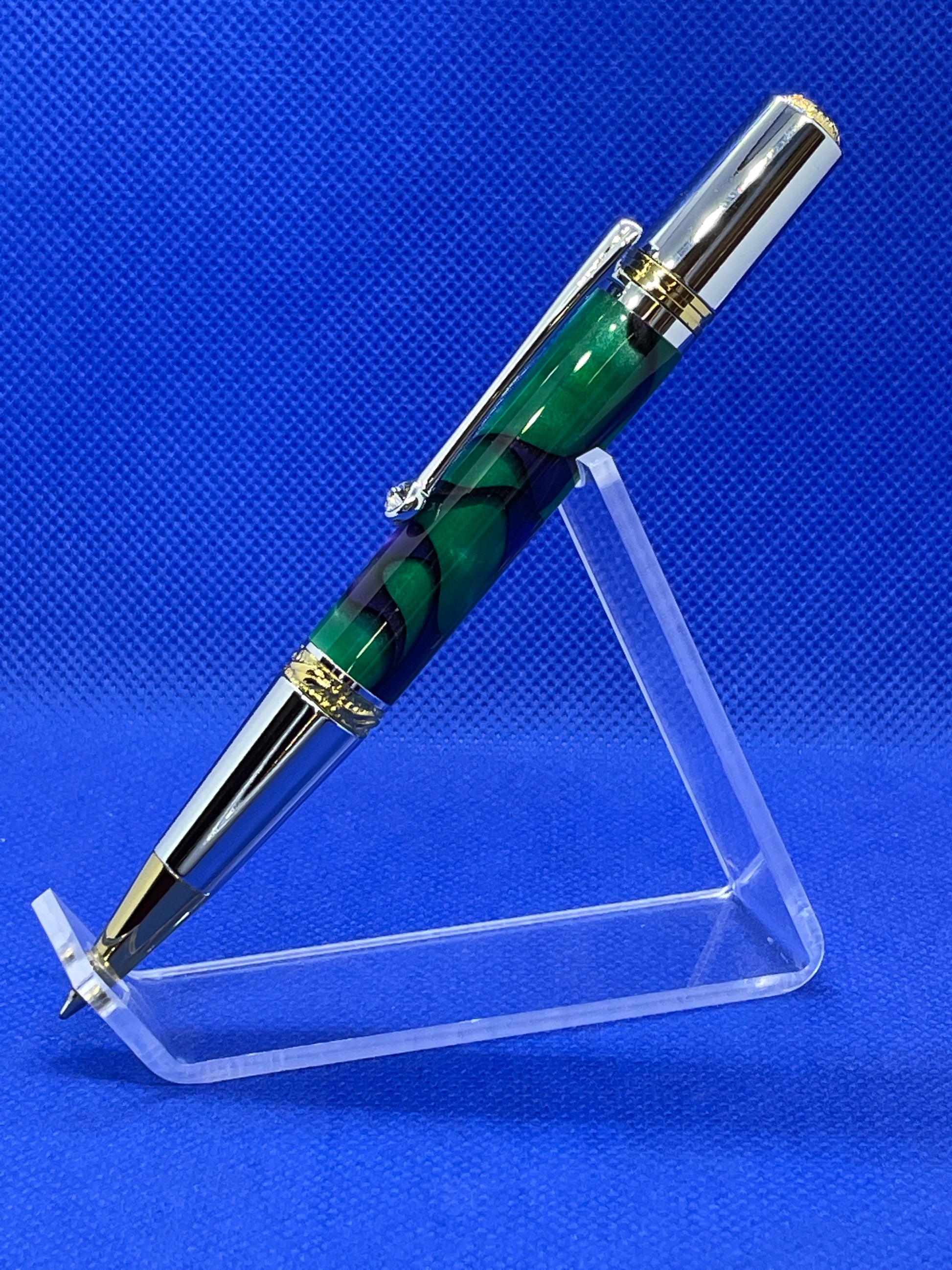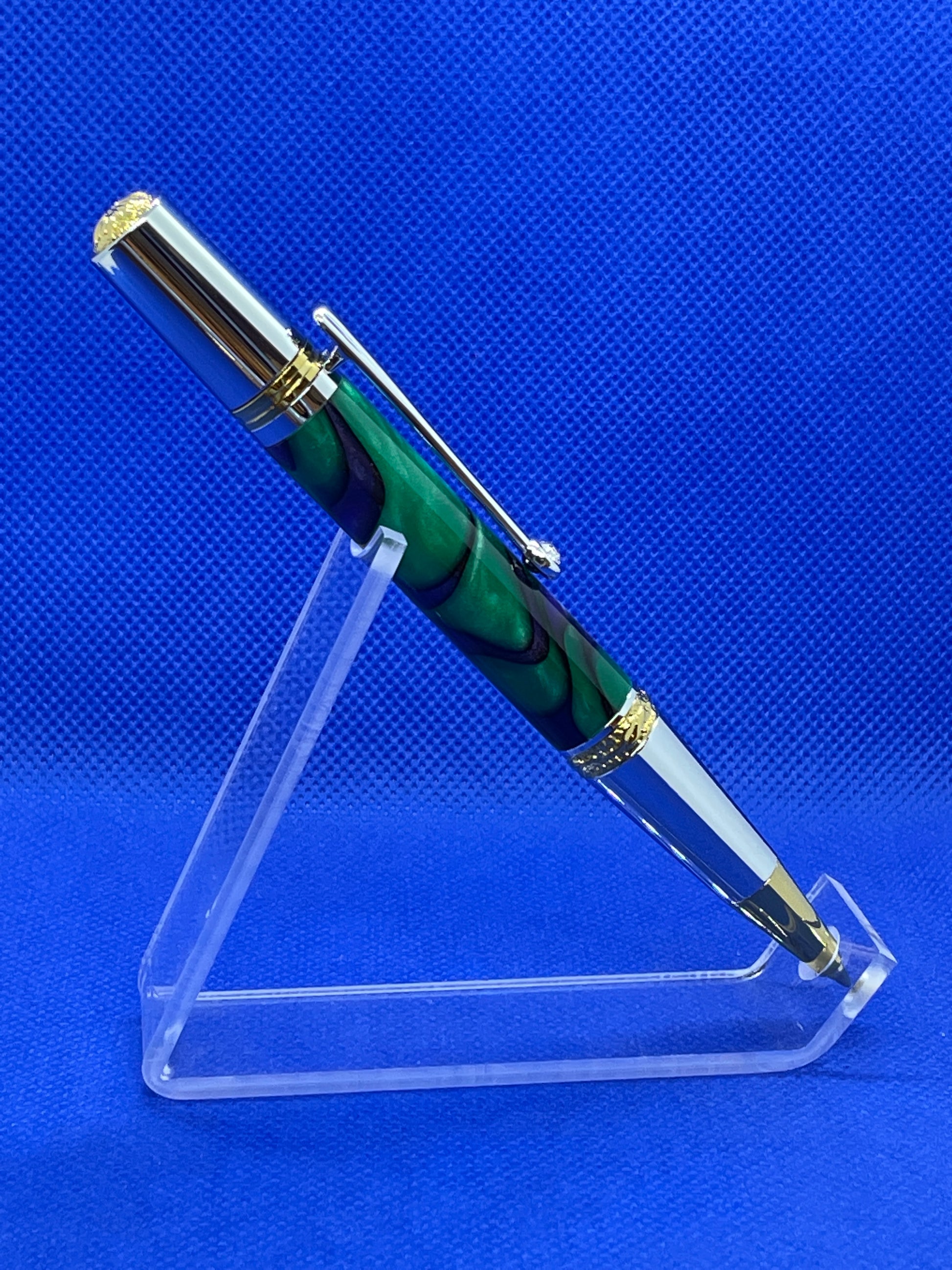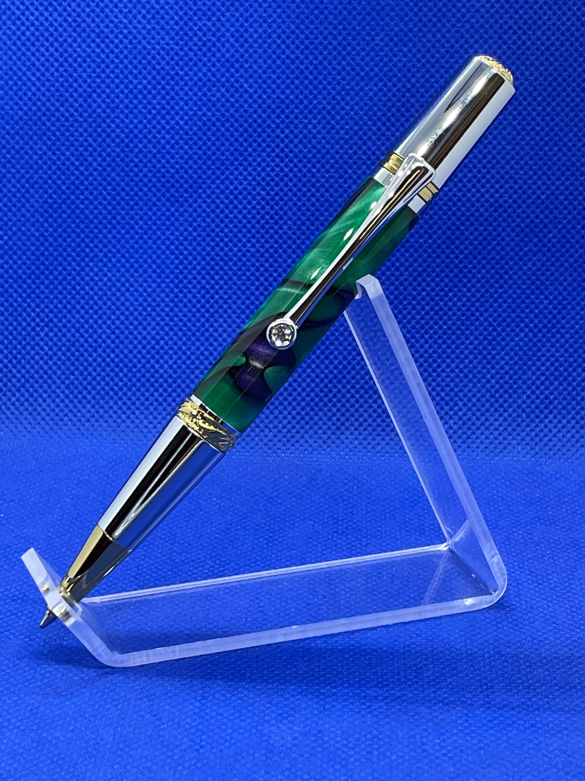 This Majestic Squire ballpoint pen features gold and chrome trim and a stunning "Purple Dragon" acrylic acetate body. To add extra sparkle, the clip has a brilliant Swarovski crystal. The combination of the unique colours, the bright metalwork, and the Swarovski crystal make this a real showpiece of a pen. This pen uses standard Parker style refills.