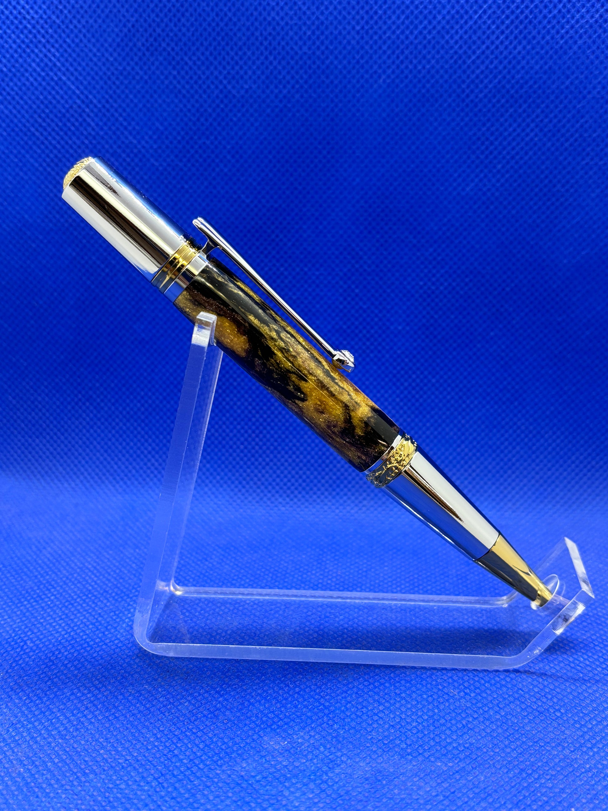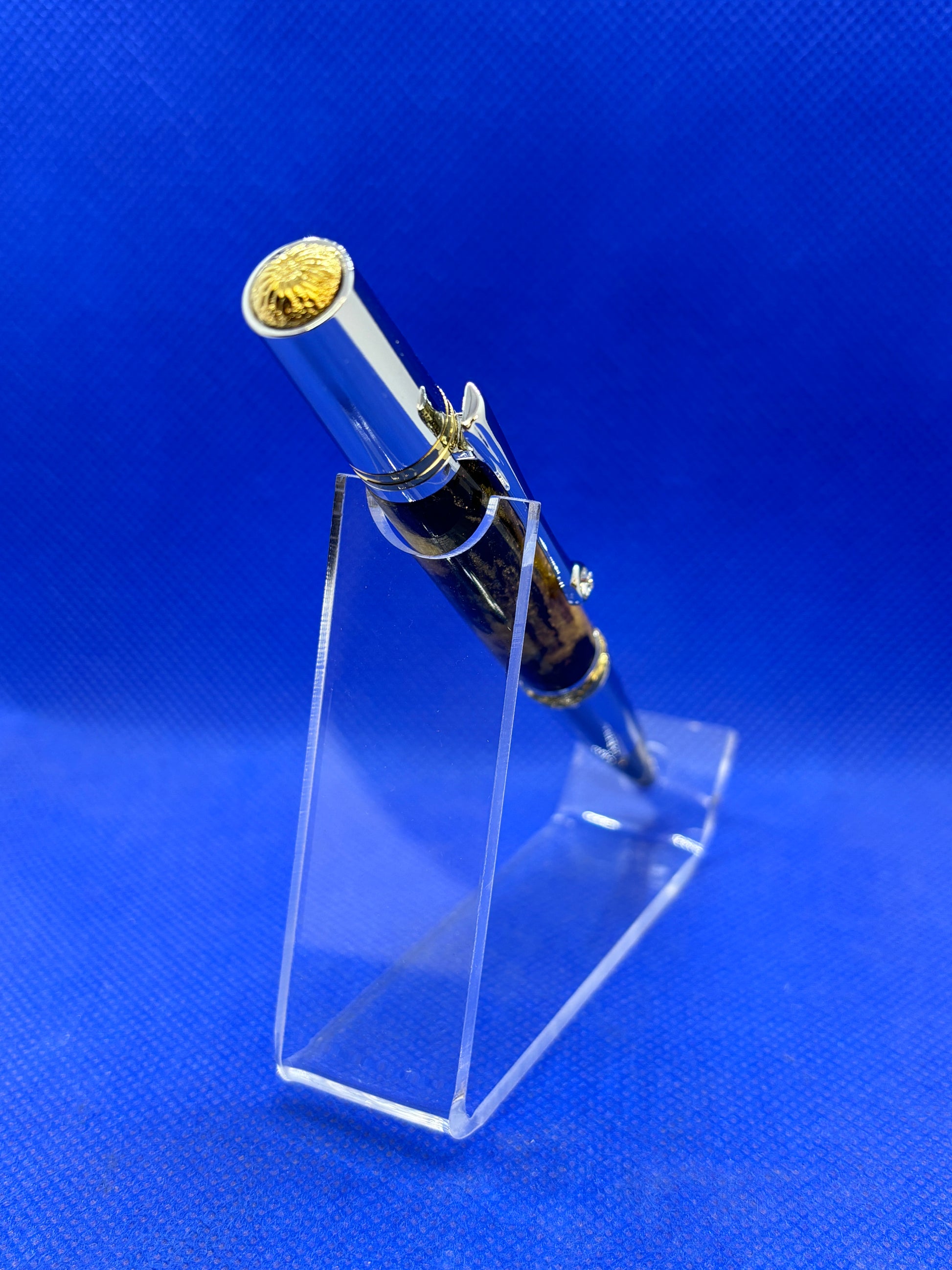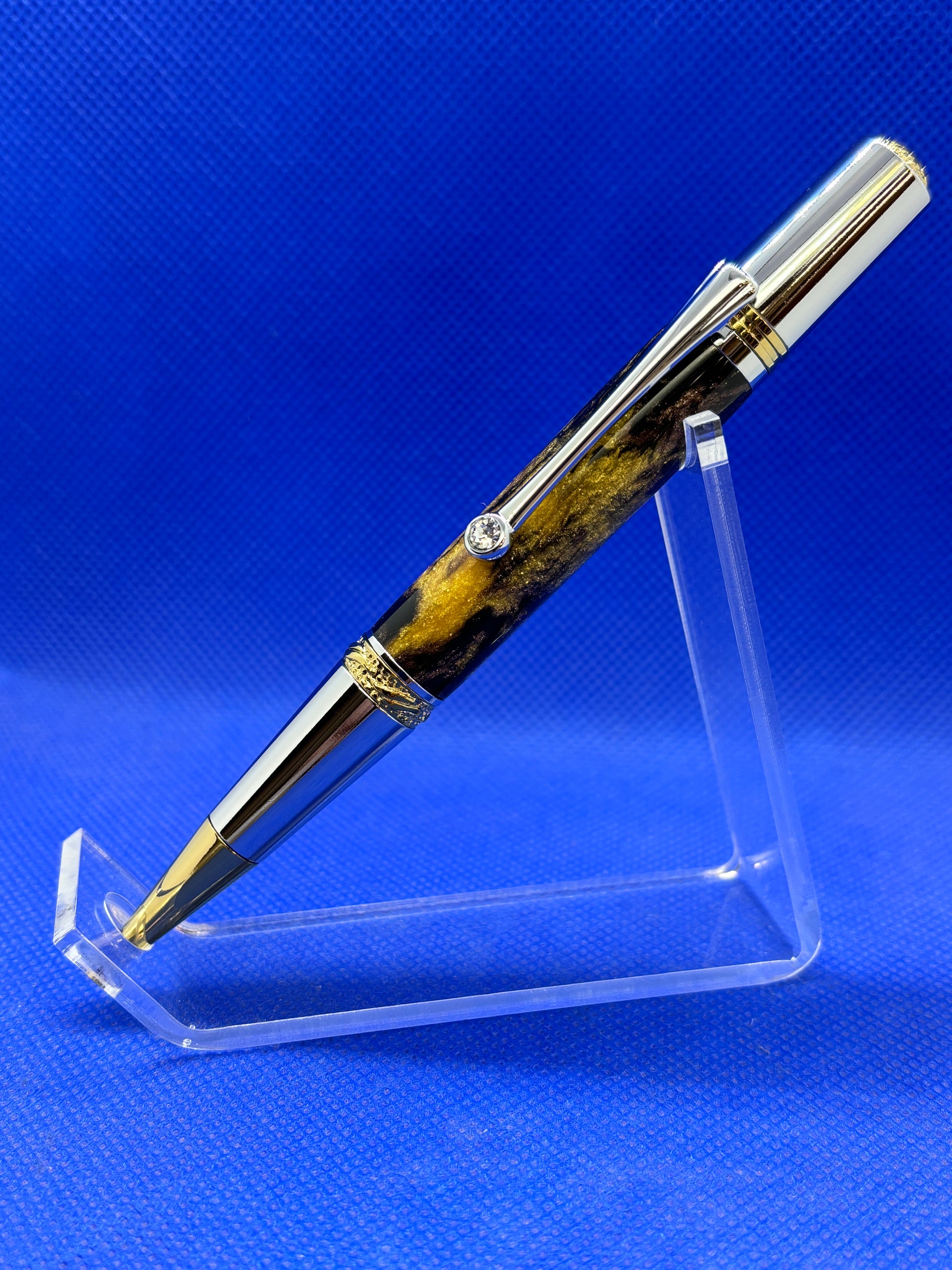 This Majestic Squire ballpoint pen features gold and chrome trim and a "Black Gold" DiamondCast resin body. DiamondCast resin is made with diamond dust that is collected from the jewelry industry. The pen comes with a certificate of authenticity to verify that these are real, ethically sourced diamonds. To add extra sparkle, the clip has a brilliant Swarovski crystal. The combination of the diamond sparkle, the bright metalwork, and the Swarovski crystal make this a real showpiece of a pen. This pen uses standard Parker style refills.