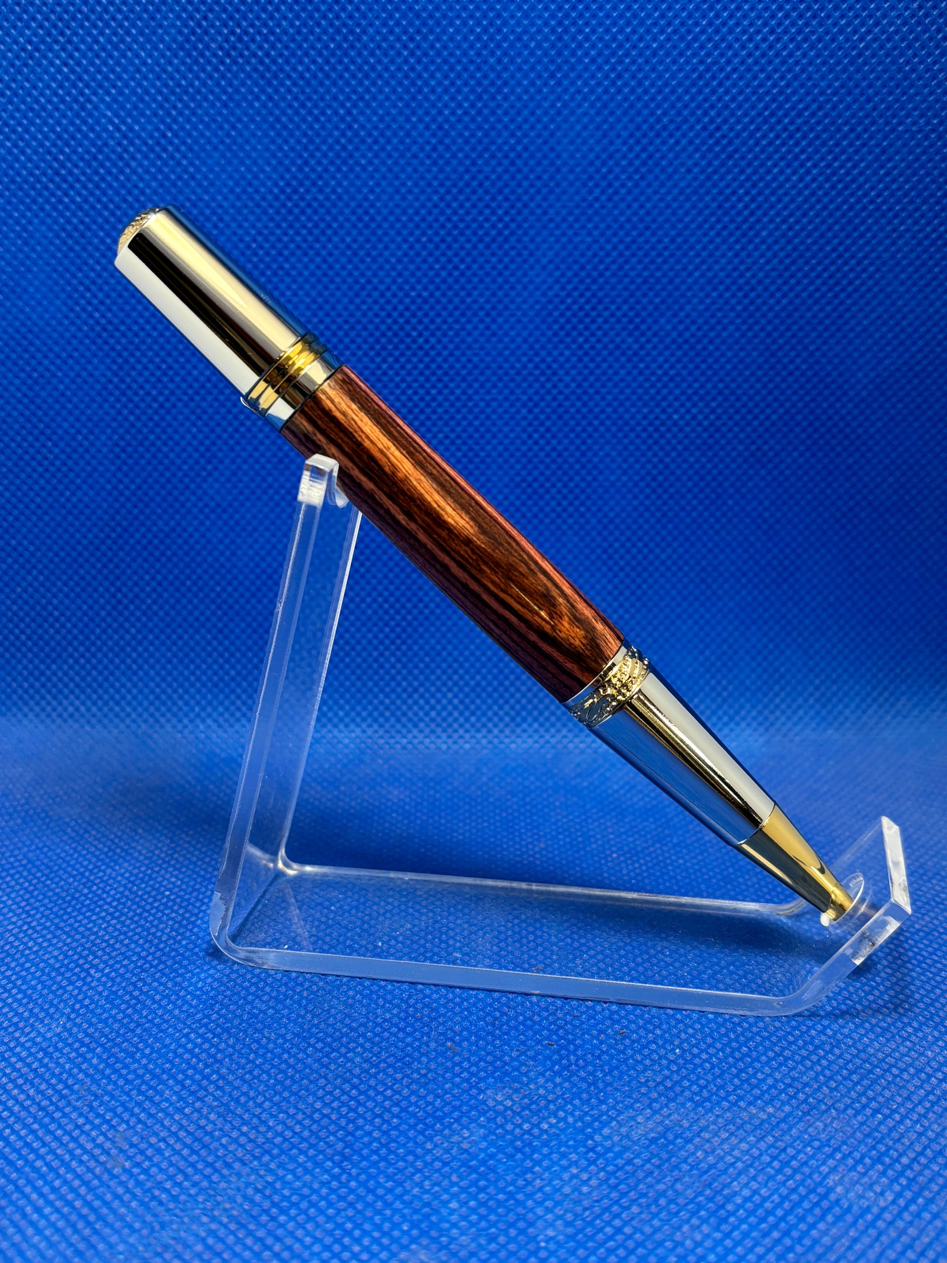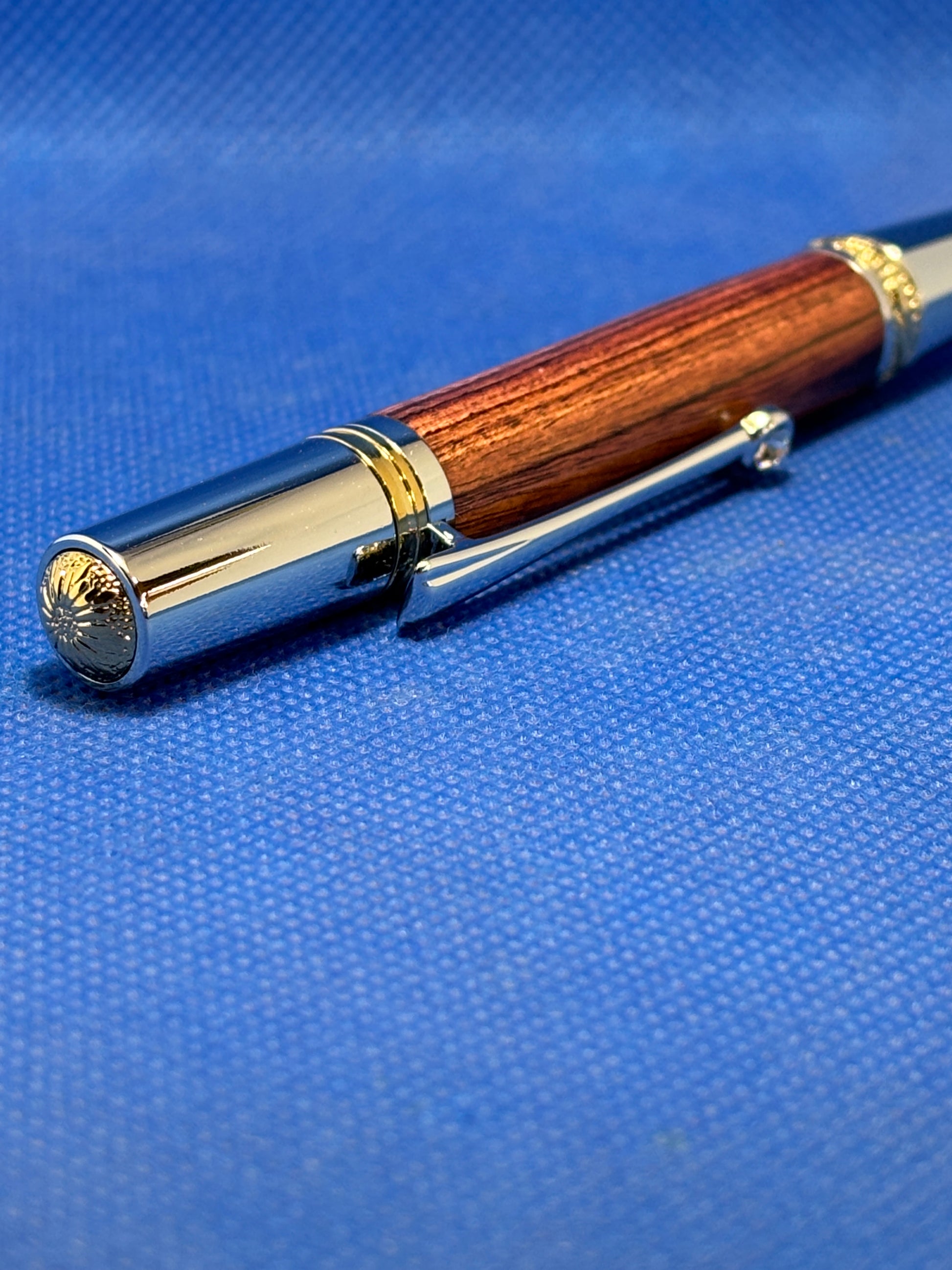 This Majestic Squire ballpoint pen features gold and chrome trim and a stunning Kingwood body. To add extra sparkle, the clip has a brilliant Swarovski crystal. The combination of the bright metalwork, and the Swarovski crystal make this a real showpiece of a pen. This pen uses standard Parker style refills.