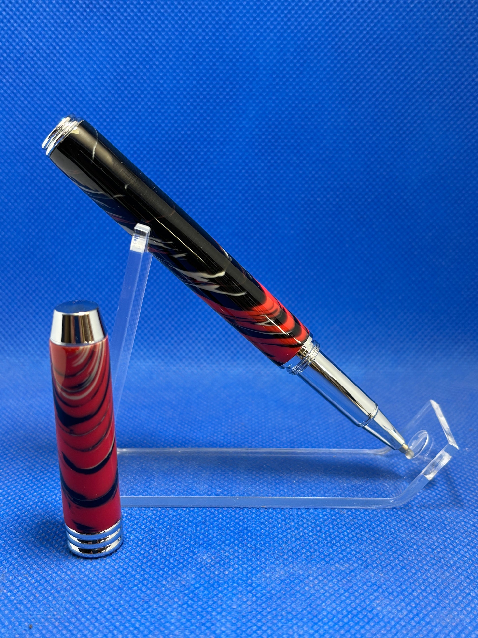 This Manager fountain pen features a dramatic "Mountie" poly resin body and chrome trim. This is a stunning pen that uses either universal fountain pen cartridges, or an included ink pump for filling from an ink bottle. This fountain pen can also be quickly converted to a rollerball pen (shown in images 3-5) by purchasing an optional rollerball converter kit so you have two writing tools in one.