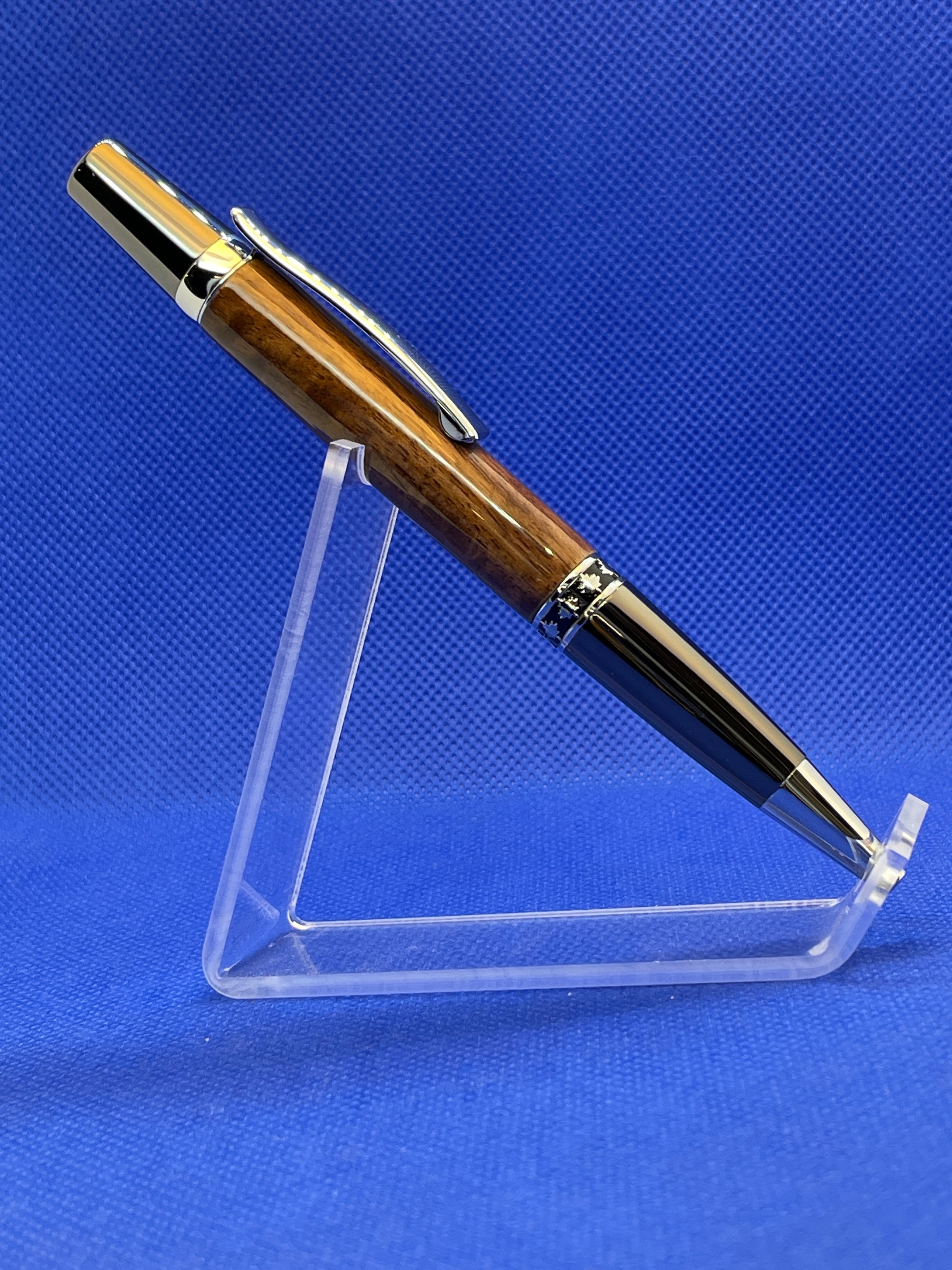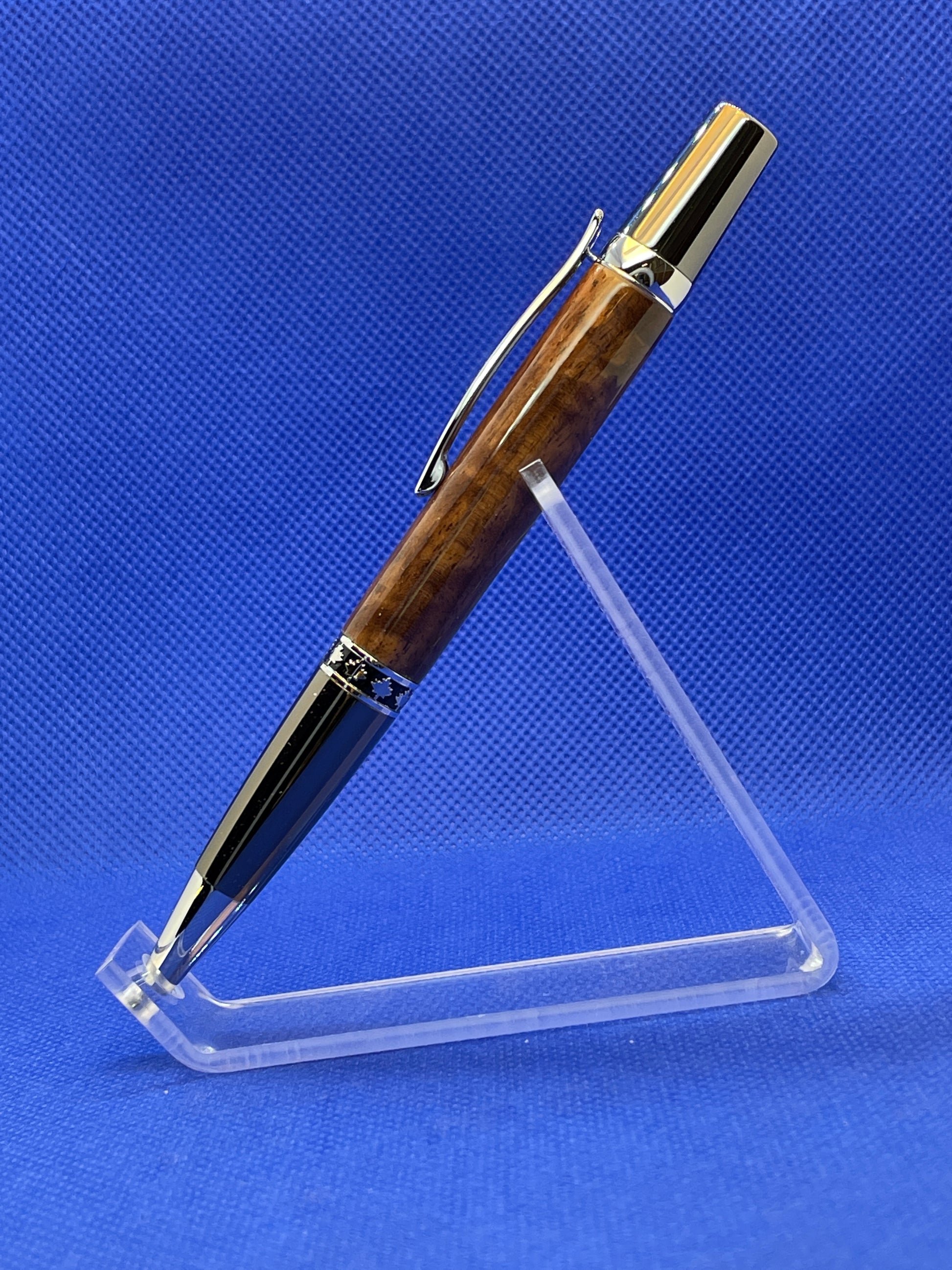 This Maple Leaf ballpoint pen features a twist mechanism, a figured walnut body, and gun metal and chrome trim with a decorative maple leaf band. This is a very well balanced and attractive pen that is perfect for everyday use. This pen uses a standard Parker refill.