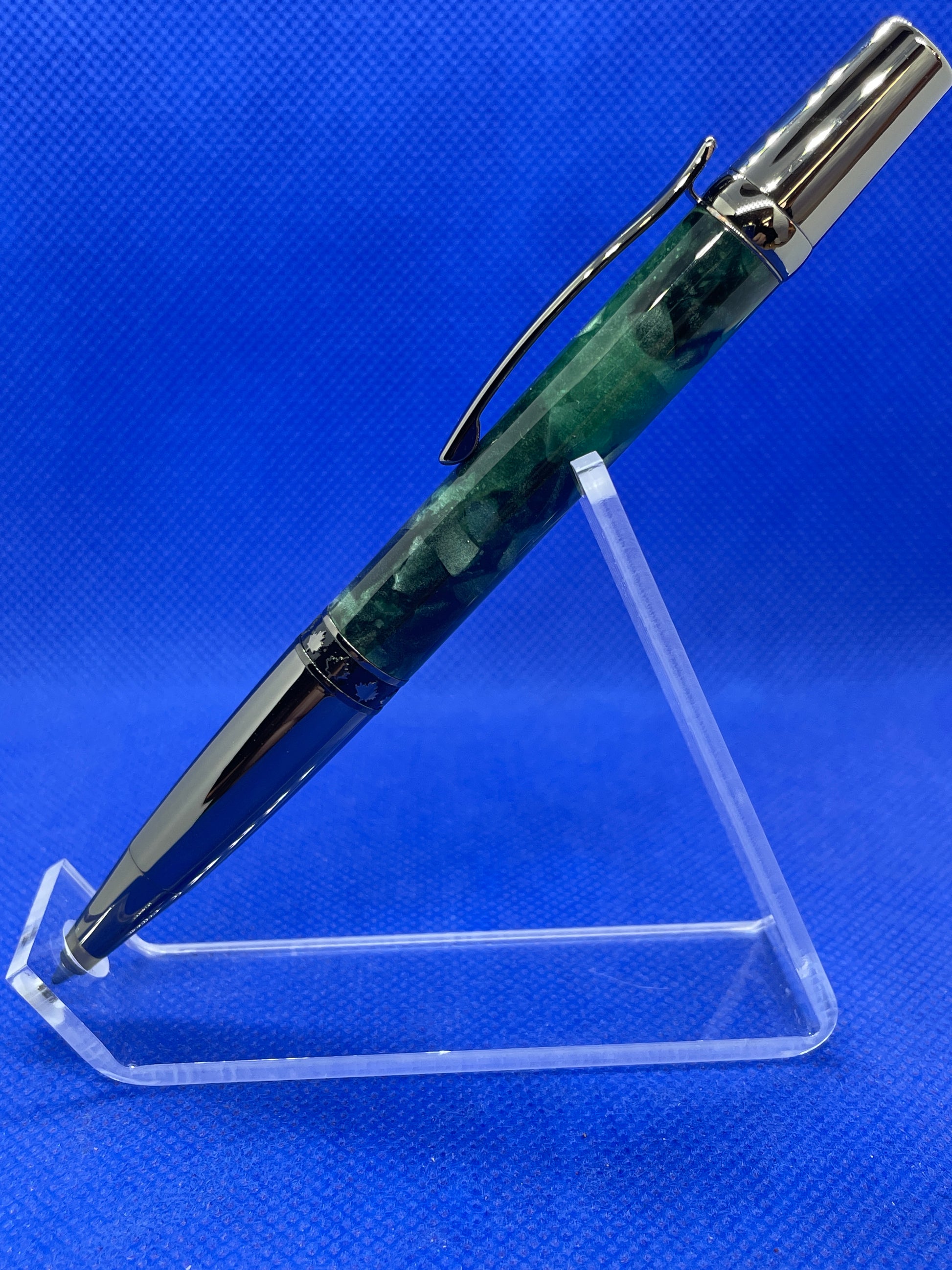 This Maple Leaf ballpoint pen features a twist mechanism, a "Midnight Forest" acrylic acetate body, and gunmetal trim with a decorative maple leaf band. This is a very well balanced and attractive pen that is perfect for everyday use. This pen uses a standard Parker refill.