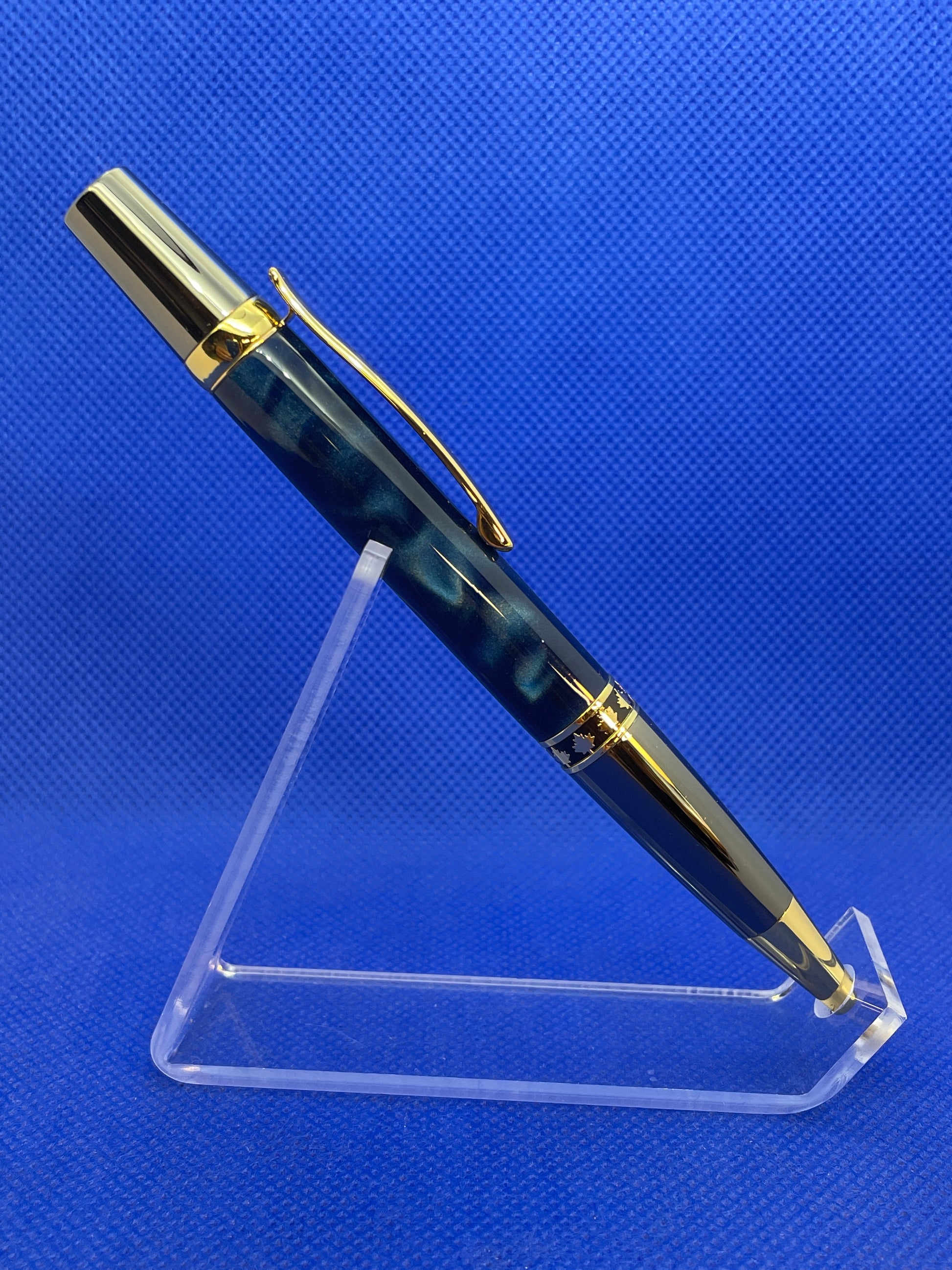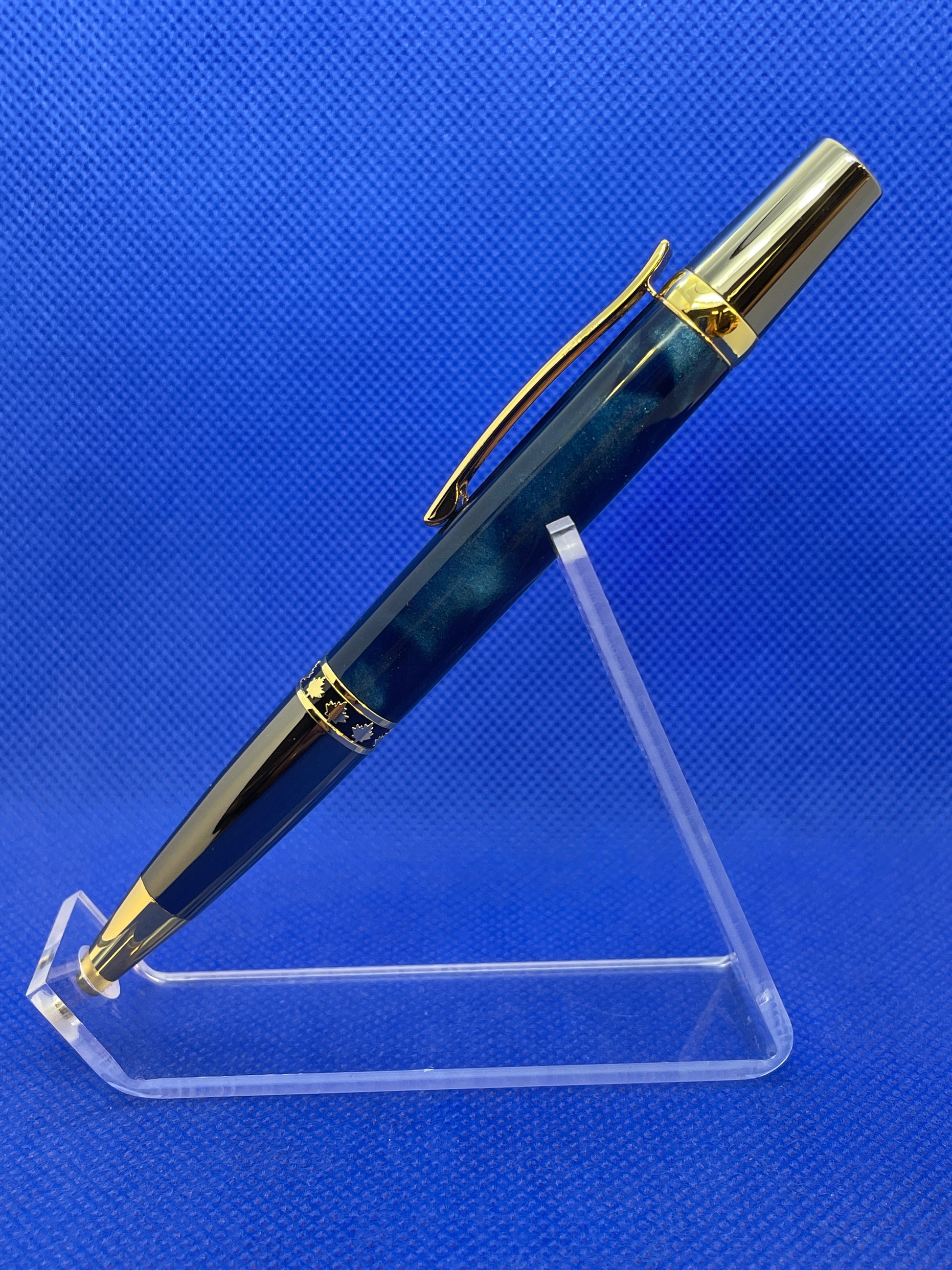 This Maple Leaf ballpoint pen features a twist mechanism, a "Blue Abyss" acrylic acetate body, and gun metal and gold trim with a decorative maple leaf band. This is a very well balanced and attractive pen that is perfect for everyday use. This pen uses a standard Parker refill.
