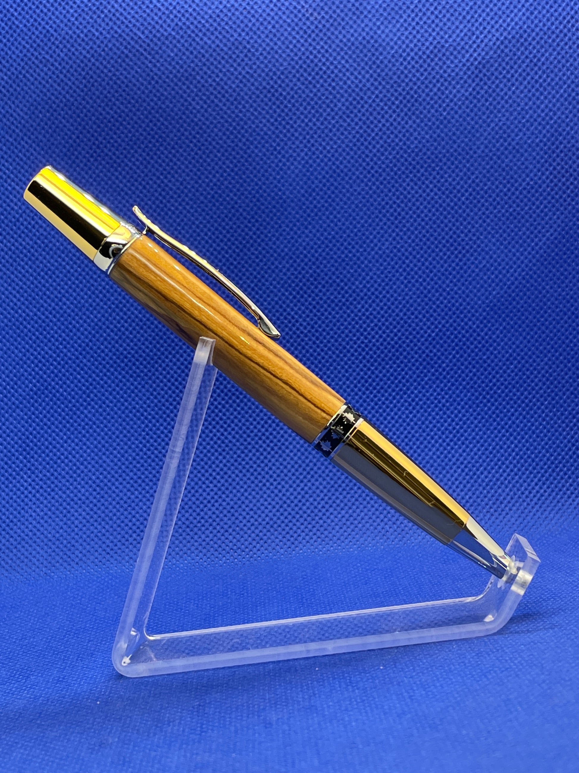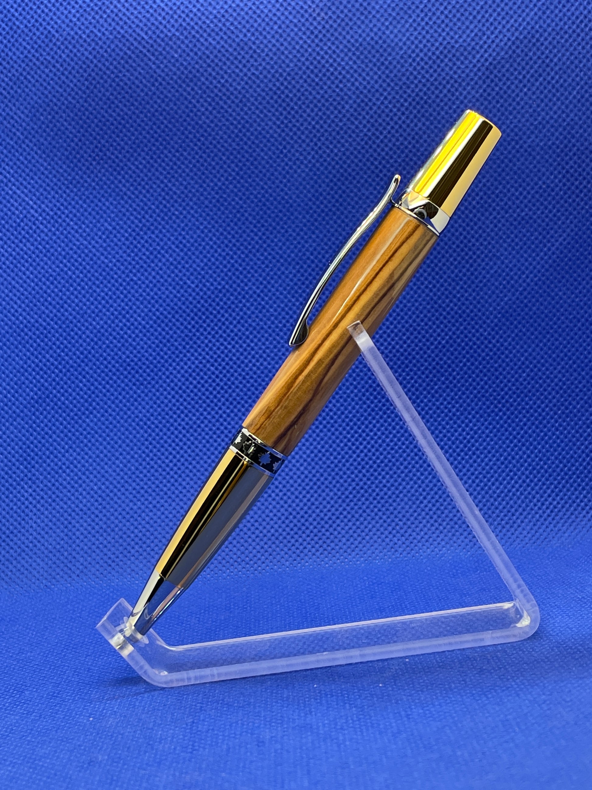 This Maple Leaf ballpoint pen features a twist mechanism, an olive wood body, and gold and chrome trim with a decorative maple leaf band. The wood in this pen is sourced from Bethlehem and comes with a certificate of authenticity. This is a very well balanced and attractive pen that is perfect for everyday use. This pen uses a standard Parker refill.