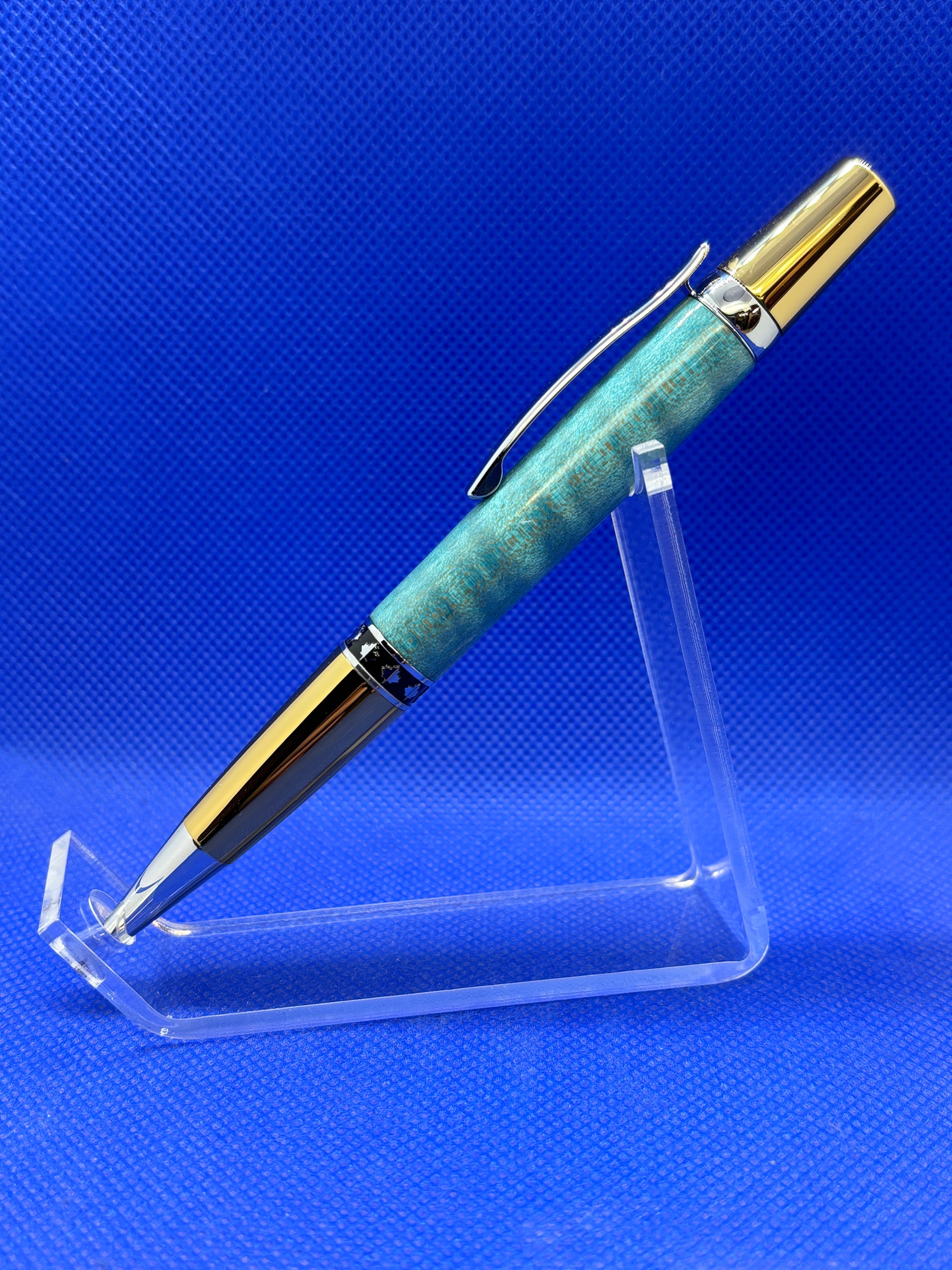 This Maple Leaf ballpoint pen features a twist mechanism, an "Ocean Blue" curly maple body, and gold and chromel trim with a decorative maple leaf band. This is a very well balanced and attractive pen that is perfect for everyday use. This pen uses a standard Parker refill.