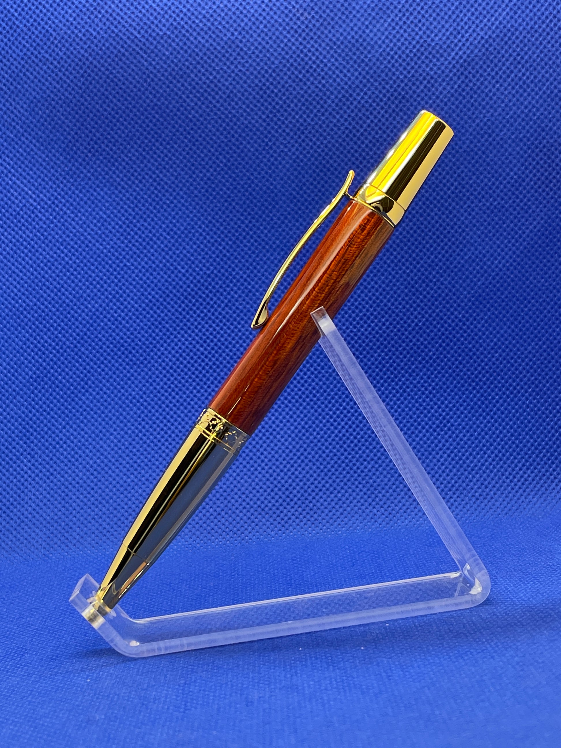 This Maple Leaf ballpoint pen features a twist mechanism, a bloodwood body, and gold trim with a decorative maple leaf band. This is a very well balanced and attractive pen that is perfect for everyday use. This pen uses a standard Parker refill.