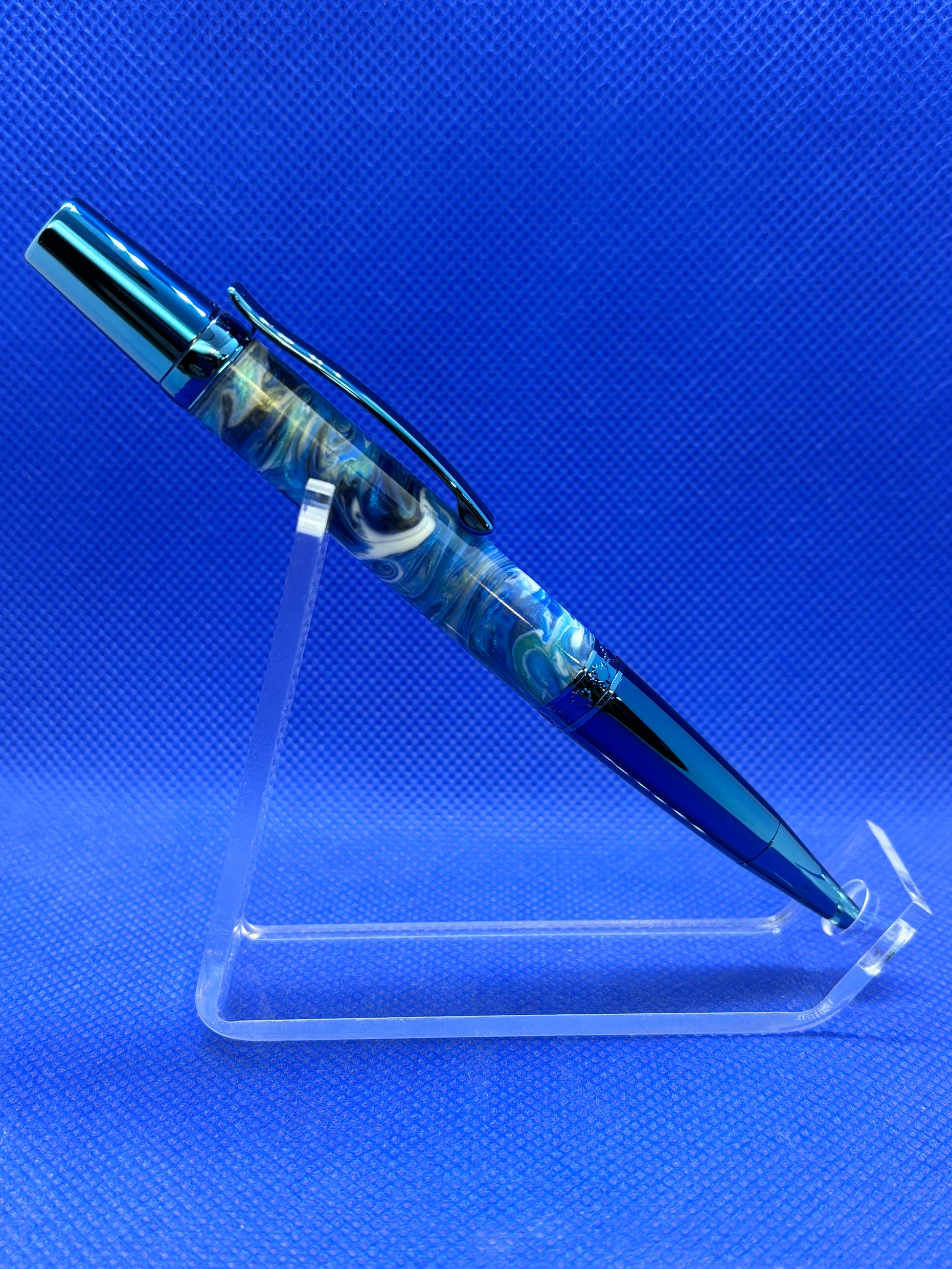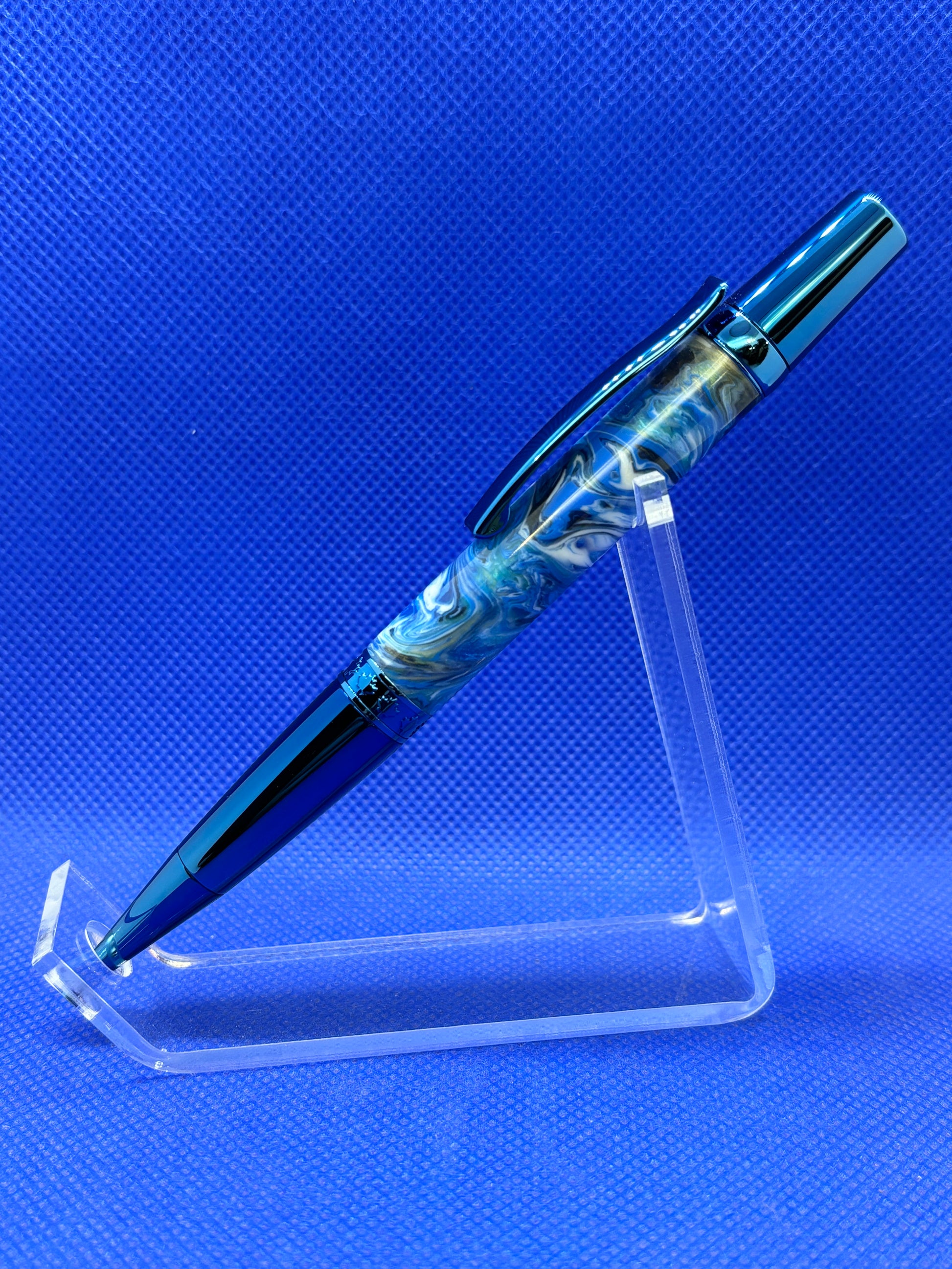 This Maple Leaf ballpoint pen features a twist mechanism, a "New Waves" resin body, and Blue Titanium trim with a decorative maple leaf band. This is a very well balanced and attractive pen that is perfect for everyday use. This pen uses a standard Parker refill.