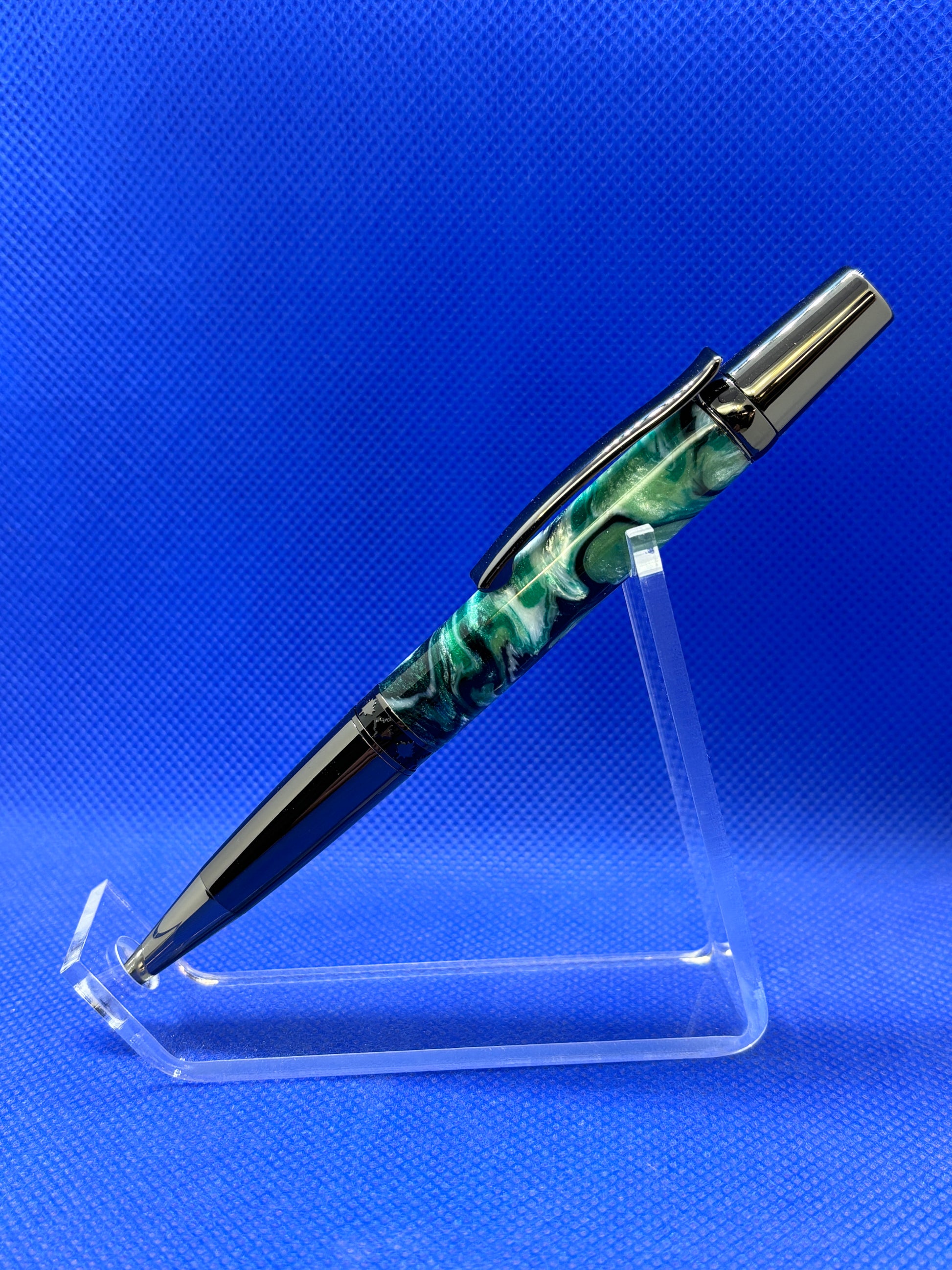 This Maple Leaf ballpoint pen features a twist mechanism, a Pearlux "Marshland" resin body, and Gun Metal trim with a decorative maple leaf band. This is a very well balanced and attractive pen that is perfect for everyday use. This pen uses a standard Parker refill.