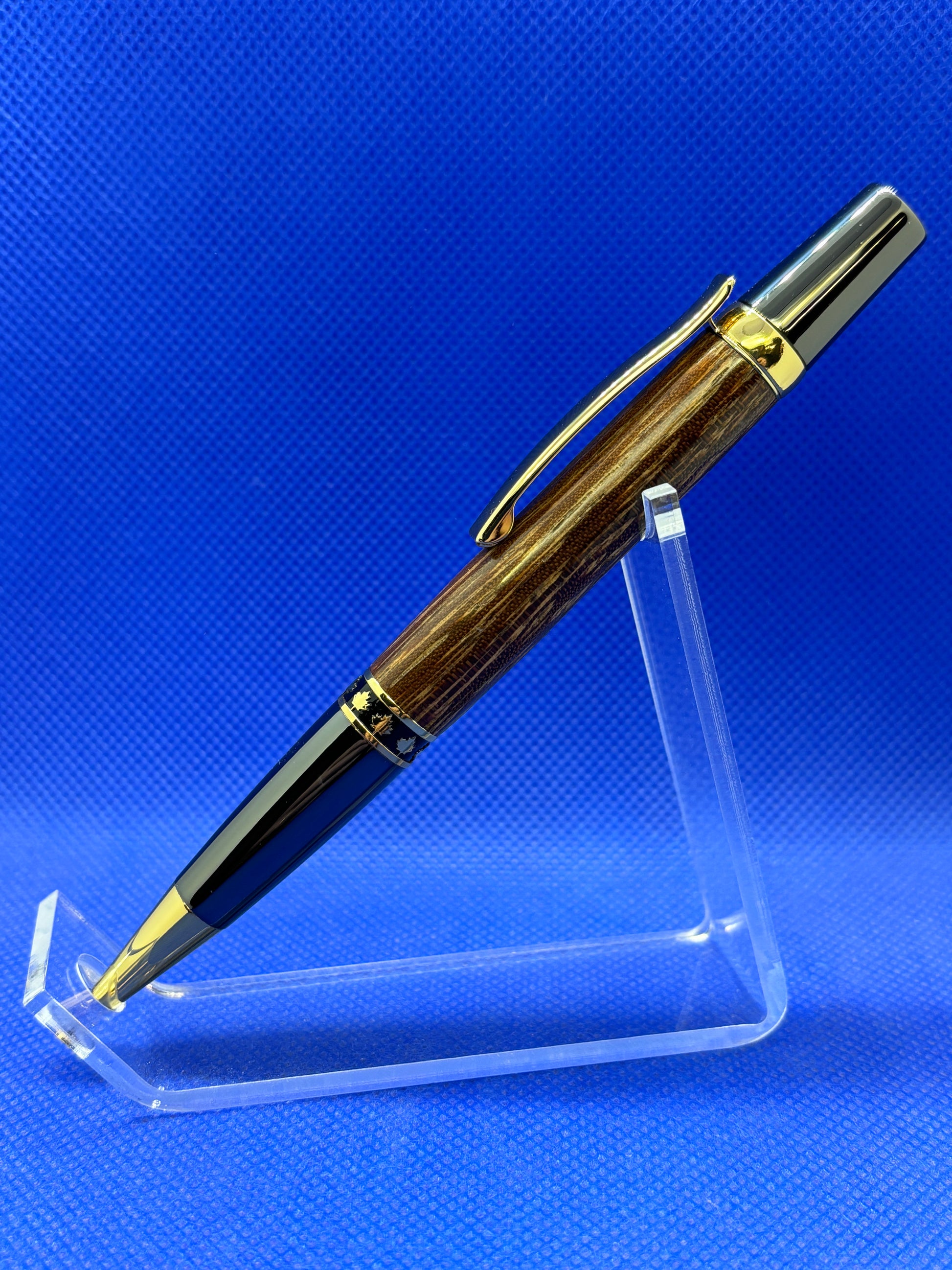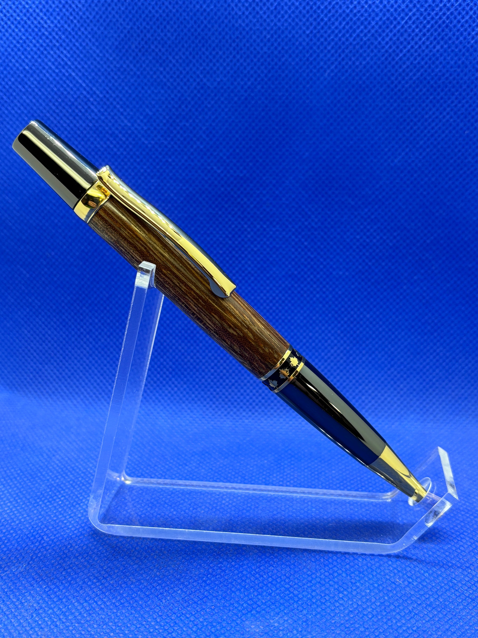 This Maple Leaf ballpoint pen features a twist mechanism, a Sucupira wood body, and Gold and Gun Metal trim with a decorative maple leaf band. This is a very well balanced and attractive pen that is perfect for everyday use. This pen uses a standard Parker refill.