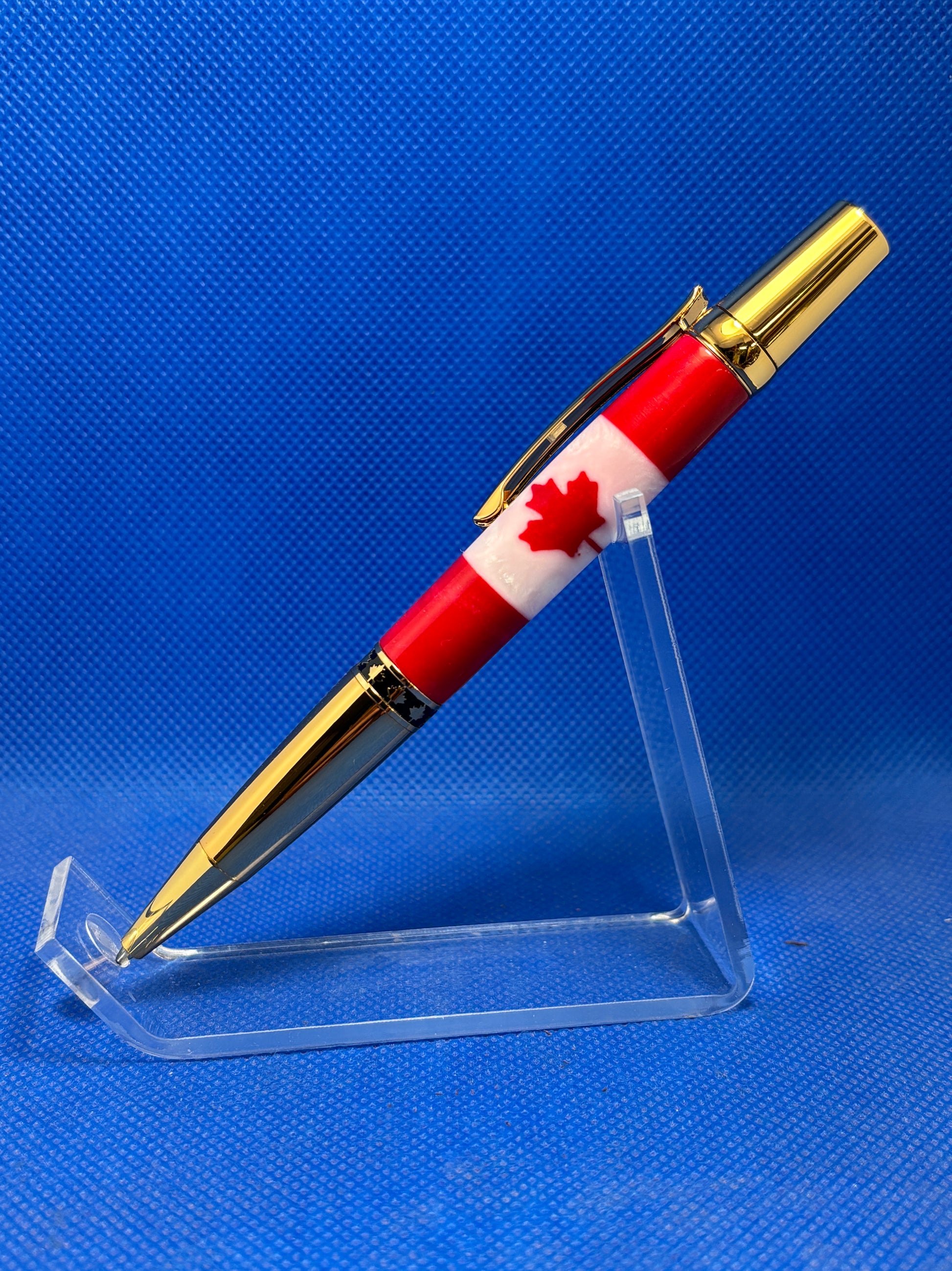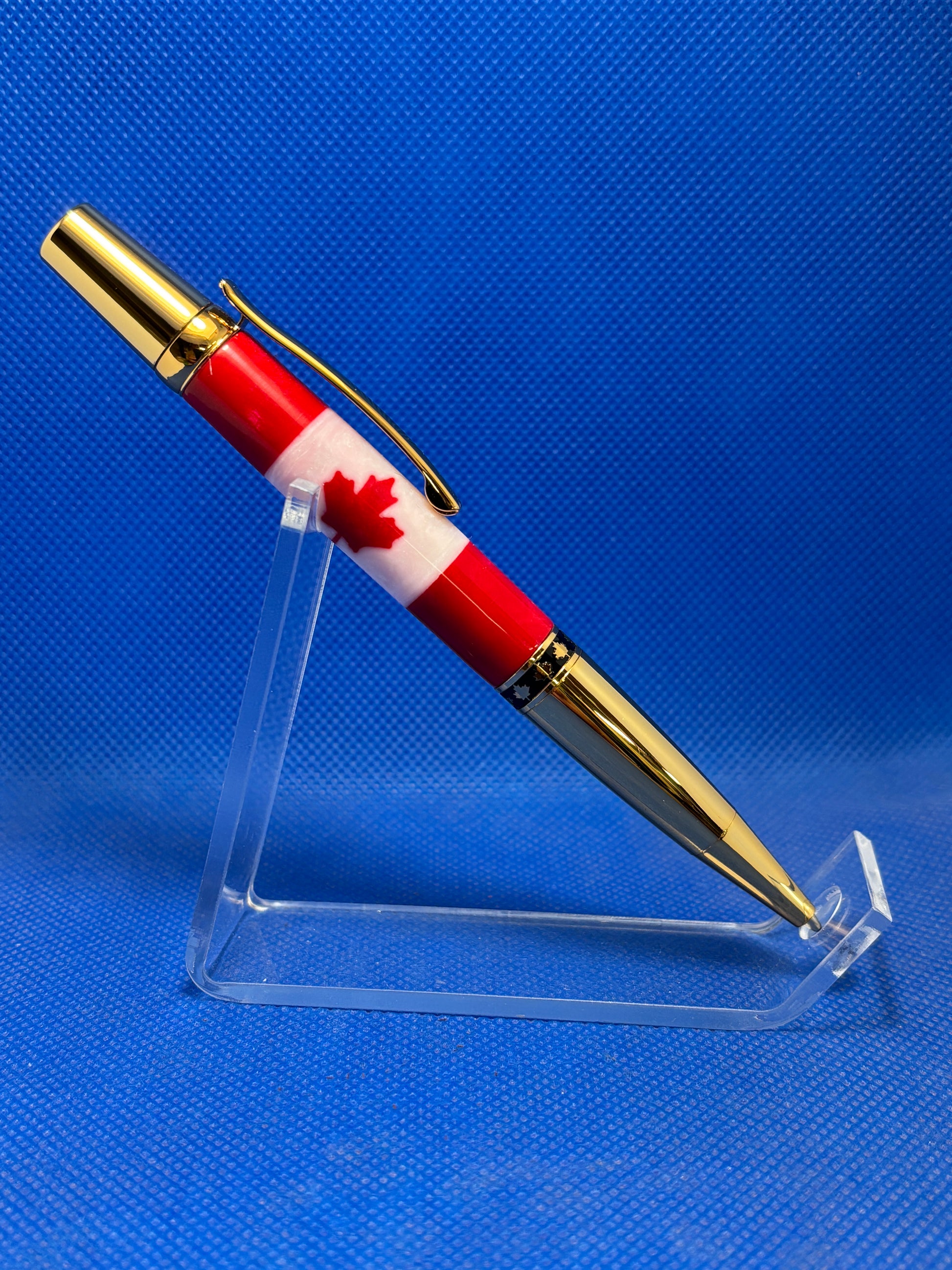 This Maple Leaf ballpoint pen features a twist mechanism, a resin body with a Canadian flag motif, and gold trim with a decorative maple leaf band. This is the perfect pen to show your love for Canada! This pen uses a standard Parker refill.