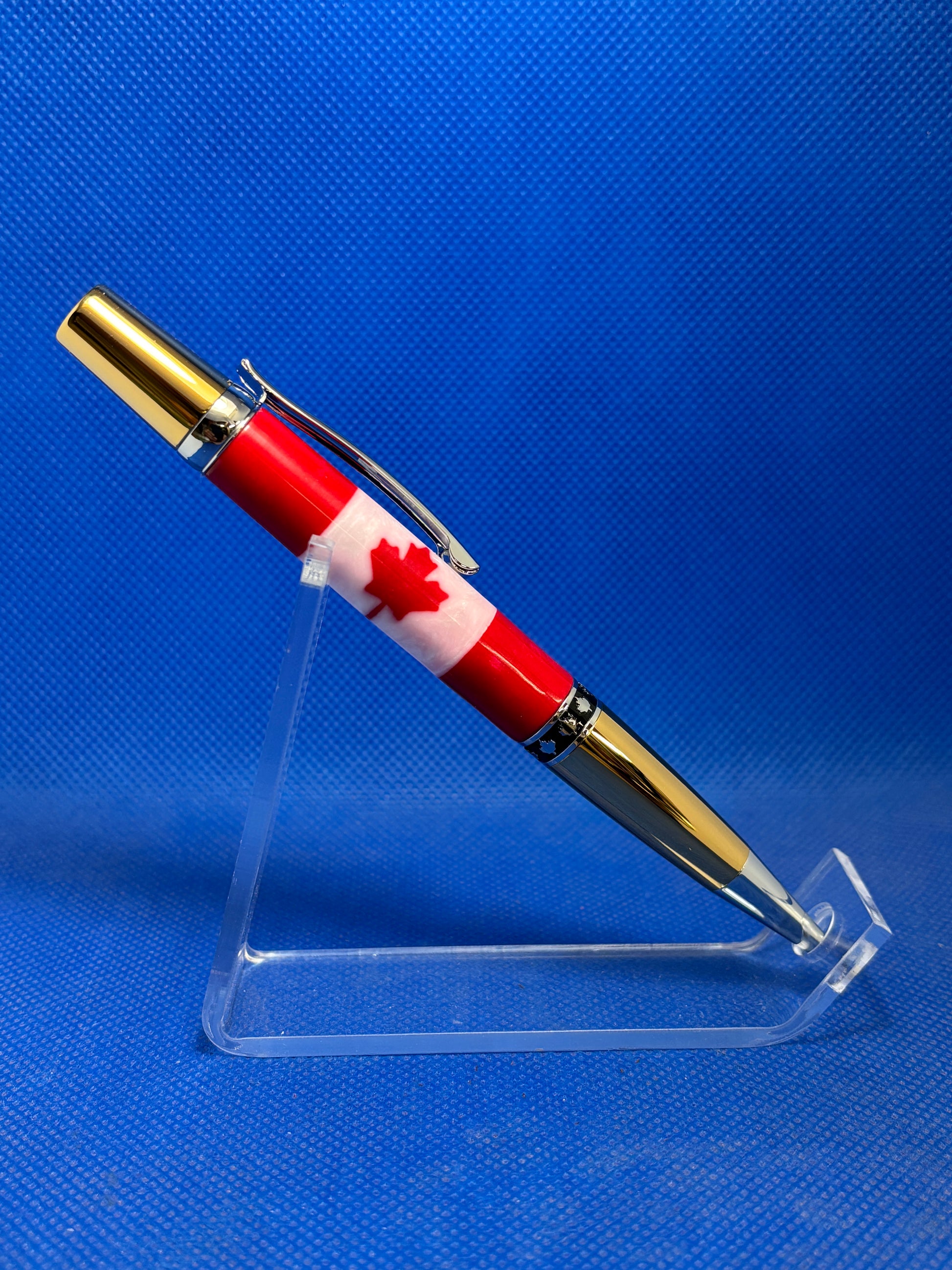 This Maple Leaf ballpoint pen features a twist mechanism, a resin body with a Canadian flag motif, and gold and chrome trim with a decorative maple leaf band. This is the perfect pen to show your love for Canada! This pen uses a standard Parker refill.