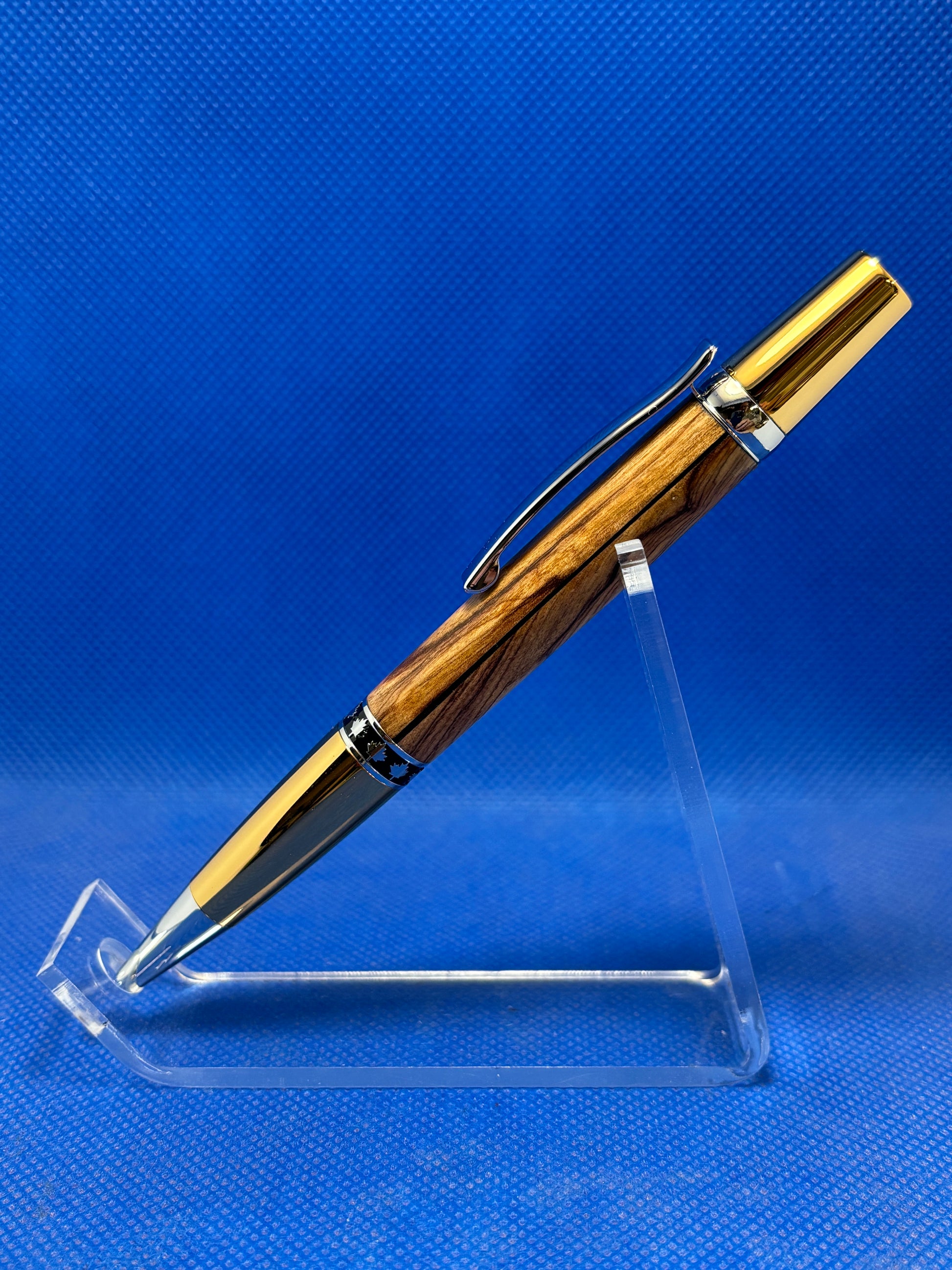 This Maple Leaf ballpoint pen features a twist mechanism, and a body made of Olive wood from Bethlehem with a black veneer inlay detail. It also has gold and chrome trim, and a decorative maple leaf band. This pen comes with a certificate of authenticity to verify that the wood was sustainably harvested from an olive tree grown in Bethlehem. This is a very well balanced and attractive pen that is perfect for everyday use. This pen uses a standard Parker refill.
