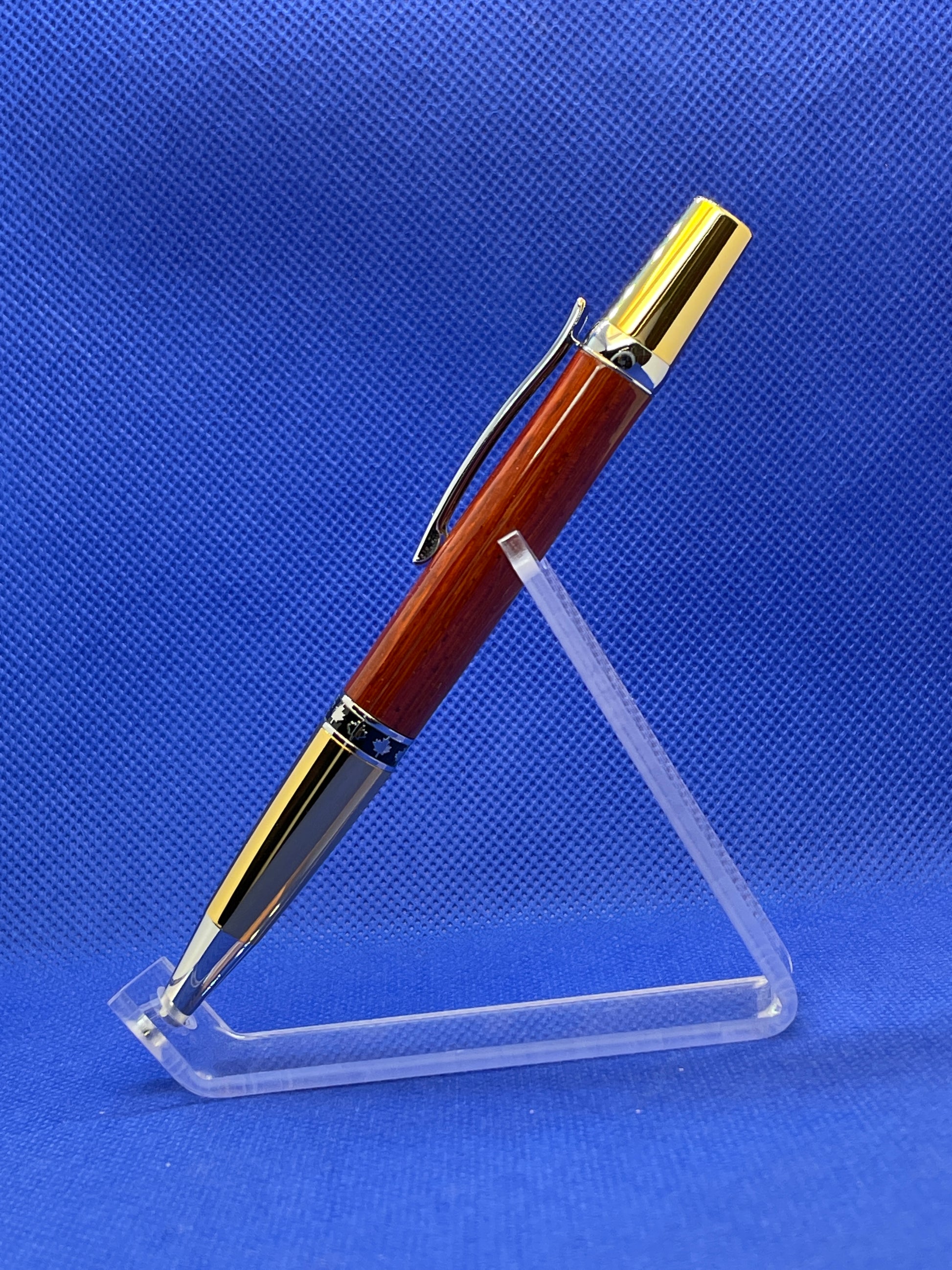 This Maple Leaf ballpoint pen features a twist mechanism, a redheart wood body, and gold and chrome trim with a decorative maple leaf band. This is a very well balanced and attractive pen that is perfect for everyday use. This pen uses a standard Parker refill.