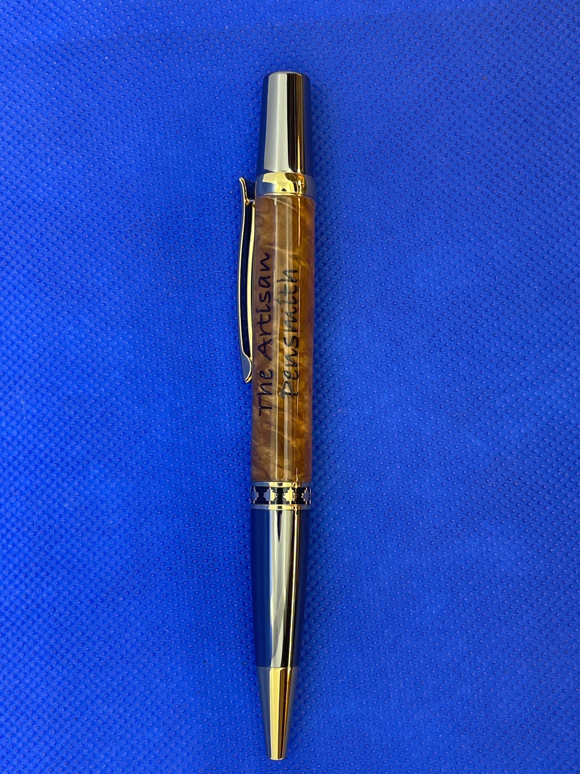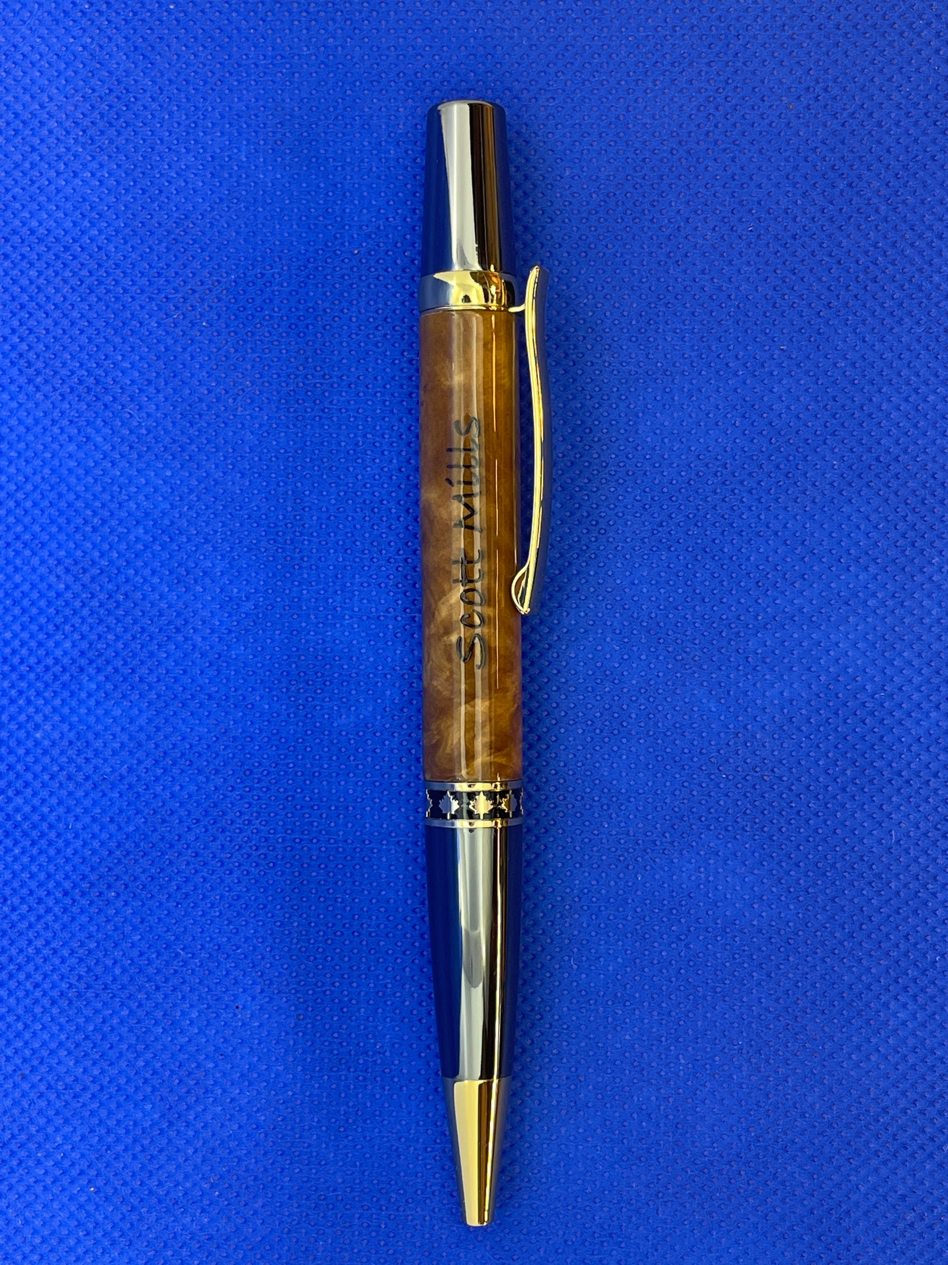 This Maple Leaf ballpoint pen features a Brown Mallee Burl body with Gun Metal and Gold trim. The body has been laser engraved on two sides. This is a feature that is available on any custom ordered pen.