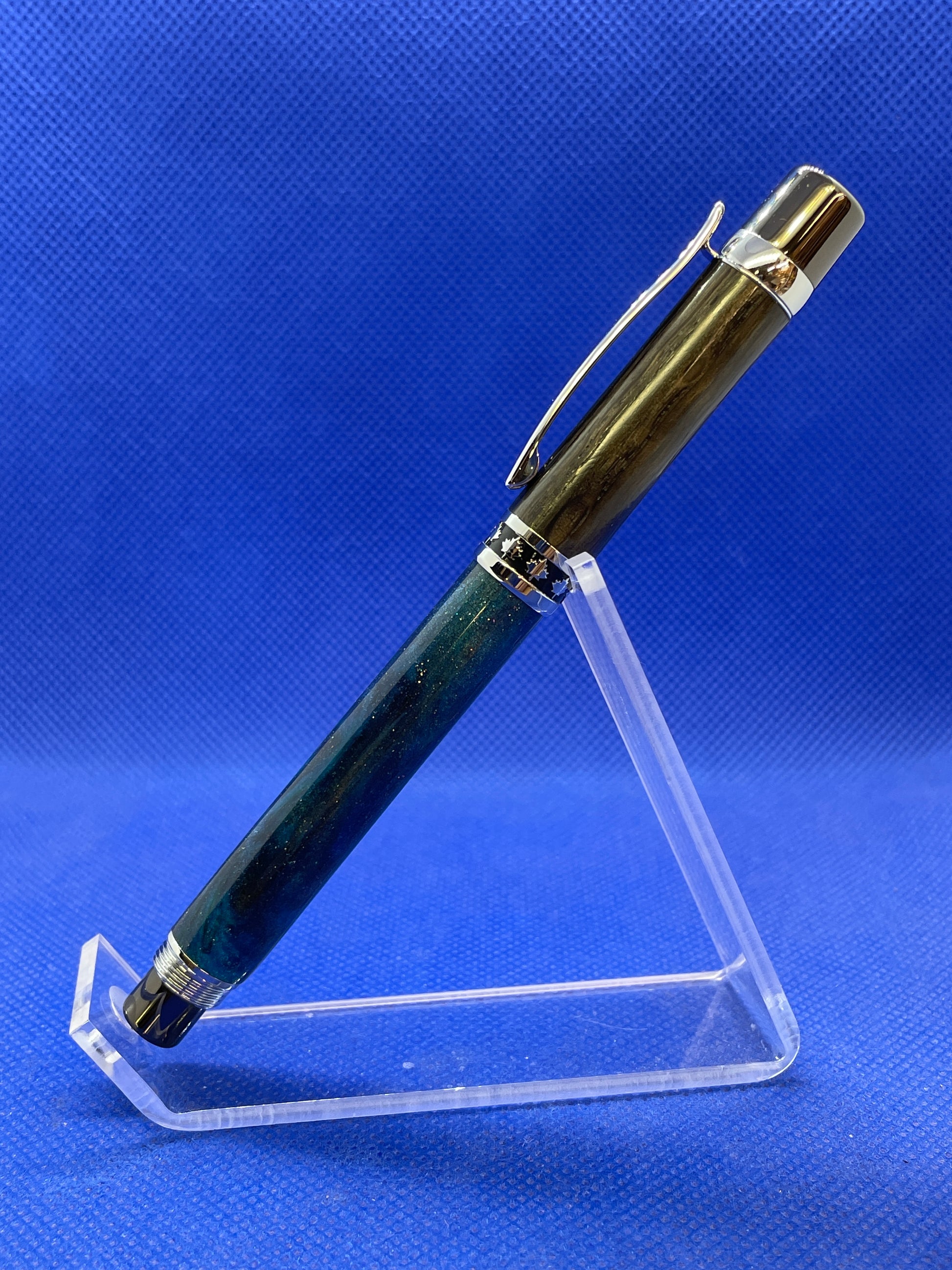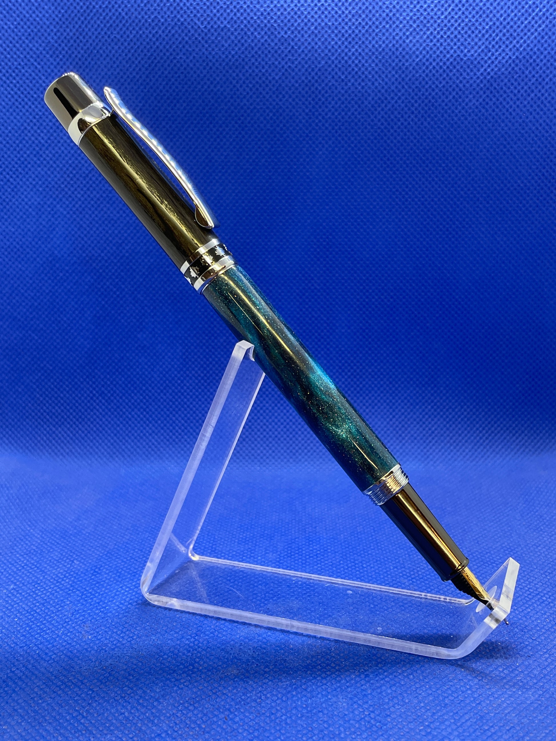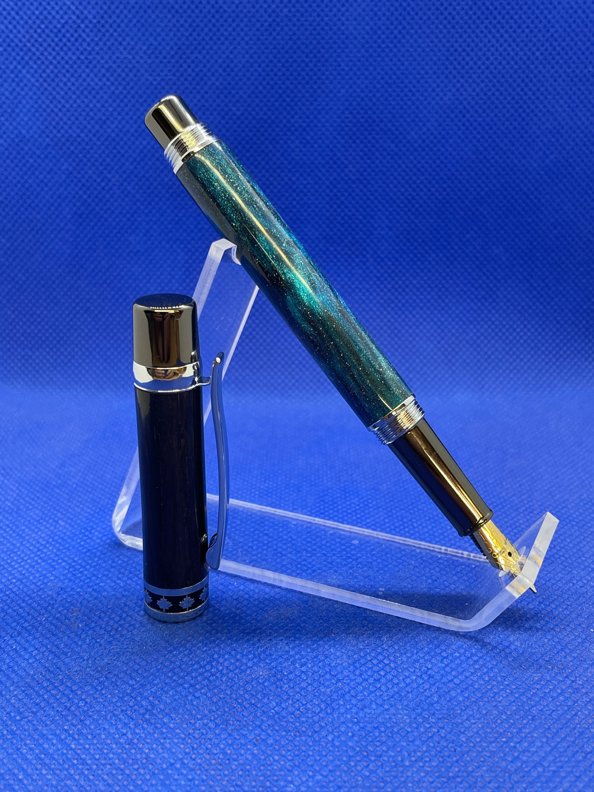 This fountain pen features gun metal and chrome metal work and a combination of a DiamondCast "Abyss" resin body and a cap made from 5500 year old Ukrainian bog oak. The centre band has a maple leaf motif and the two-tone nib is iridium tipped. DiamondCast resin contains real diamond flakes that have been collected from the gem cutting industry. The combination of the DiamondCast body and the dark black ancient bog oak make for a truly stunning piece. This pen uses standard ink cartridges or the included ink pump for use with bottled ink.