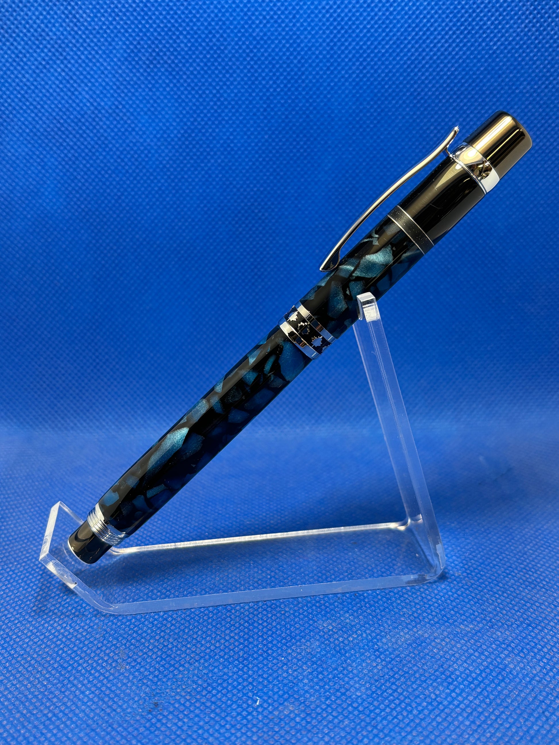 This fountain pen features gunmetal and chrome metal work and an "Outer Space" acrylic acetate body with an aluminum insert. The centre band has a maple leaf motif and the two-tone nib is iridium tipped. This pen uses standard ink cartridges or the included ink pump for use with bottled ink.