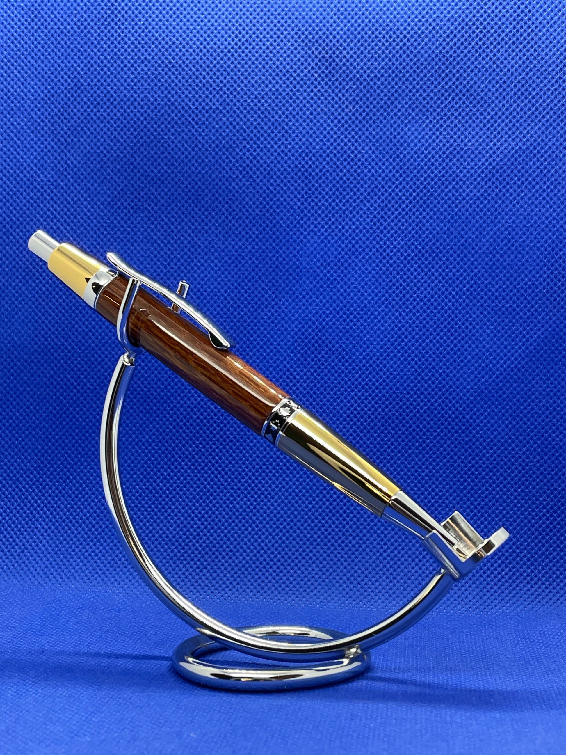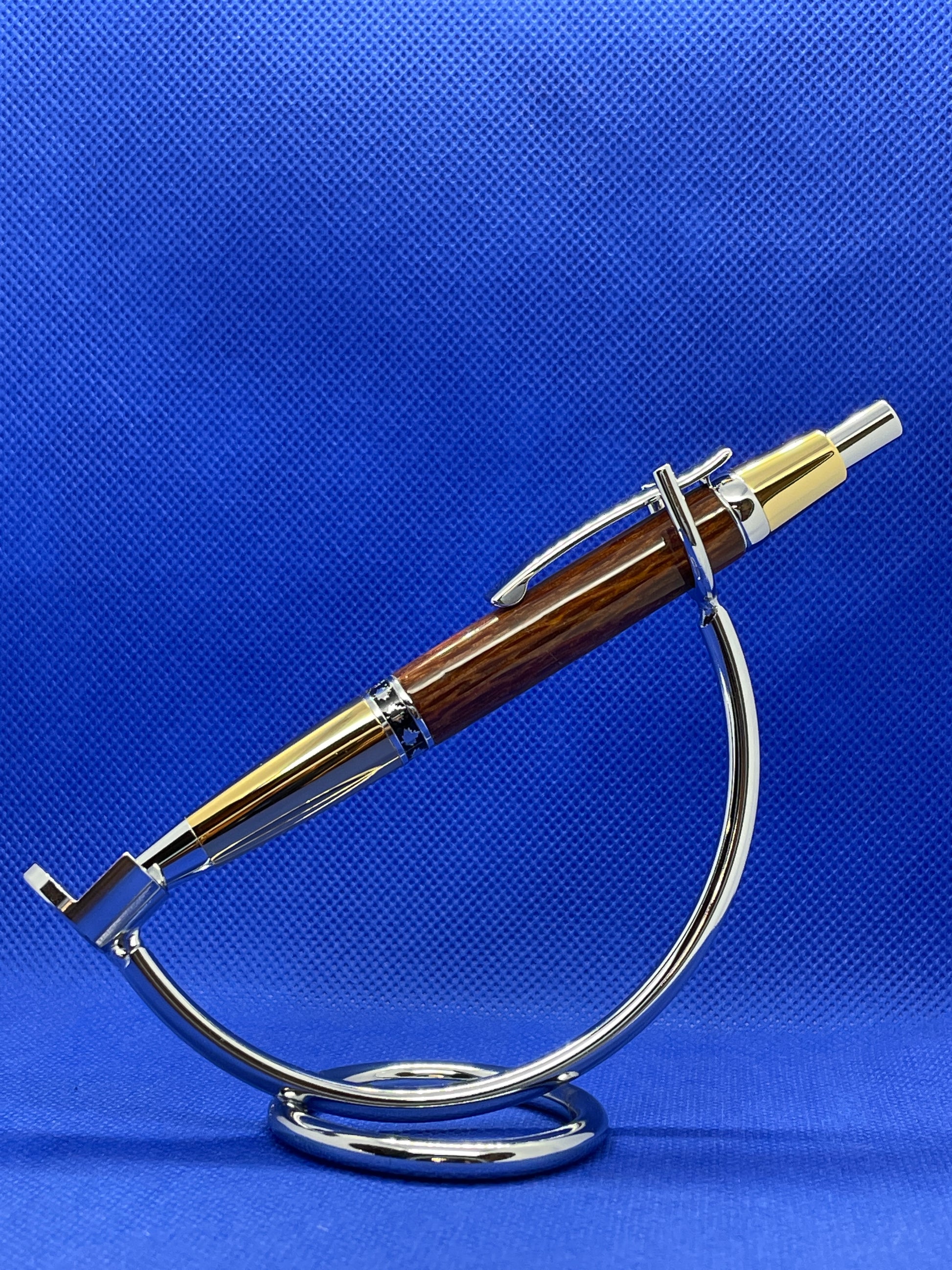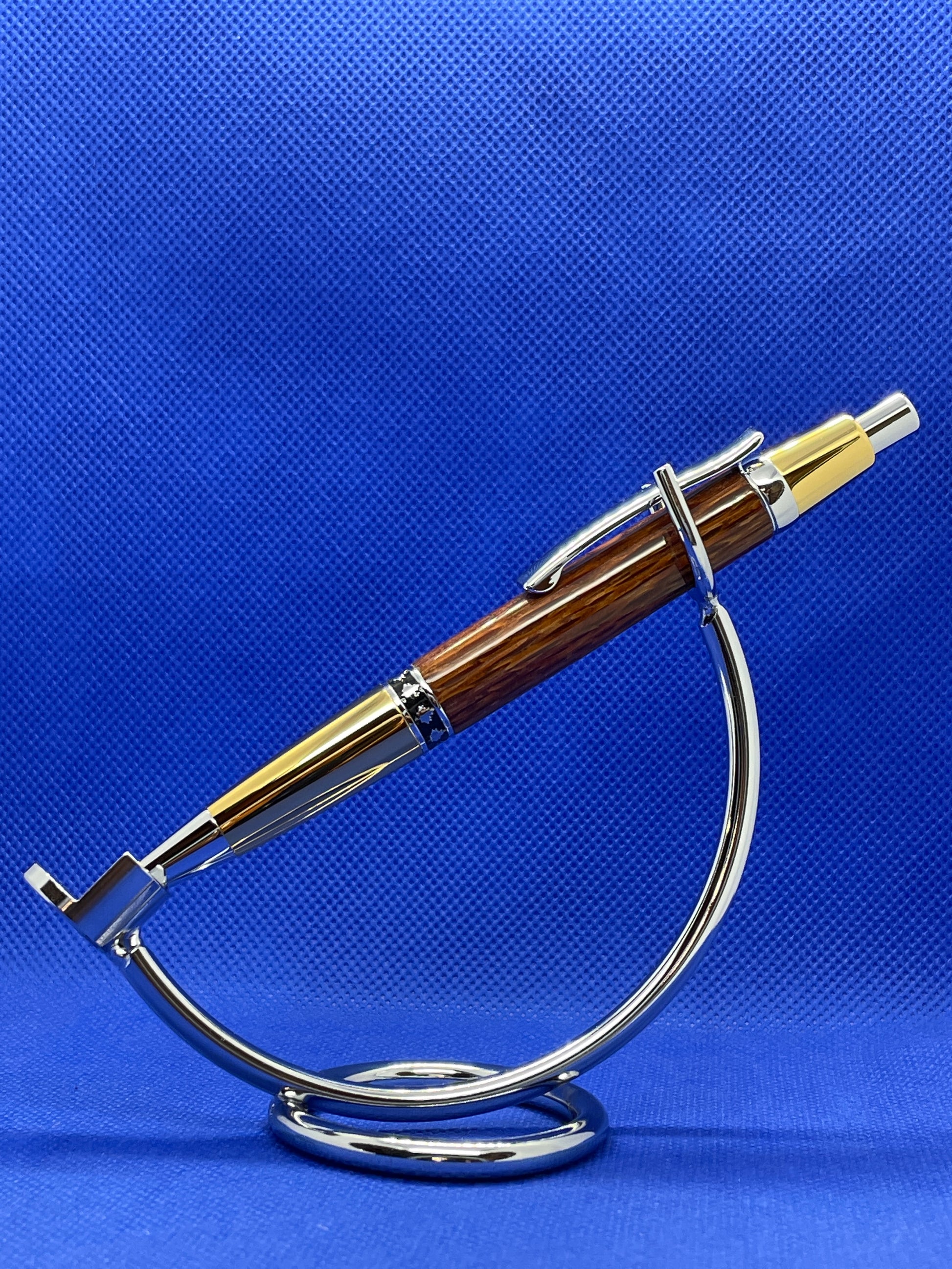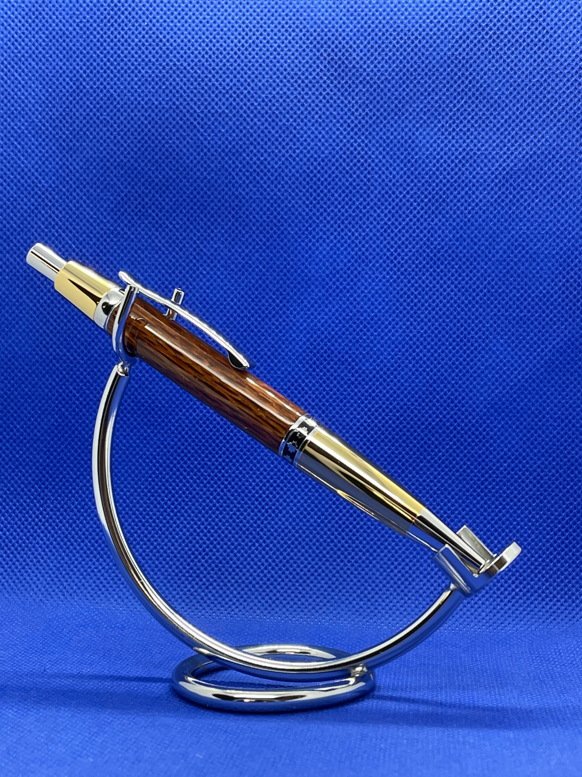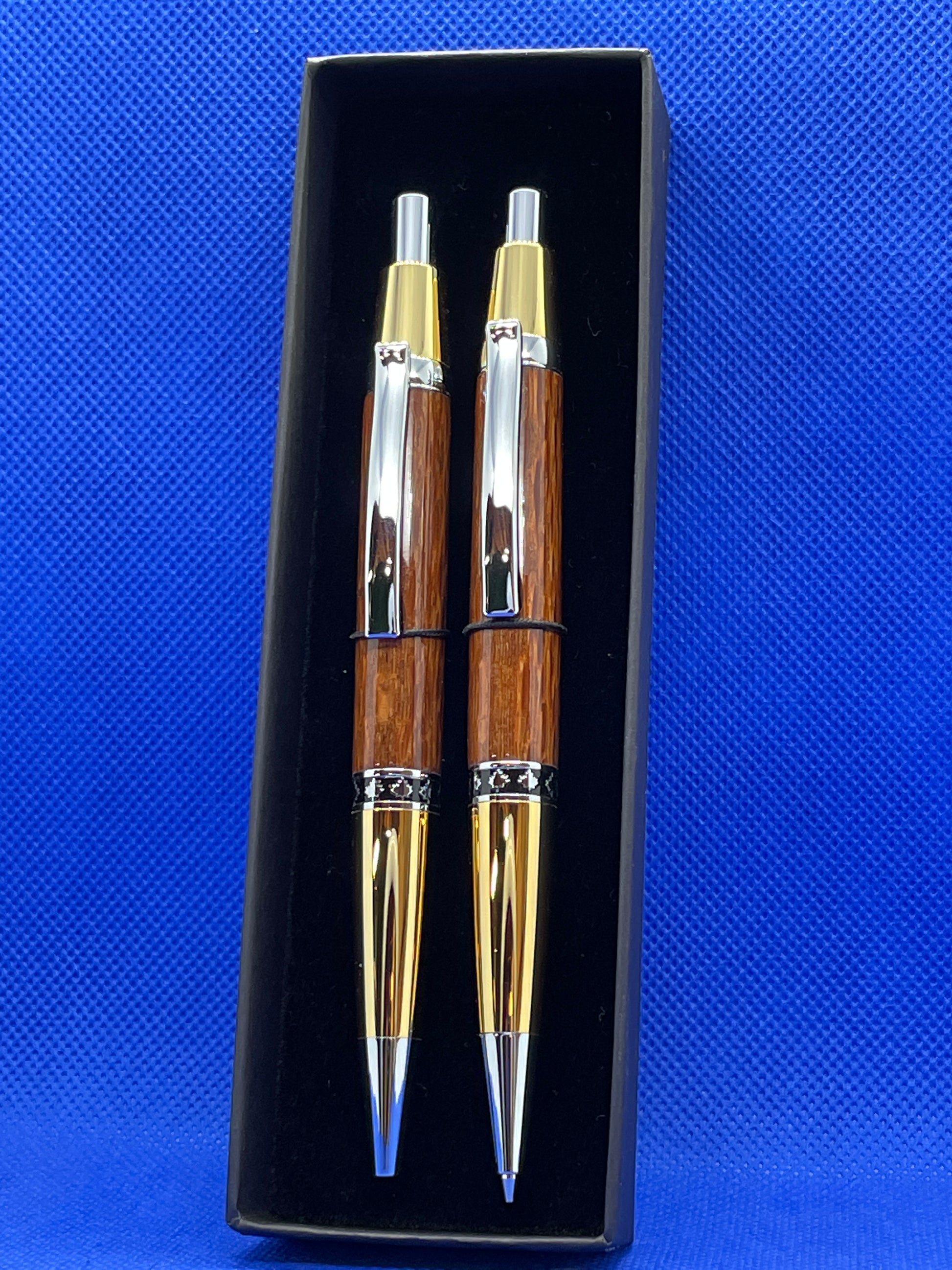 This matching pen and pencil set has a Maple Leaf click pen and a 7mm mechanical pencil. Both are made from a single piece of stunning Leopard wood and feature gold and chrome trim with maple leaf detailing on the centre band. The pen uses standard Parker style refills and the pencil uses standard 7mm lead refills.