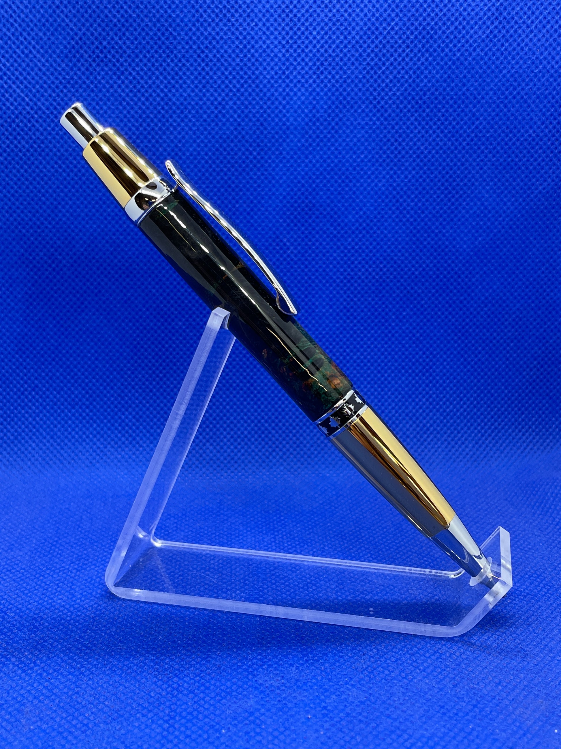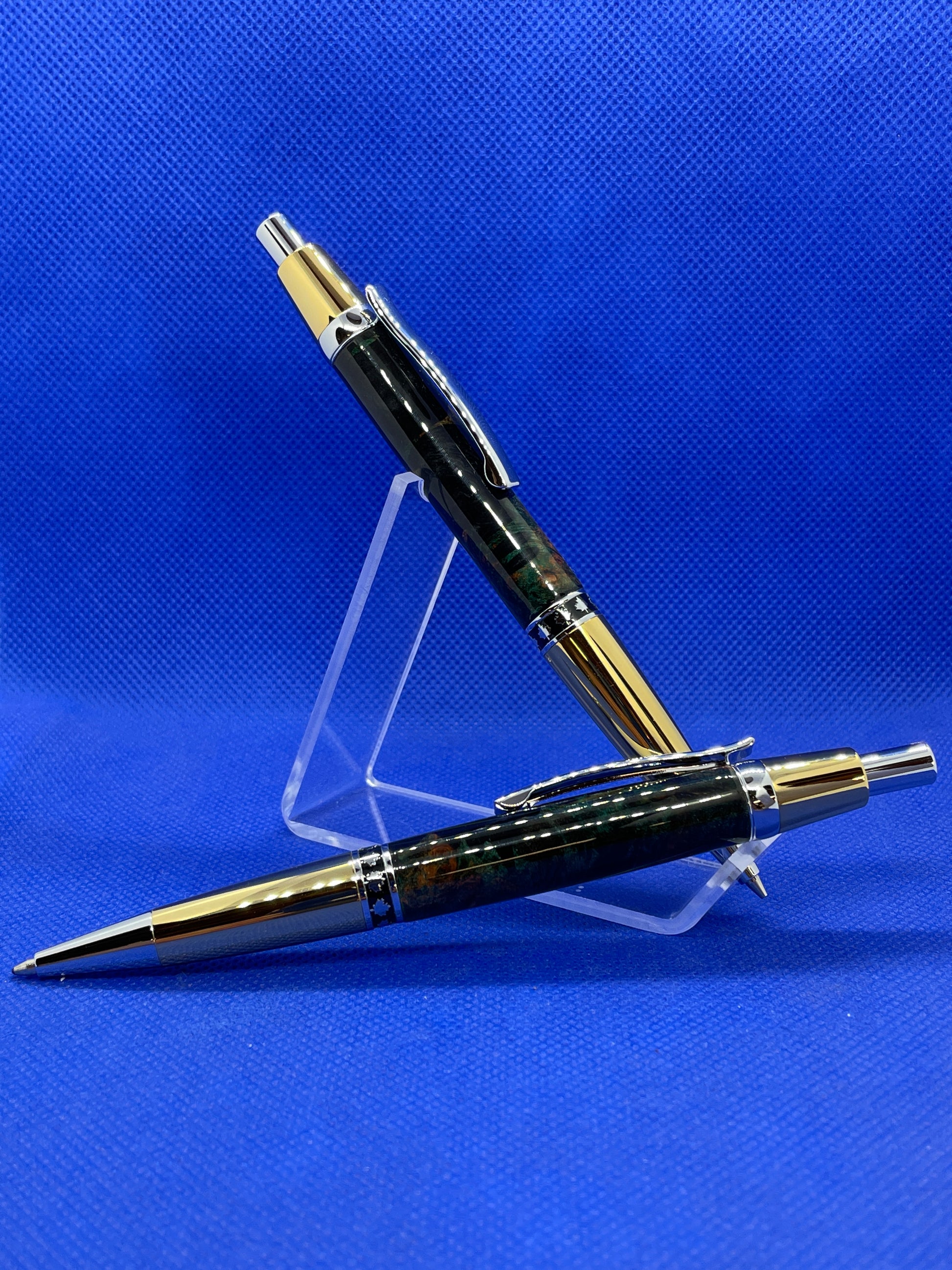 This matching pen and pencil set has a Maple Leaf click pen and a 7mm mechanical pencil. Both are made from a green and black "Mirkwood" burl and resin hybrid blank and feature gold and chrome trim with maple leaf detailing on the centre band. The pen uses standard Parker style refills and the pencil uses standard 7mm lead refills.