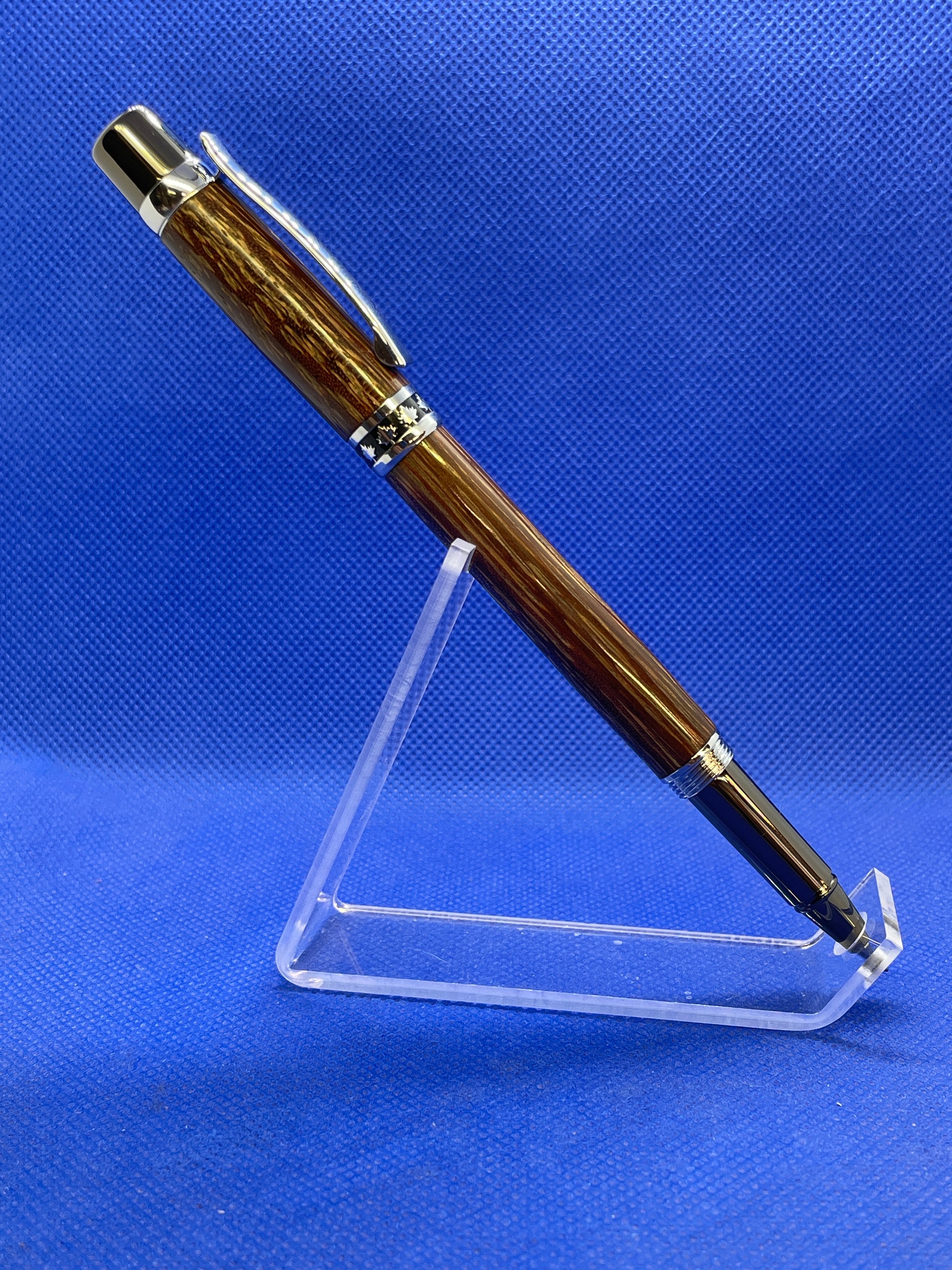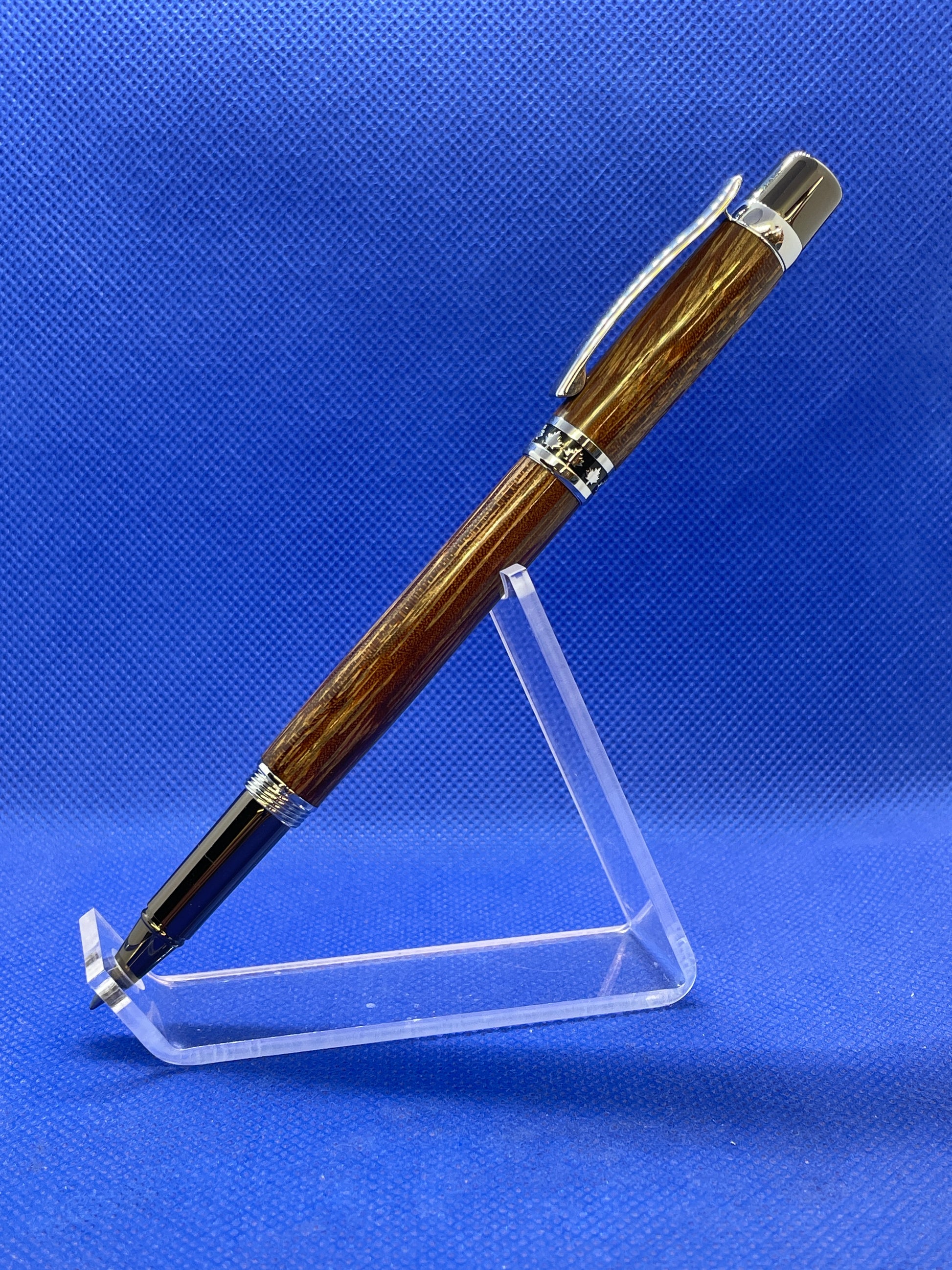 This rollerball pen features gun metal and chrome metal work and a heavily figured Black Walnut body. The centre band also has a chrome and black maple leaf motif. This pen uses standard Schmidt style rollerball refills.