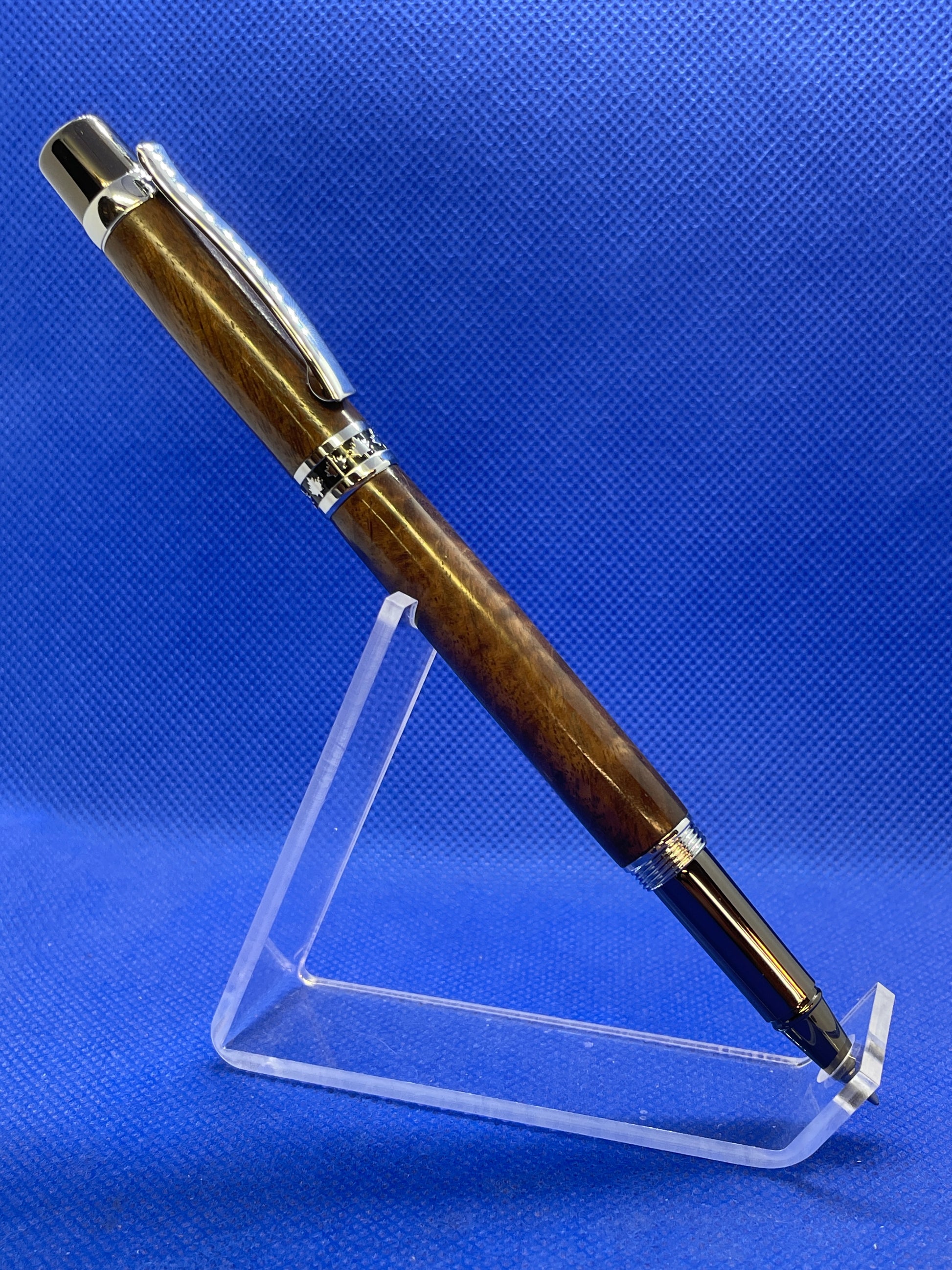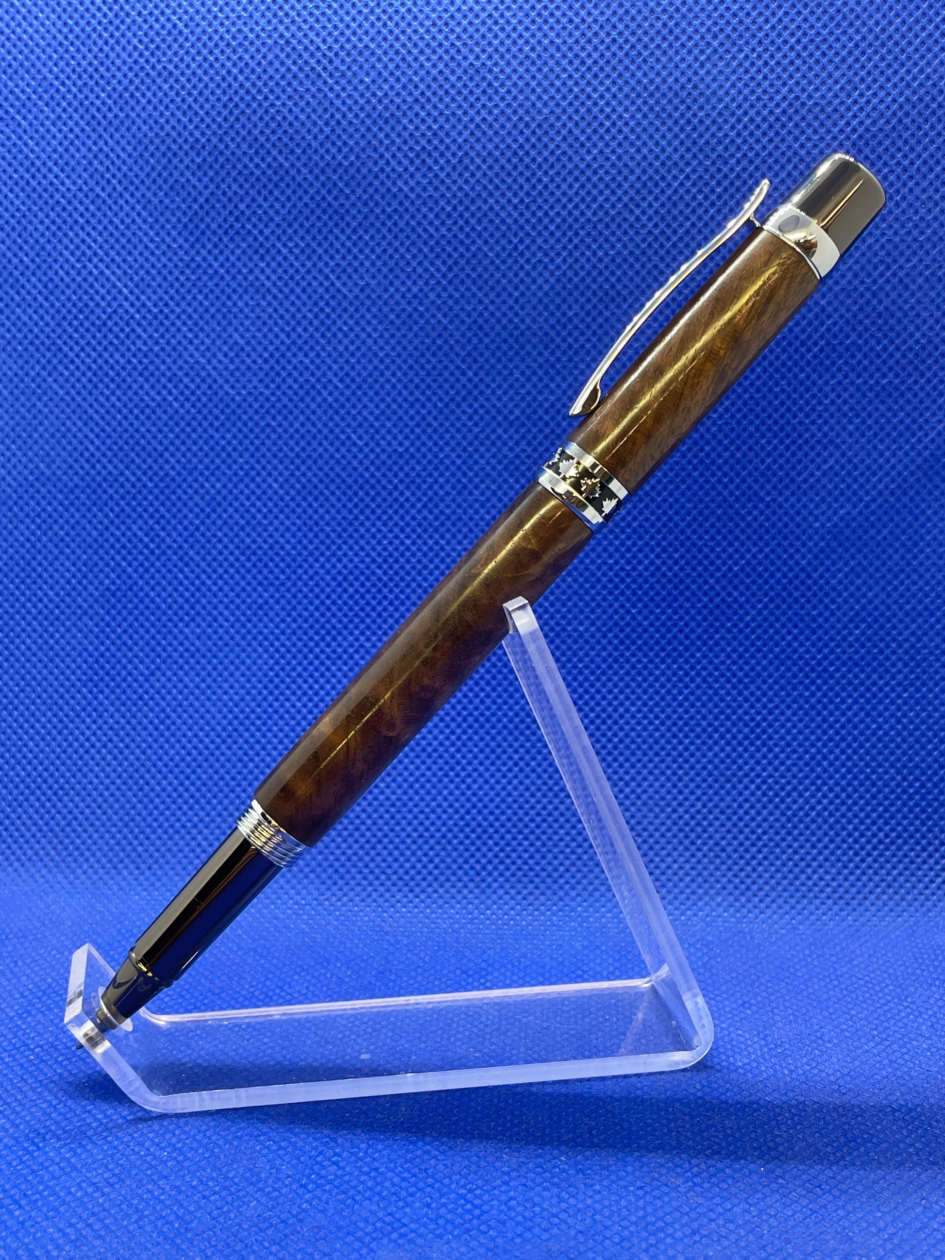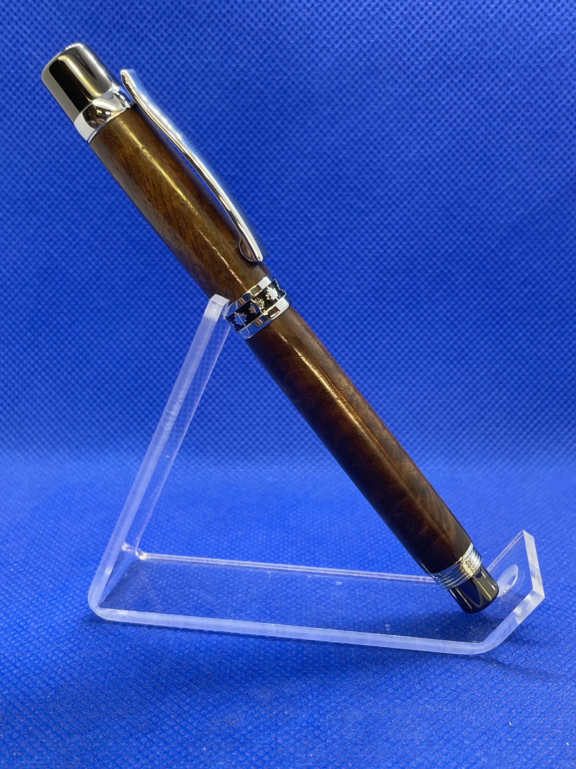 This rollerball pen features gun metal and chrome metal work and a dramatic Sucupira wood body. The centre band also has a chrome and black maple leaf motif. This pen uses standard Schmidt style rollerball refills.