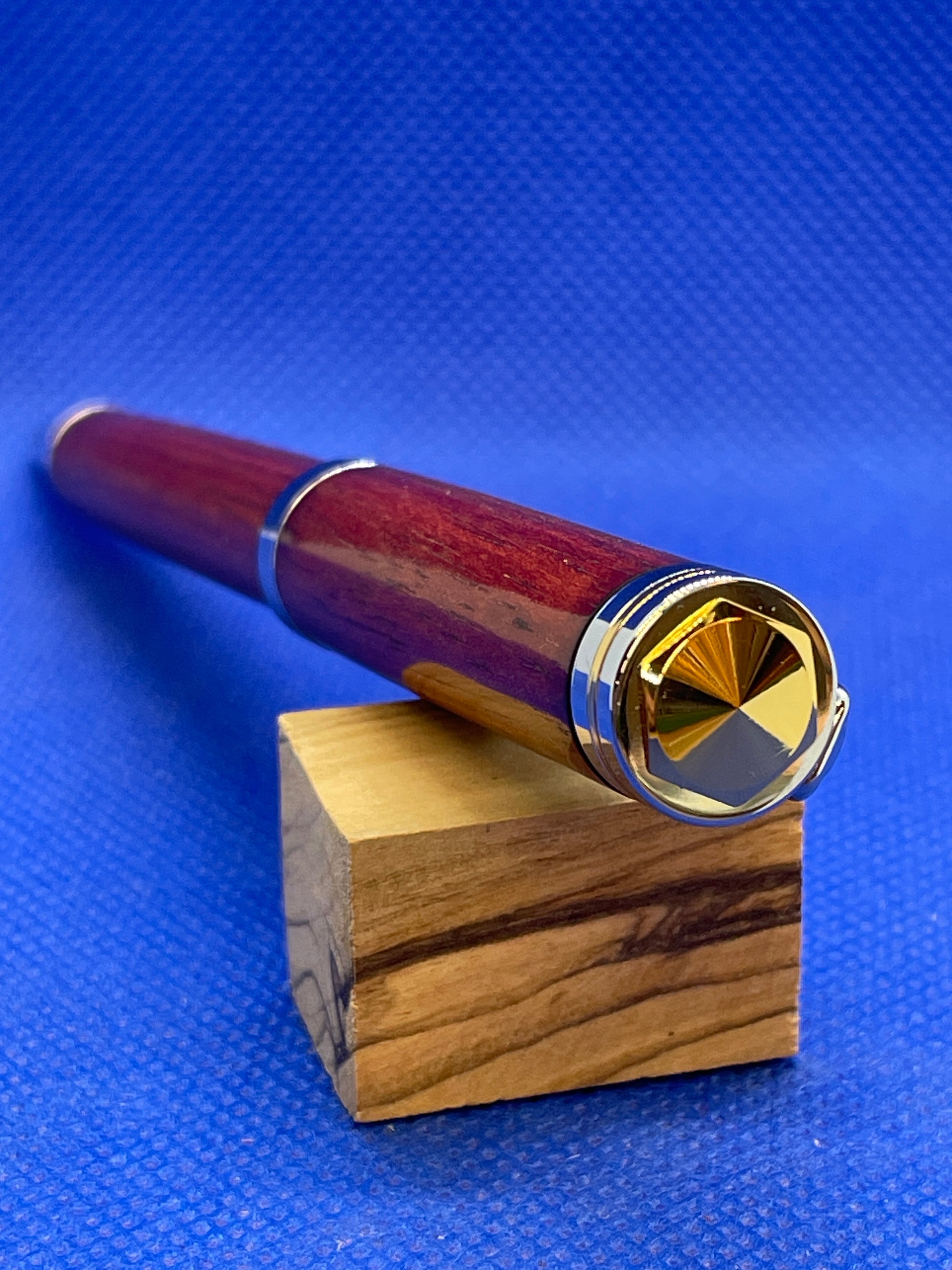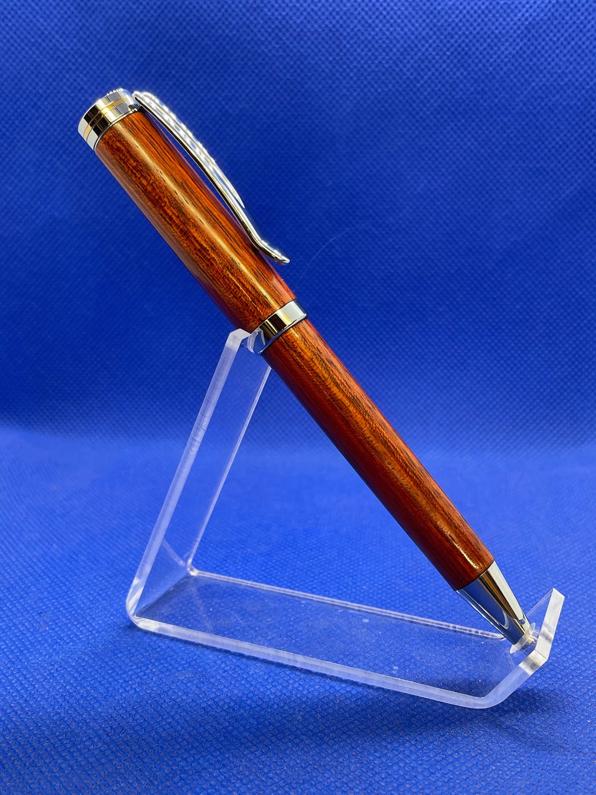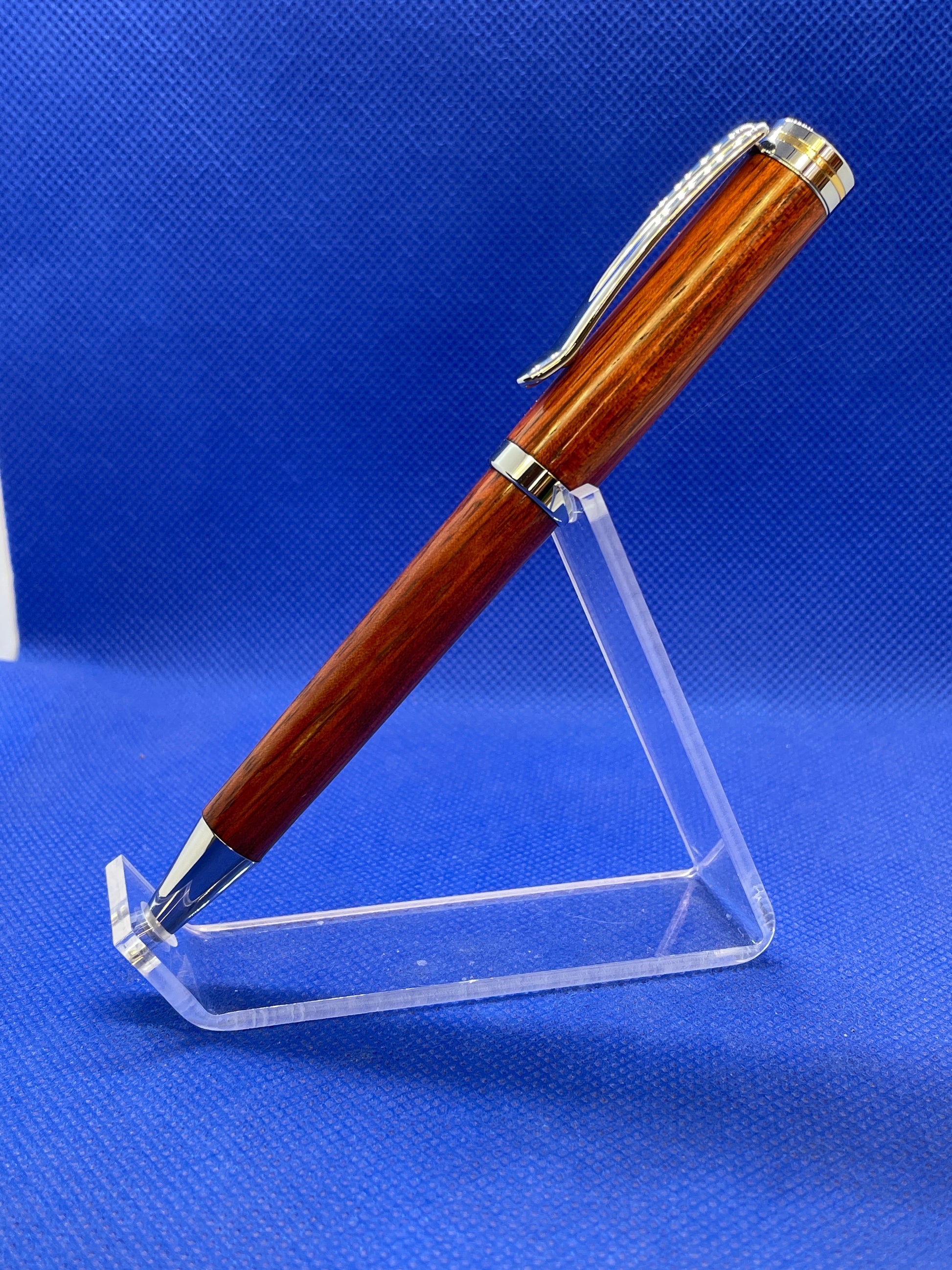 This Marquis ballpoint pen features chrome trim and a beautiful Bloodwood body. The gold highlights on this pen are a 3U gold plating, which is a thicker, more durable plating than 10K or 24K gold. It uses standard "Parker" style refills.