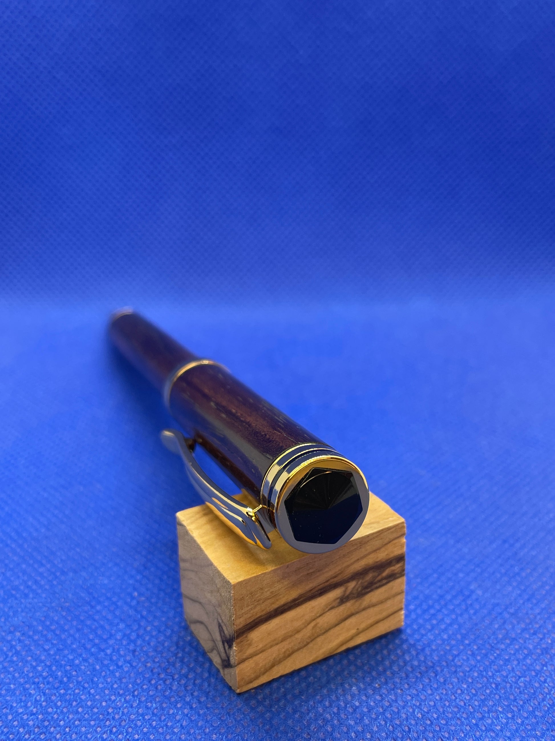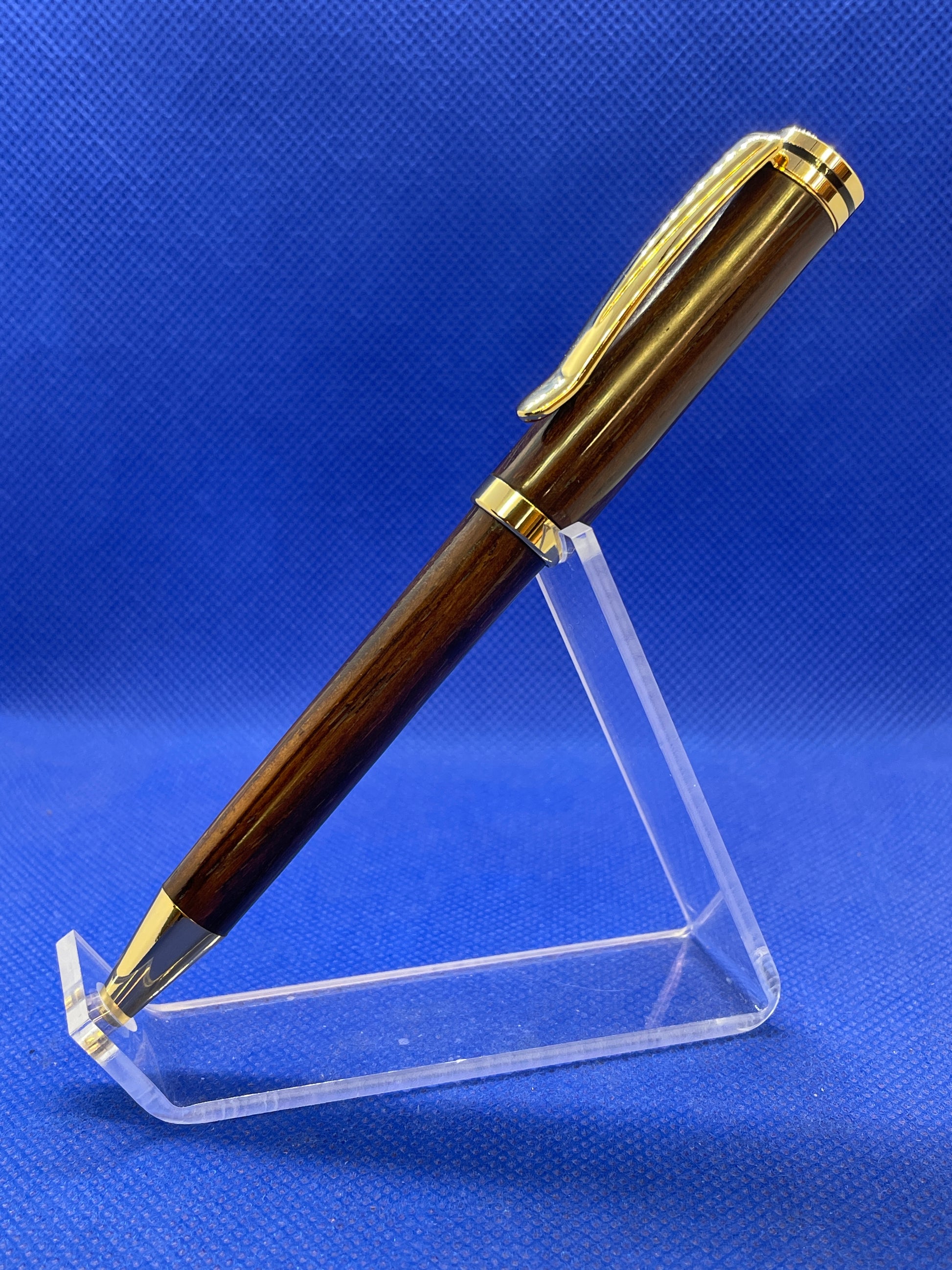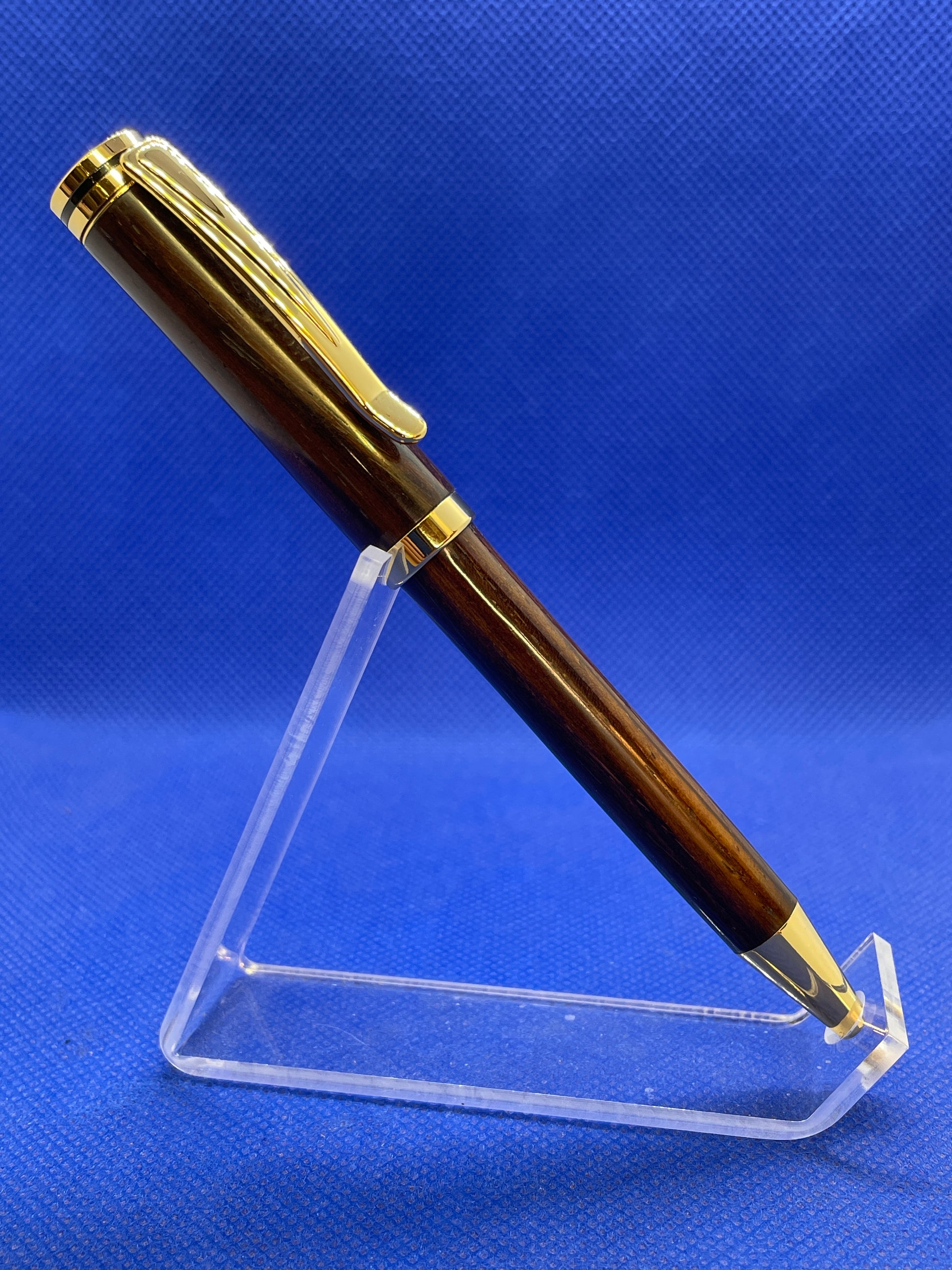 This Marquis ballpoint pen features gold and black chrome trim and a dark Cocobolo wood body. The metalwork on this pen is a 3U gold plating, which is a thicker, more durable plating than 10K or 24K gold. It uses standard "Parker" style refills.