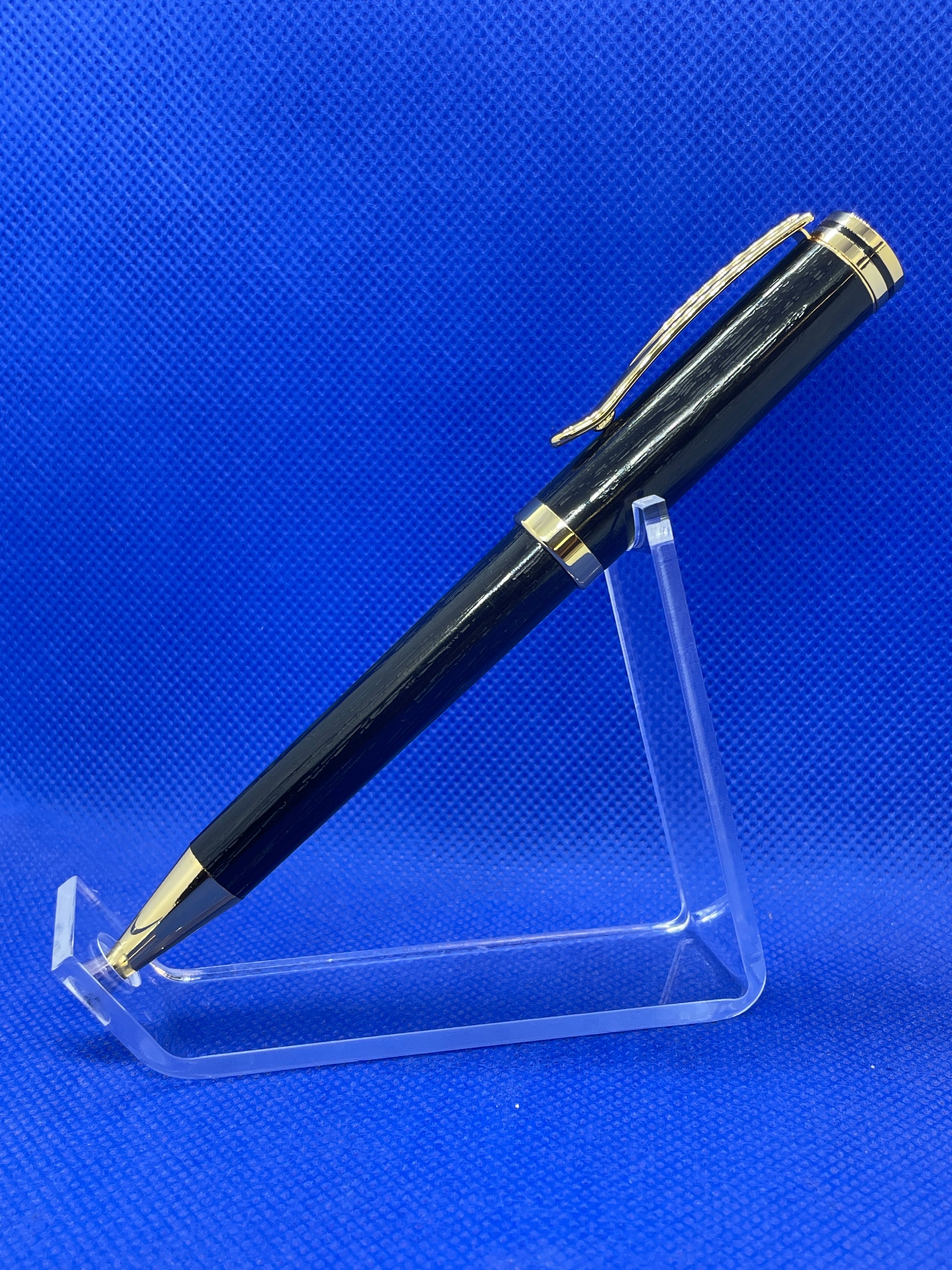 This Marquis ballpoint pen features gold and black chrome trim and a 5500 year old Ukrainian Bog Oak wood body. The metalwork on this pen is a 3U gold plating, which is a thicker, more durable plating than 10K or 24K gold. It uses standard "Parker" style refills.