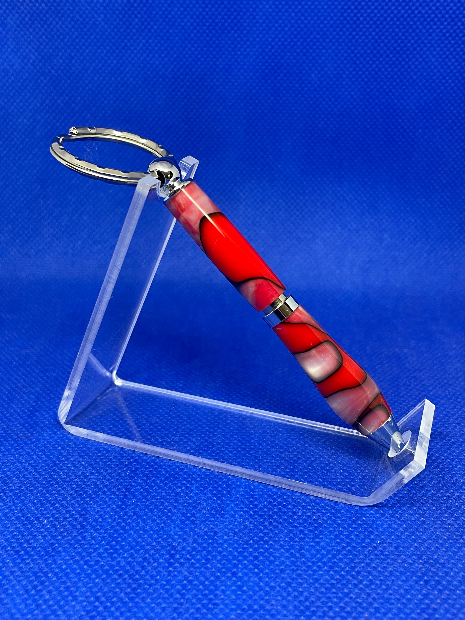 This Keychain ballpoint pen features chrome trim and a red, silver, and black acrylic acetate body. Having a small pen on your keychain is incredibly handy and you'll be surprised at how often you use this little pen. It uses mini ballpoint pen refills.