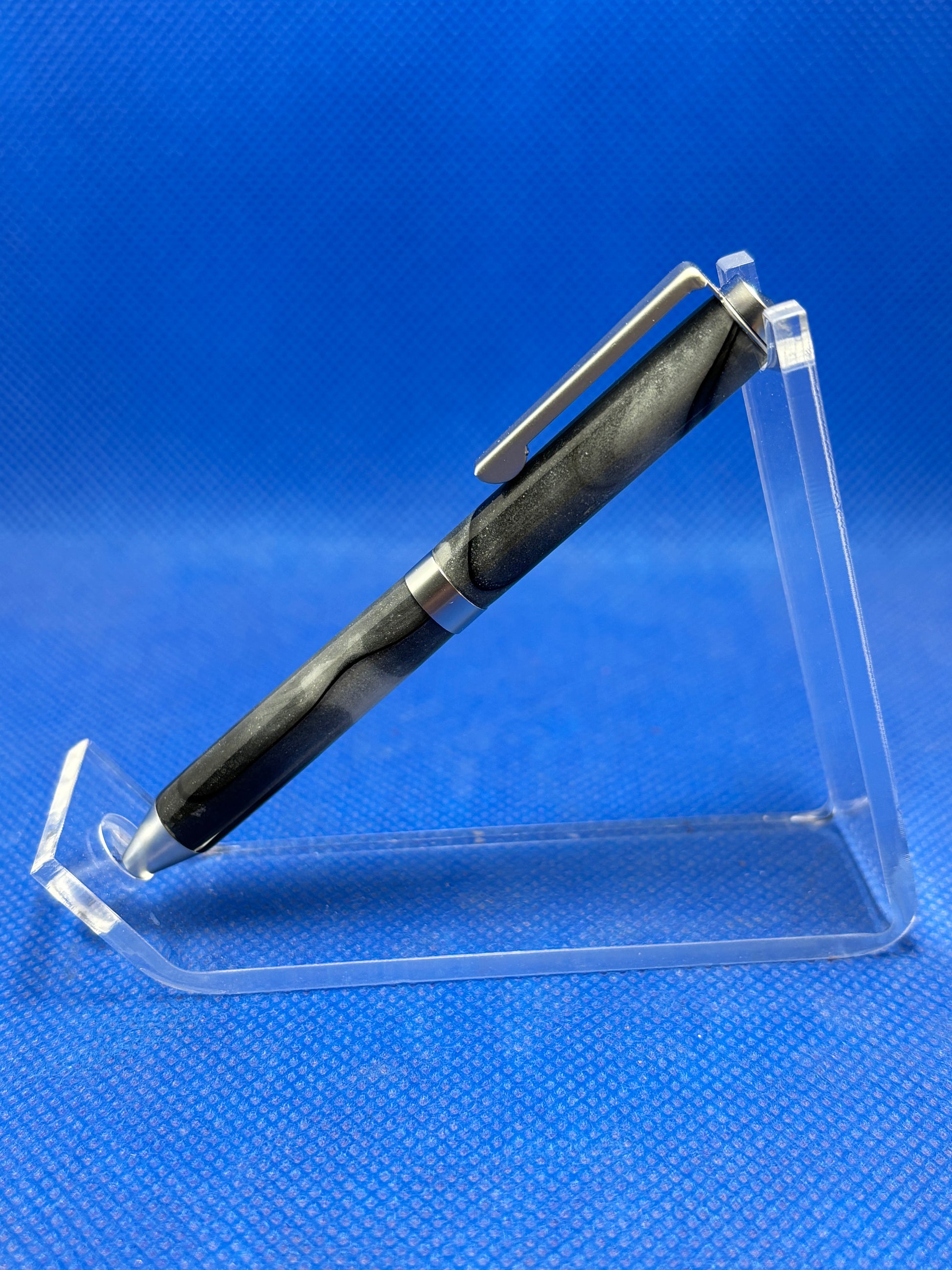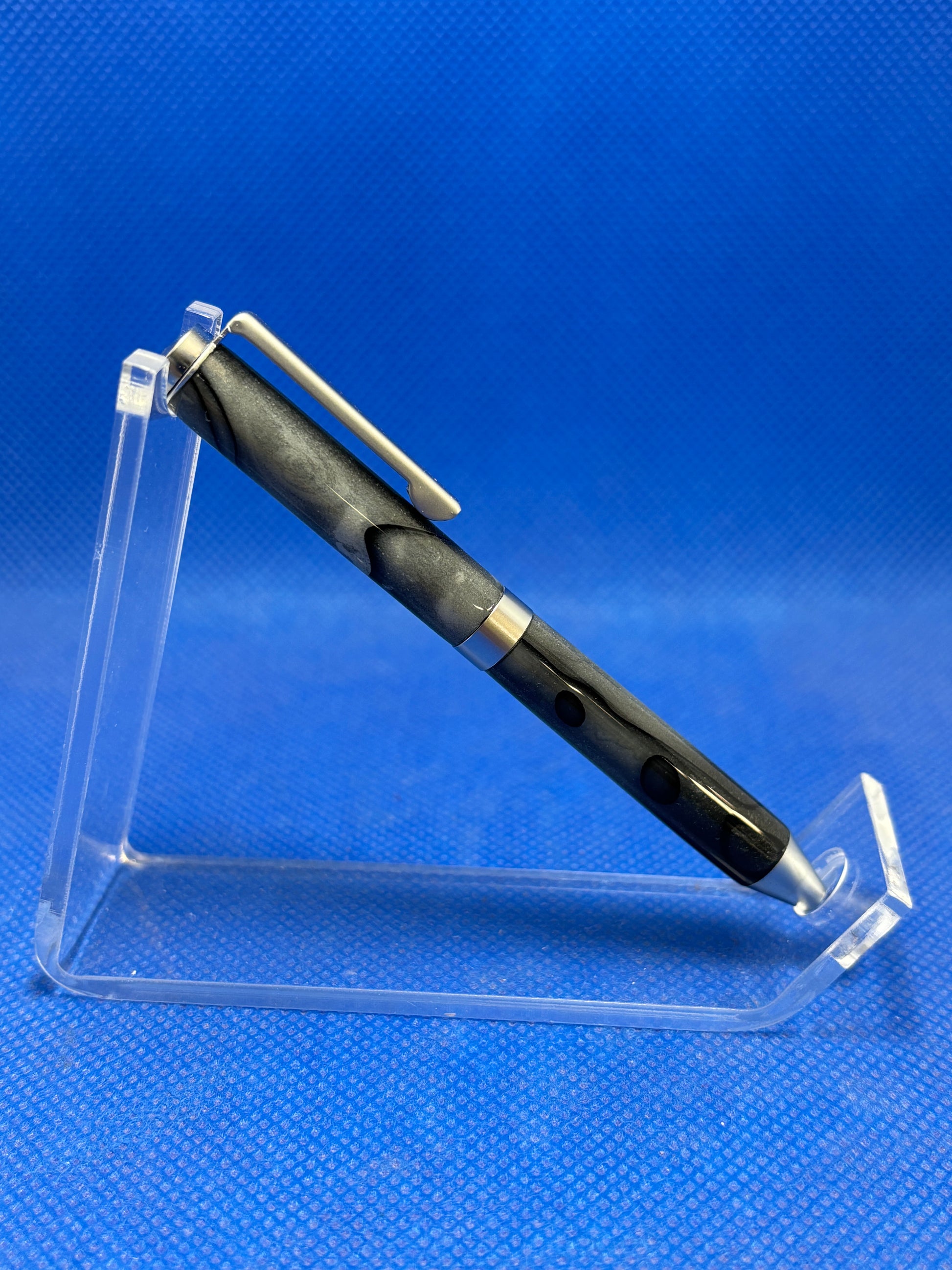 This mini twist pen features satin chrome trim with a body made of "Black and White Pearl" acrylic acetate. This pen is only 9cm (3.5") long and is perfect as a lightweight pocket or purse pen. It uses mini pen refills.