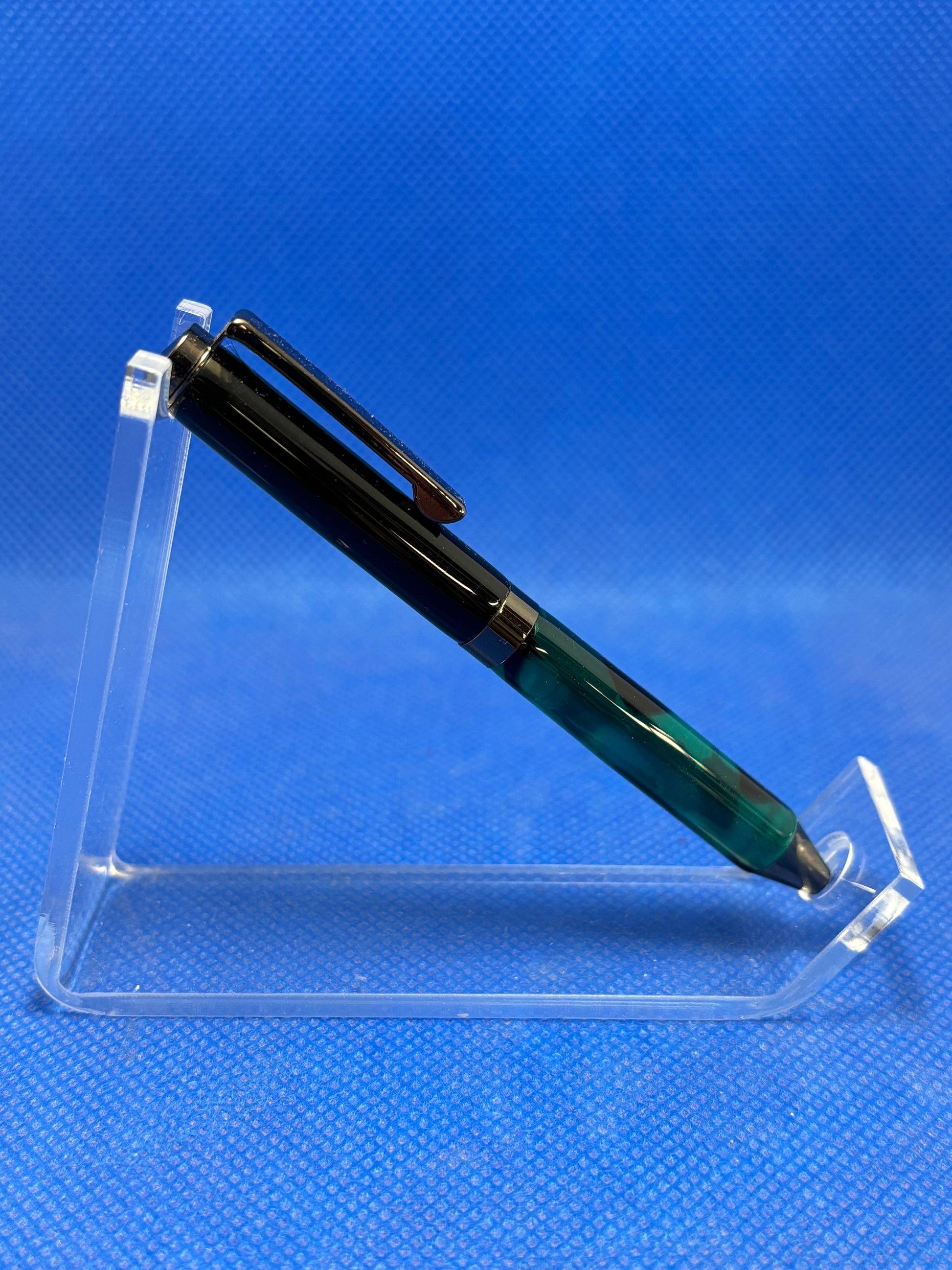 This mini twist pen features gun metal trim with a body made of "Balck Emerald and black acrylic. This pen is only 9cm (3.5") long and is perfect as a lightweight pocket or purse pen. It uses mini pen refills.