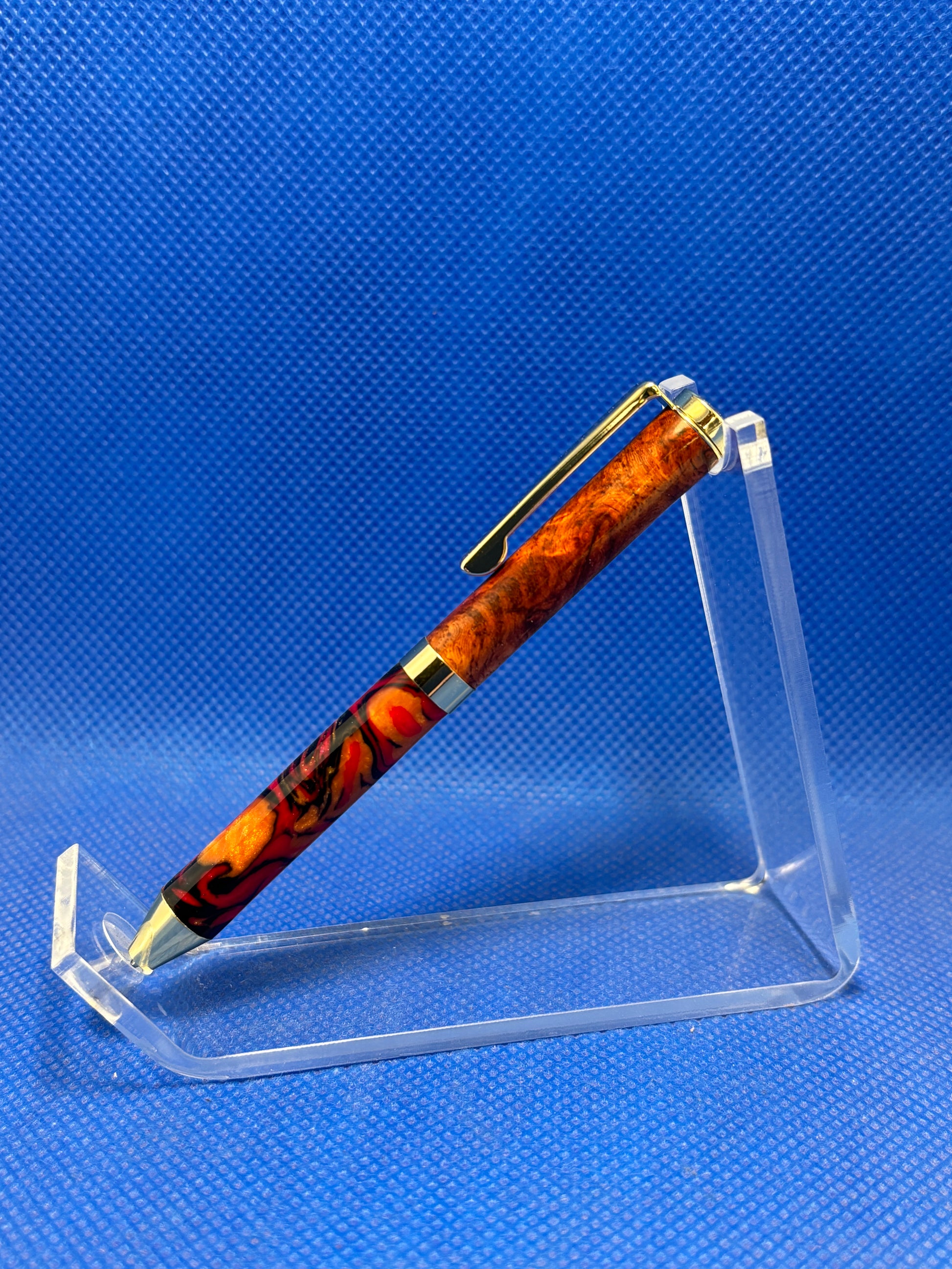 This mini twist pen features gold trim with a body made of Pearlux "Banshee" resin and Amboyna burl. This pen is only 9cm (3.5") long and is perfect as a lightweight pocket or purse pen. It uses mini pen refills.