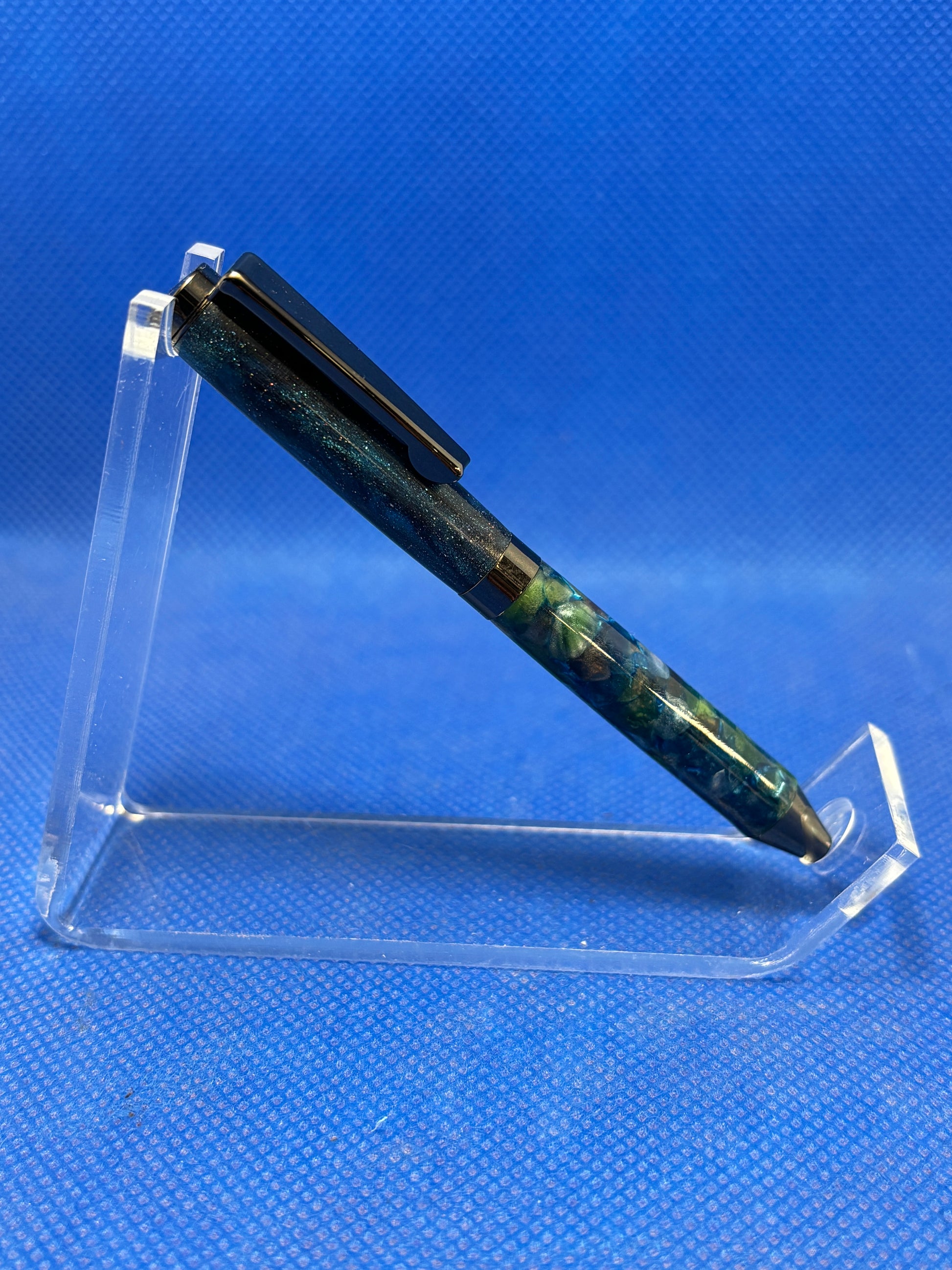 This mini twist pen features gun metal trim with a "Galaxy and Blue Crush" resin body. This pen is only 9cm (3.5") long and is perfect as a lightweight pocket or purse pen. It uses mini pen refills.