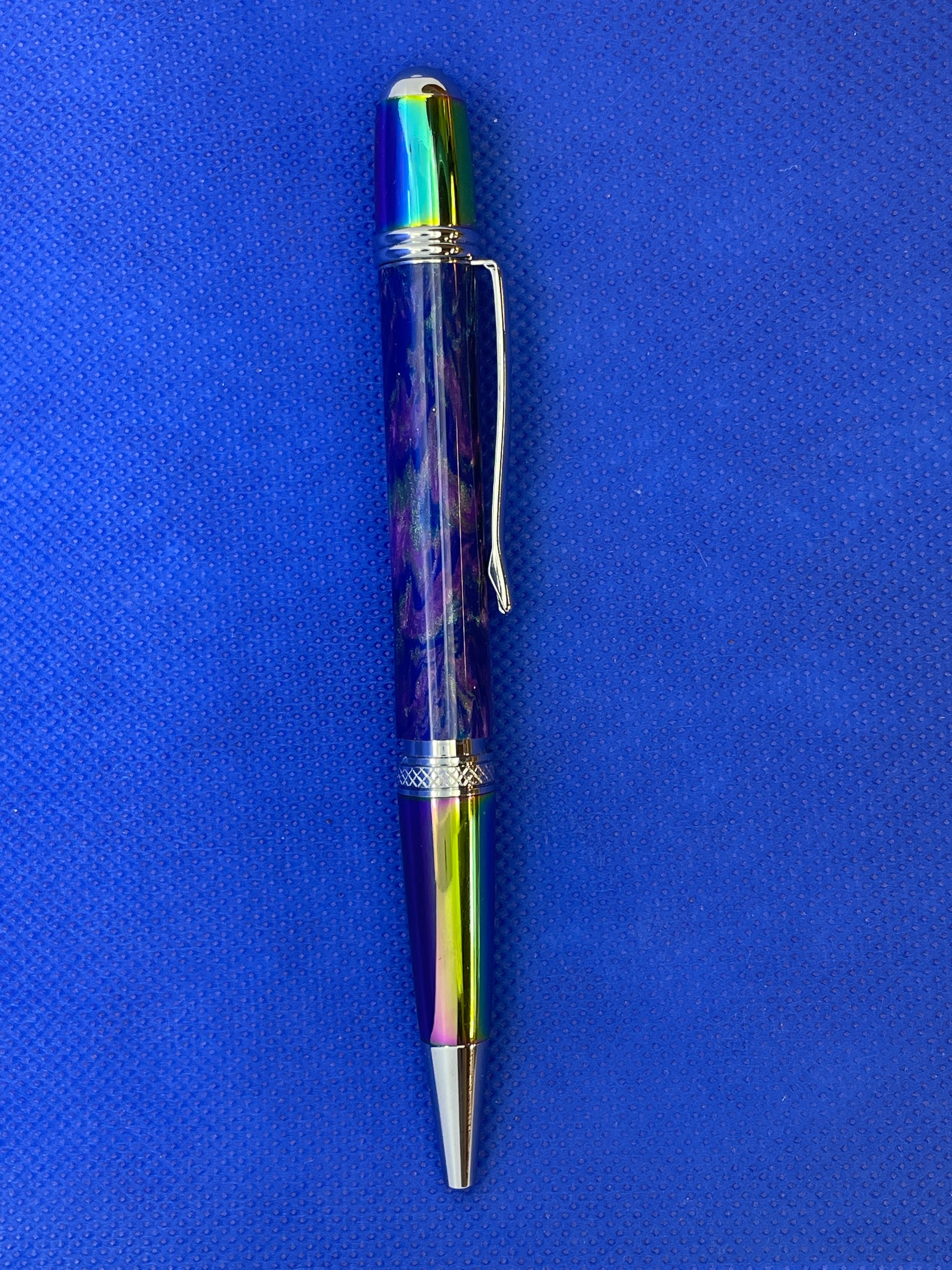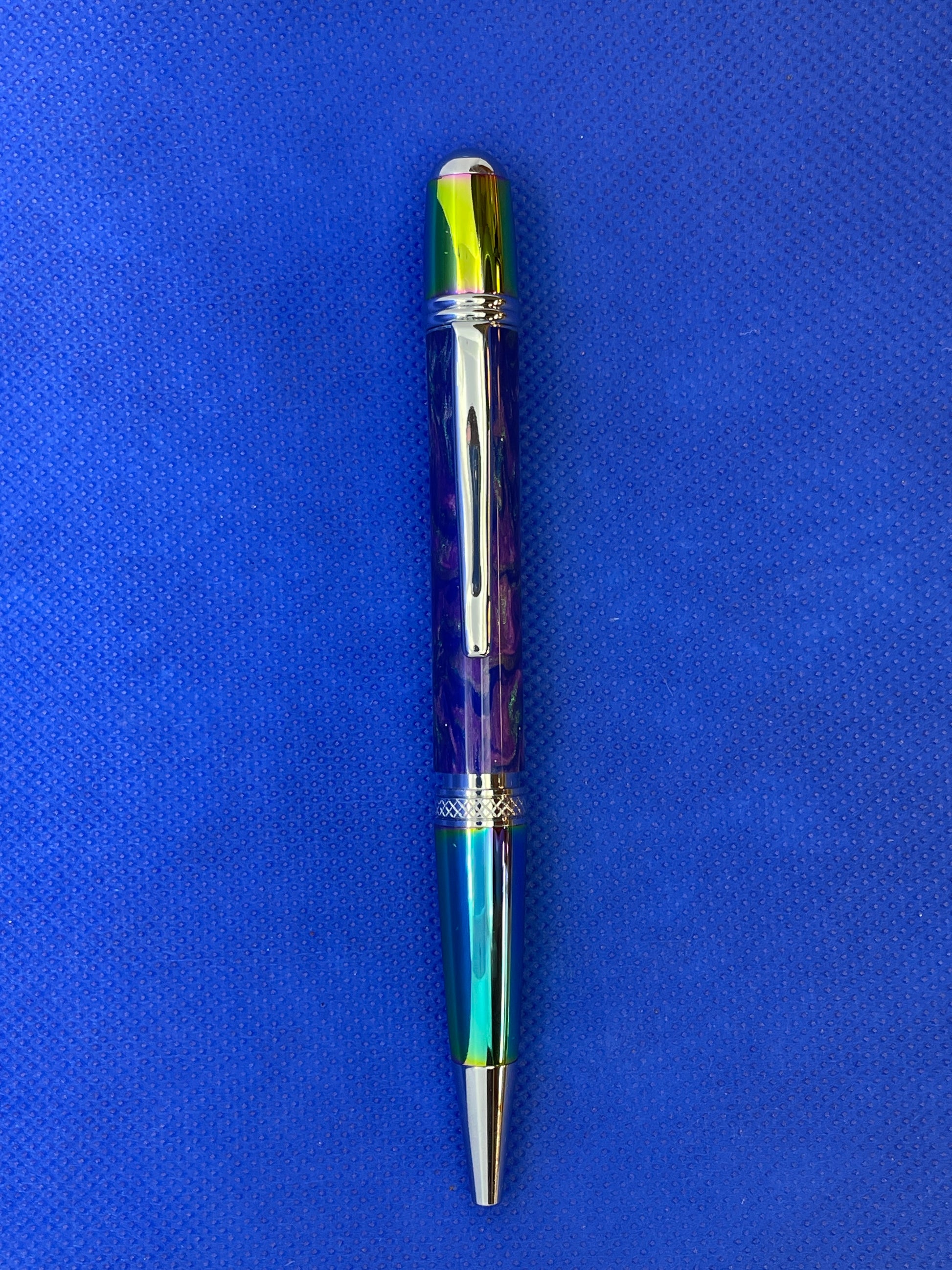This stunning Monarch ballpoint pen features chrome and multi-coloured Aura and chrome trim with a "Rainbow" resin body. It uses standard Parker style refills.